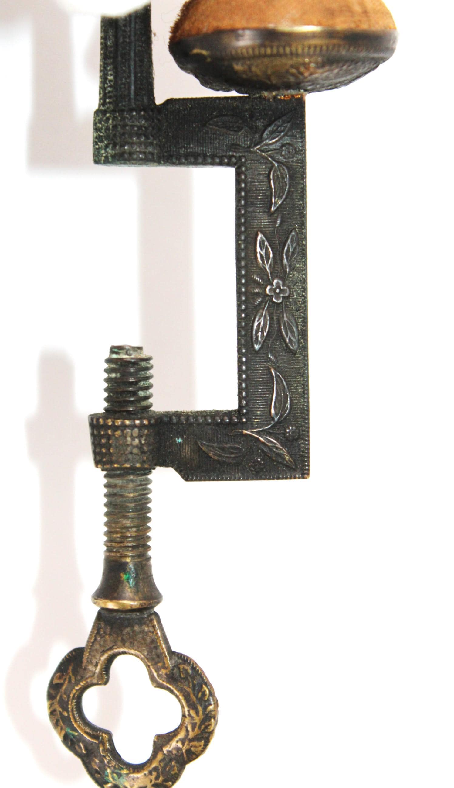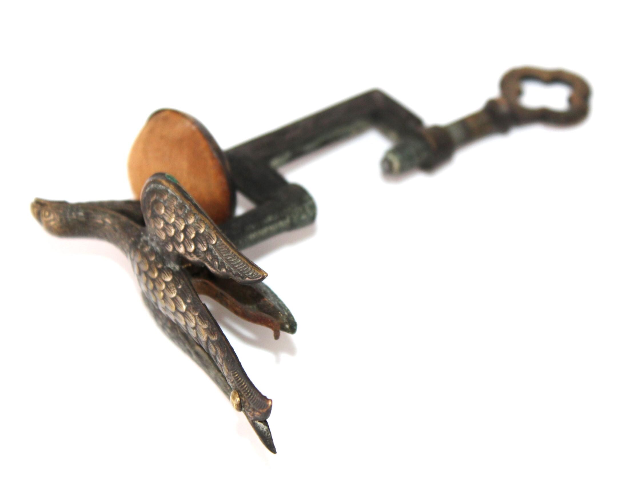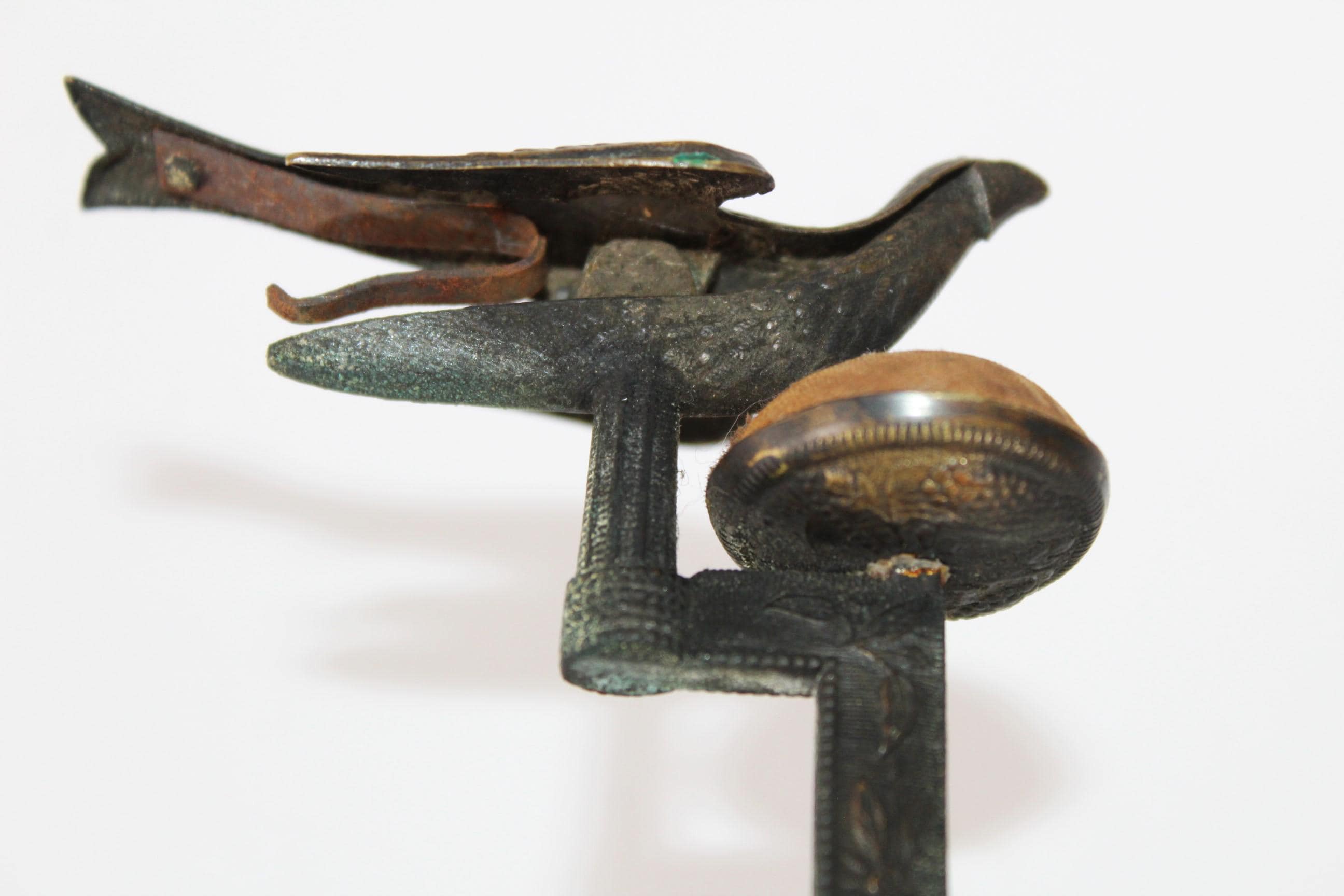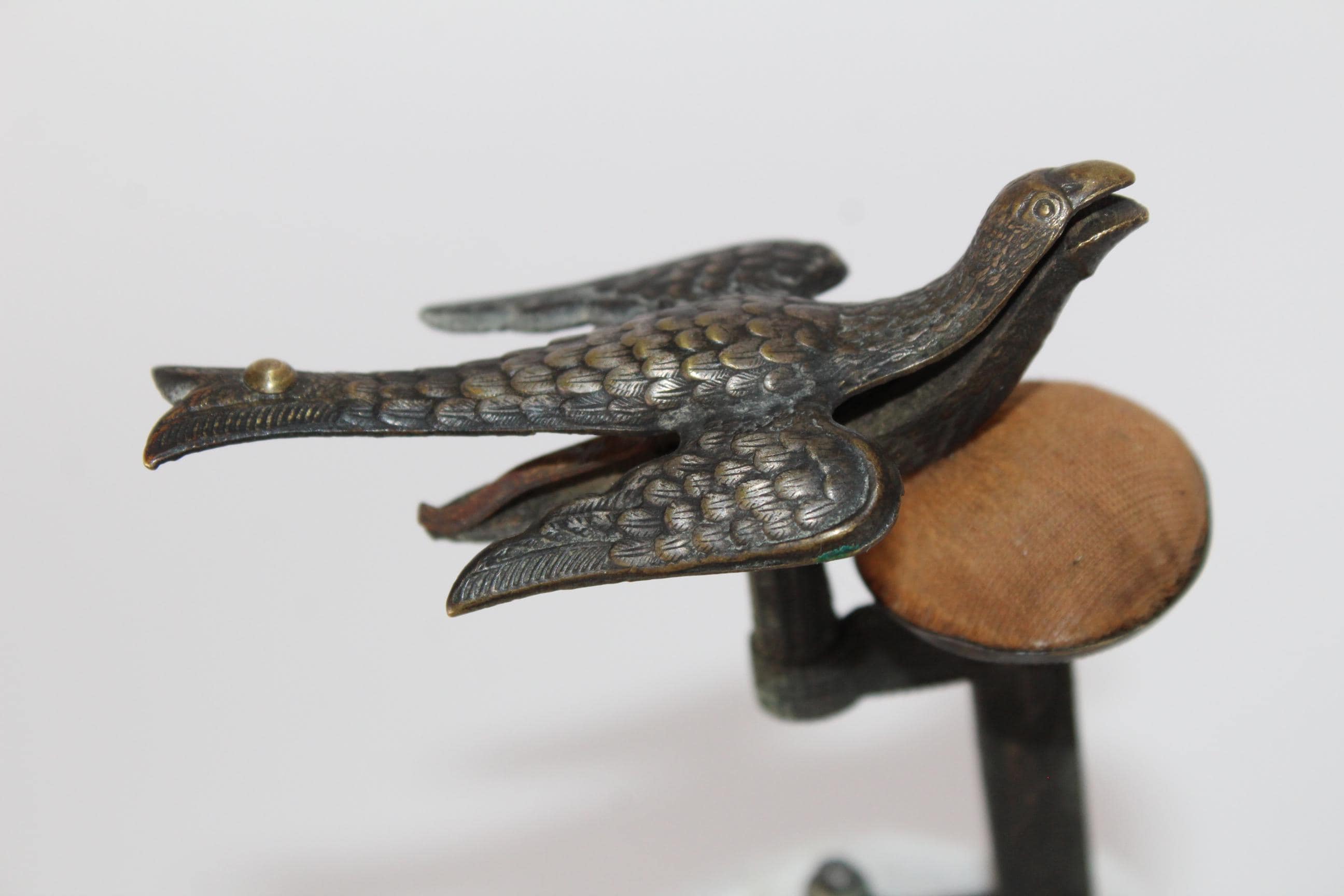 wonderful find, this antique sewing bird pin cushion that clamps onto the edge of a table or work surface. Made of brass, the bird itself measures approximately 3" long, 1½” wide, and 1¼” tall. Overall height is approximately 5” tall.