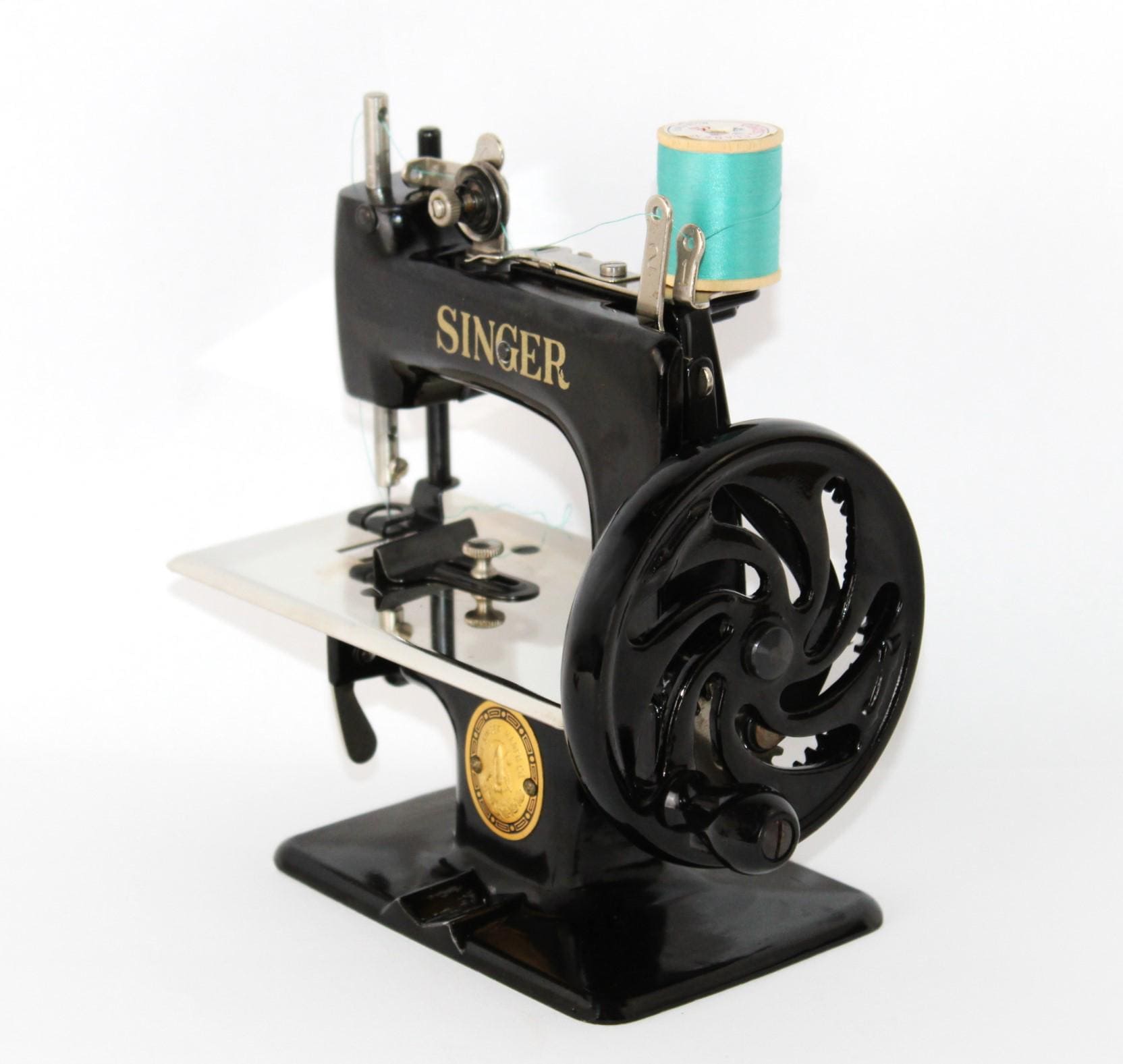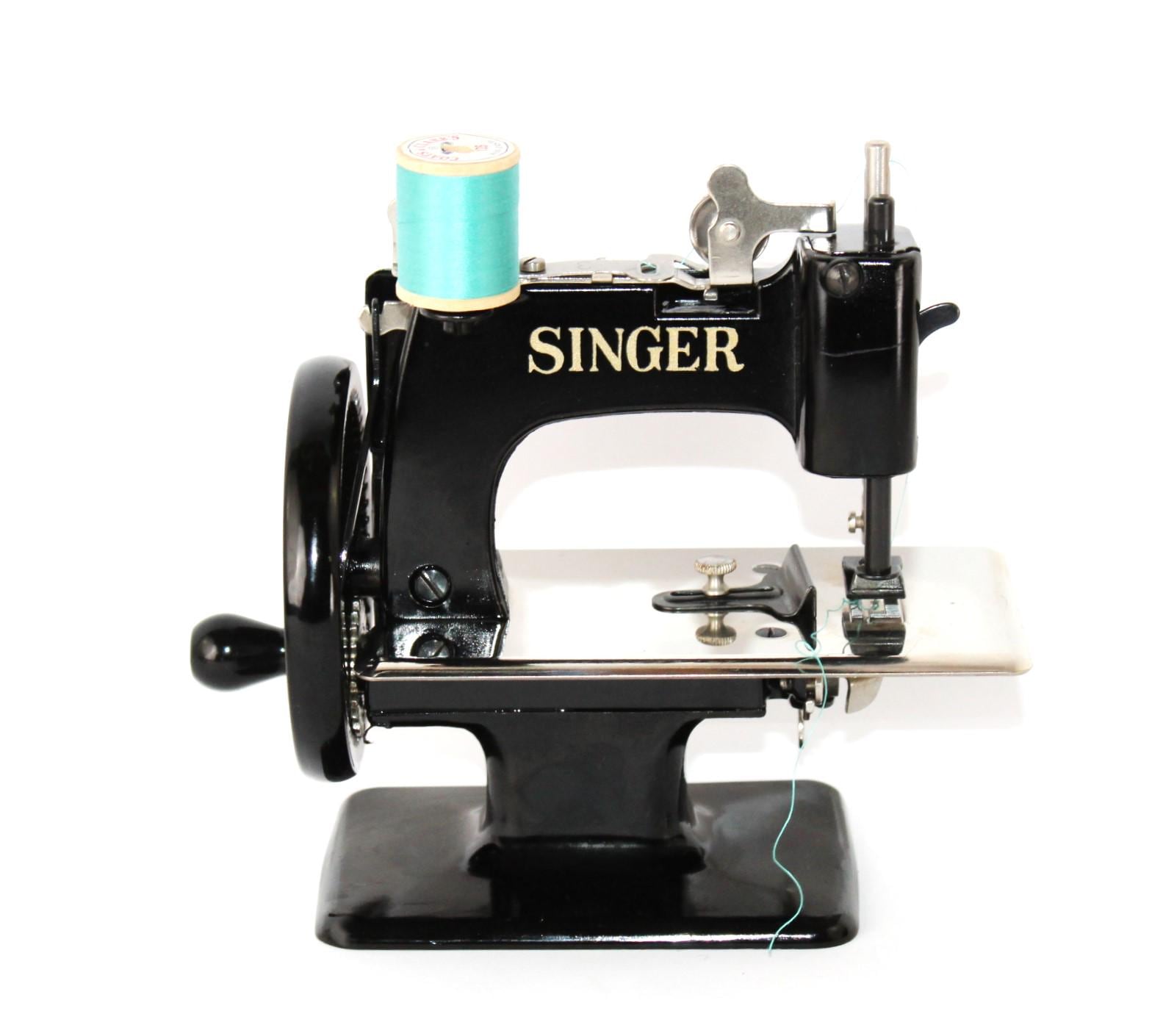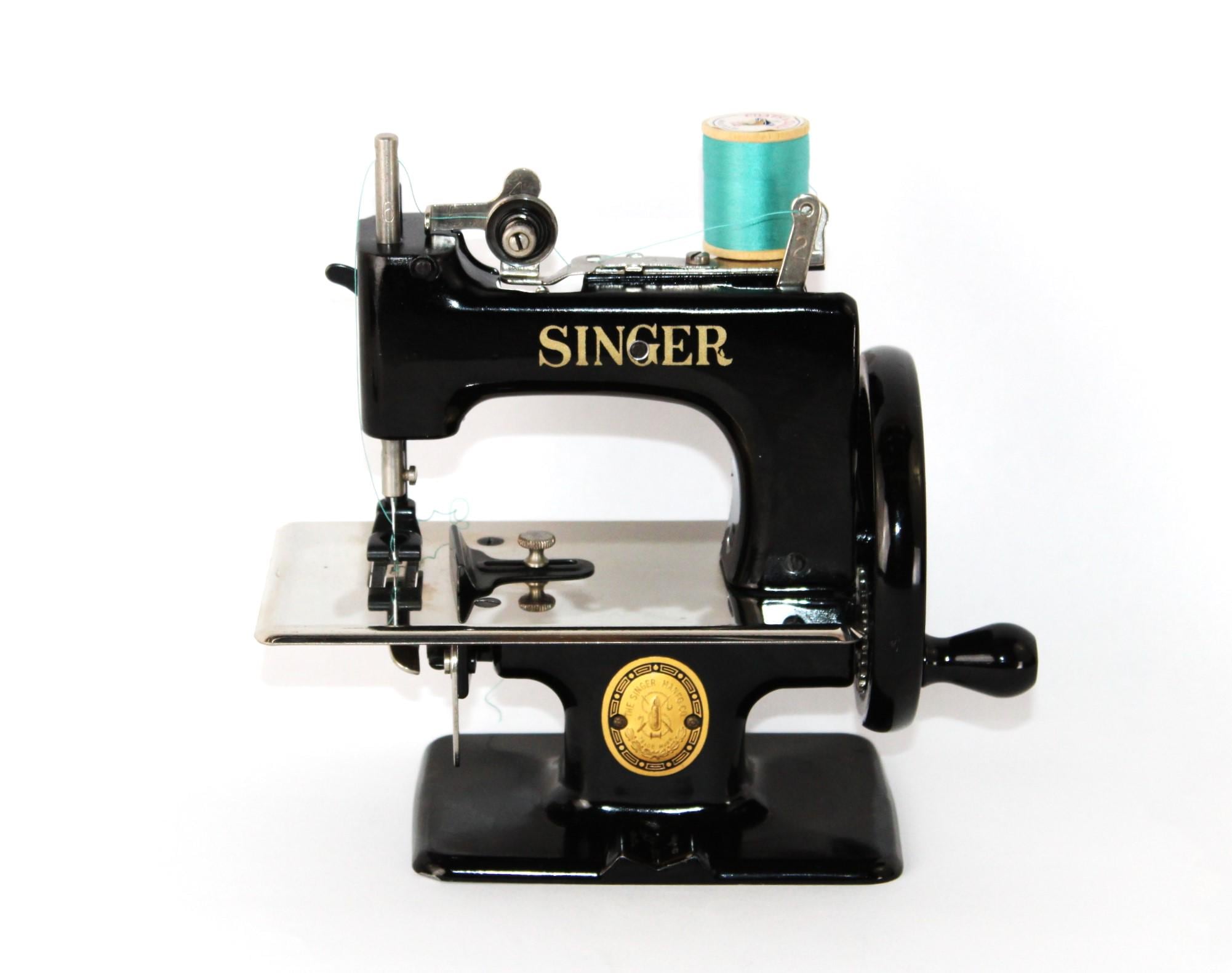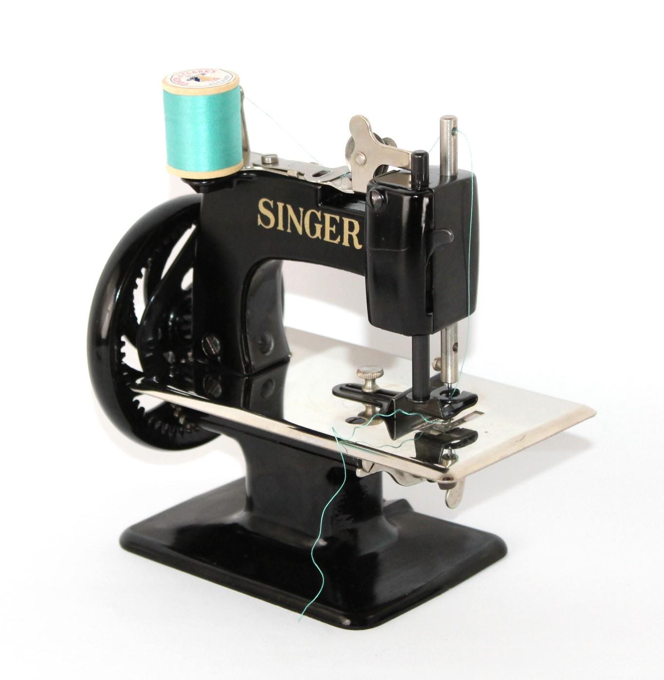 A wonderful child-sized sewing machine, made by Singer Manufacturing Company and manufactured in the USA. This is a fully Functional hand-crank sewing Machine in toy size. Originally patented in 1910 and manufactured until 1975, these were known as the most popular toy sewing machines ever made. This is the 1950s model, which has a thicker base column, although it still uses the same mechanics as its predecessor of 1910.