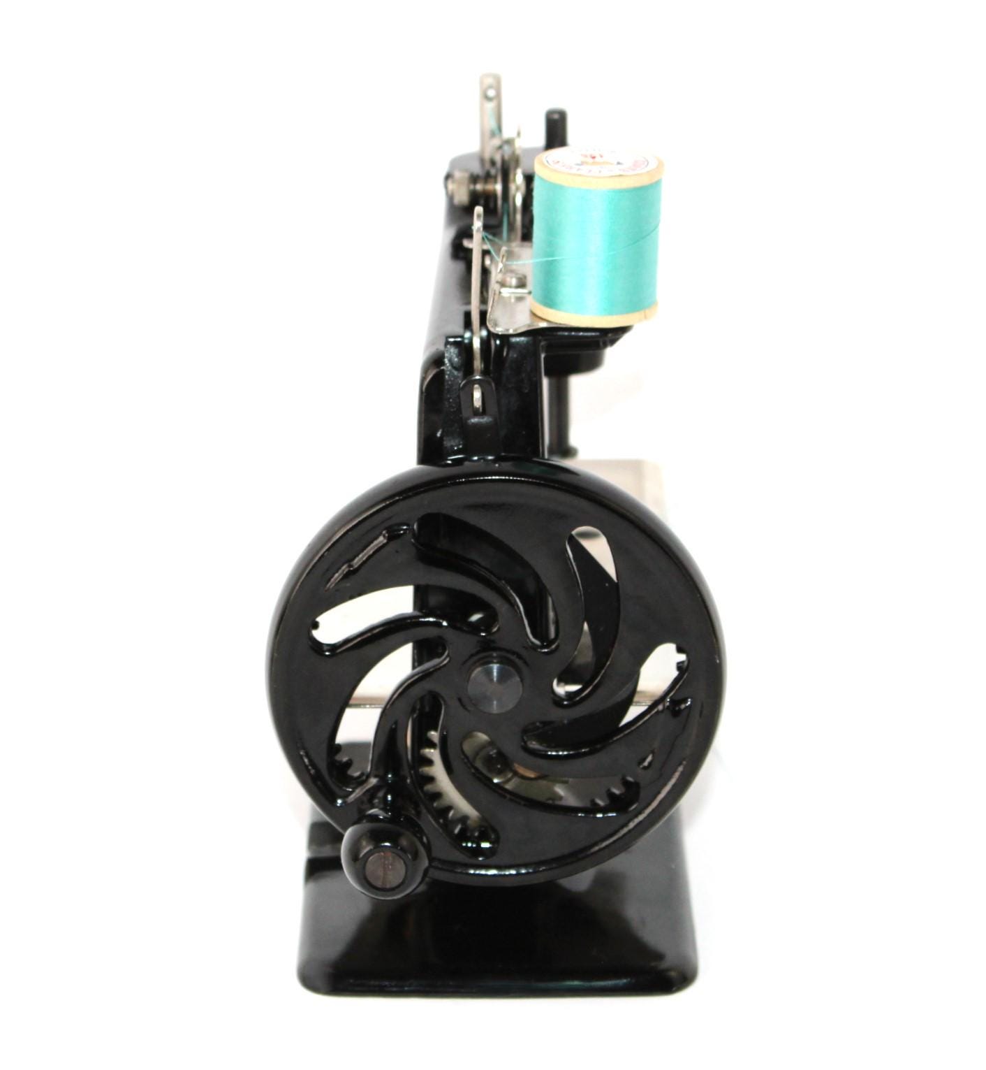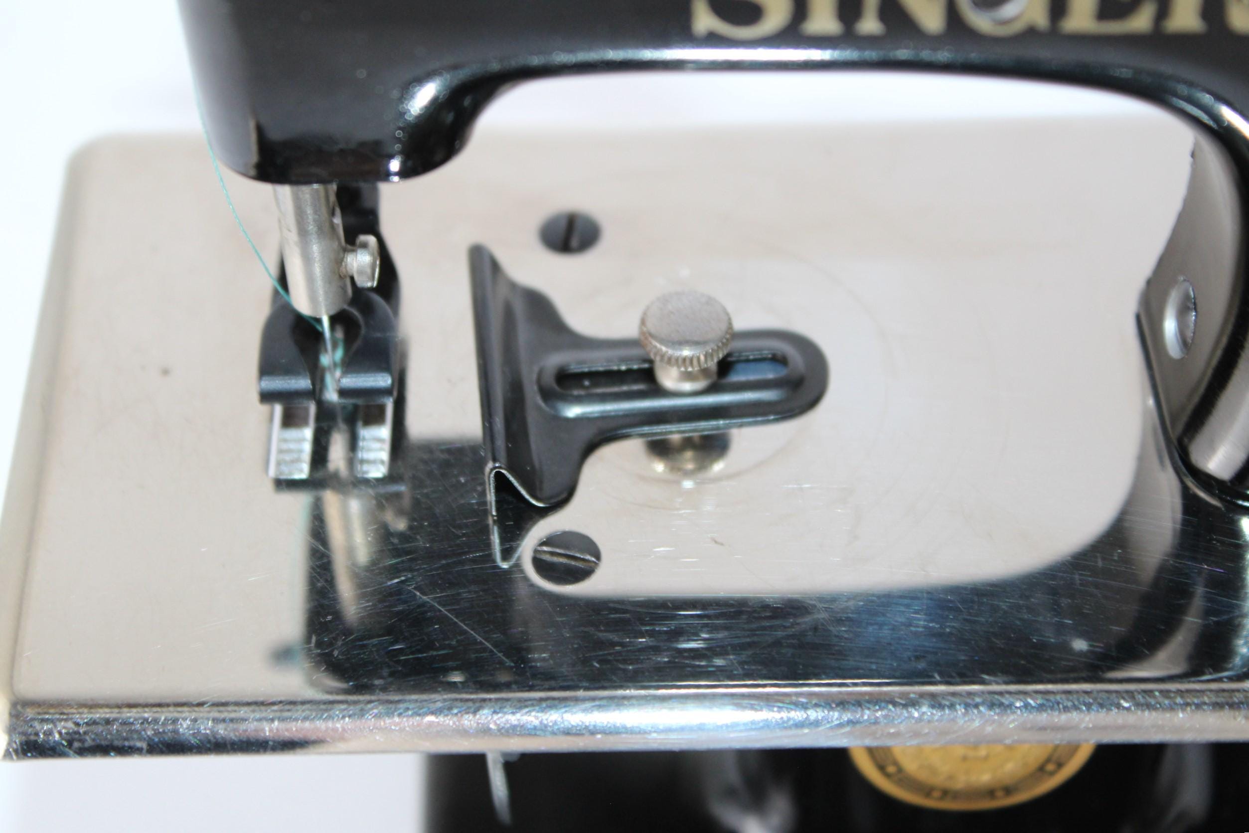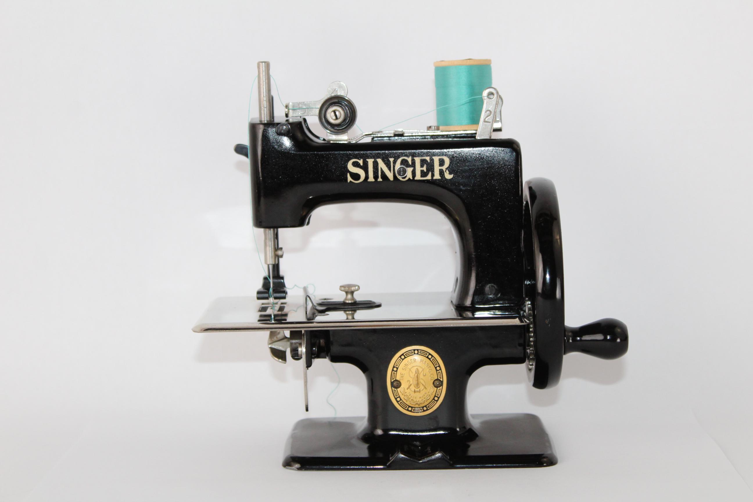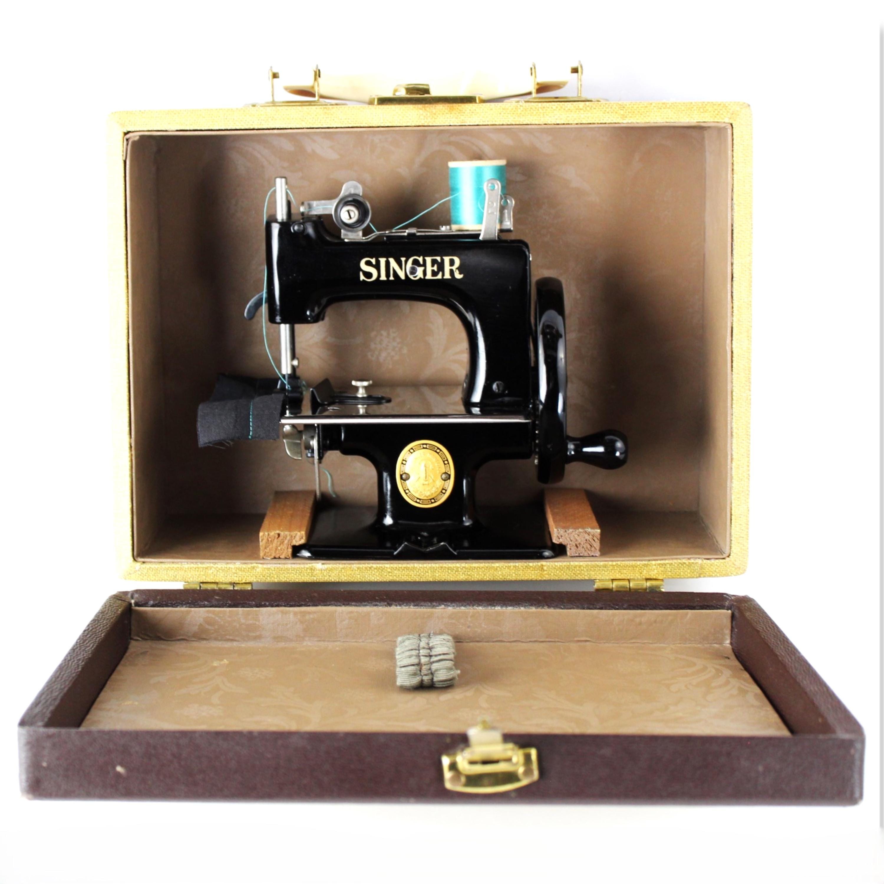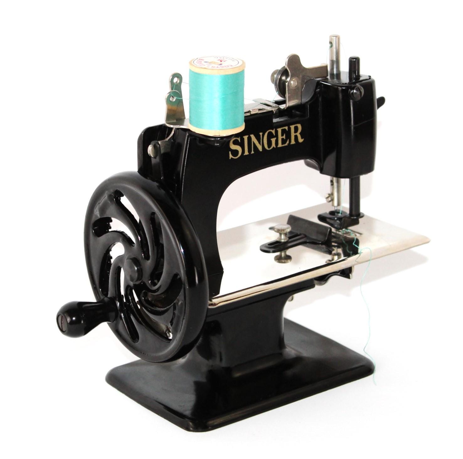 A wonderful child-sized sewing machine, made by Singer Manufacturing Company and manufactured in the USA. This is a fully Functional hand-crank sewing Machine in toy size. Originally patented in 1910 and manufactured until 1975, these were known as the most popular toy sewing machines ever made. This is the 1950s model, which has a thicker base column, although it still uses the same mechanics as its predecessor of 1910.