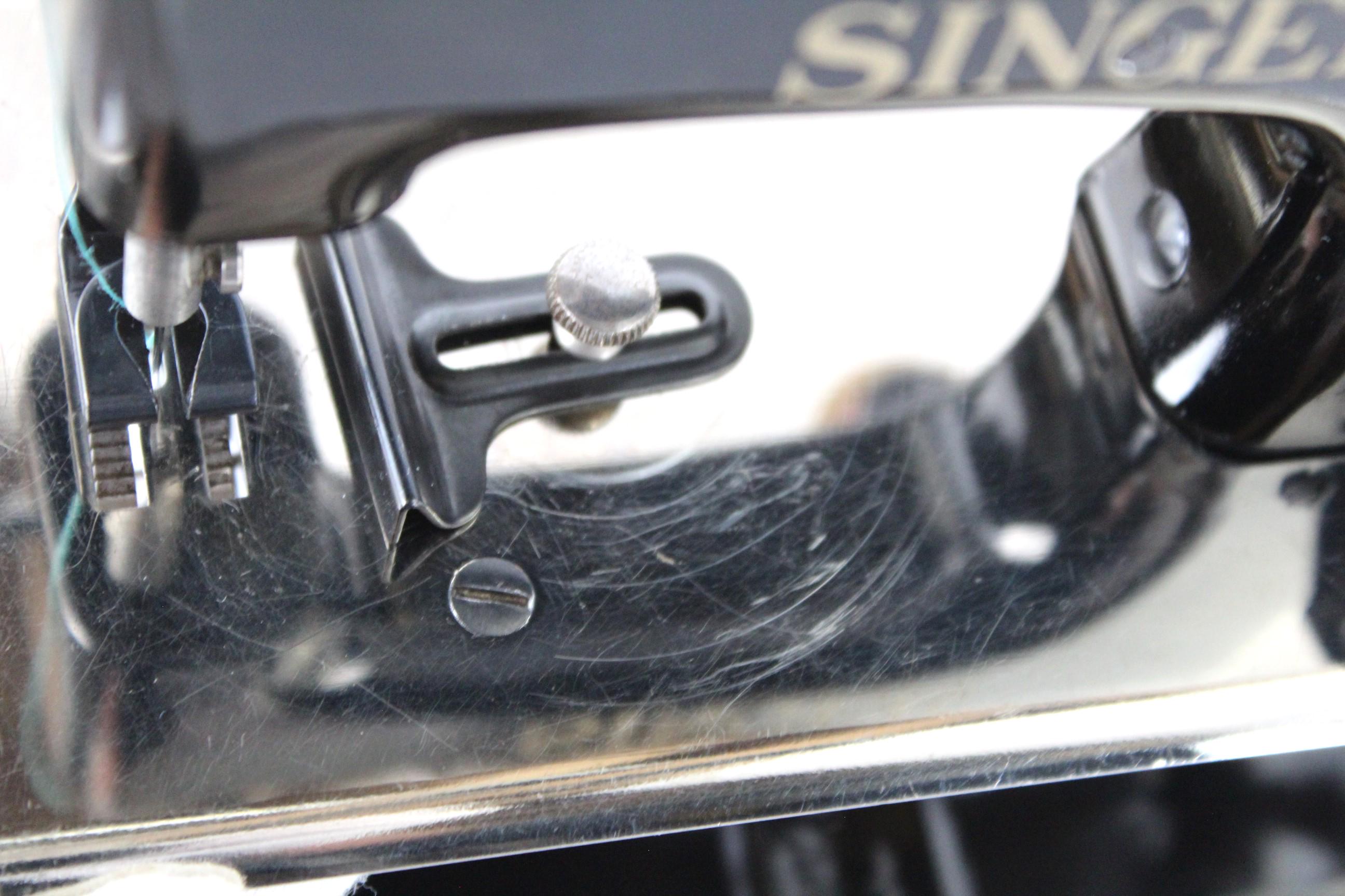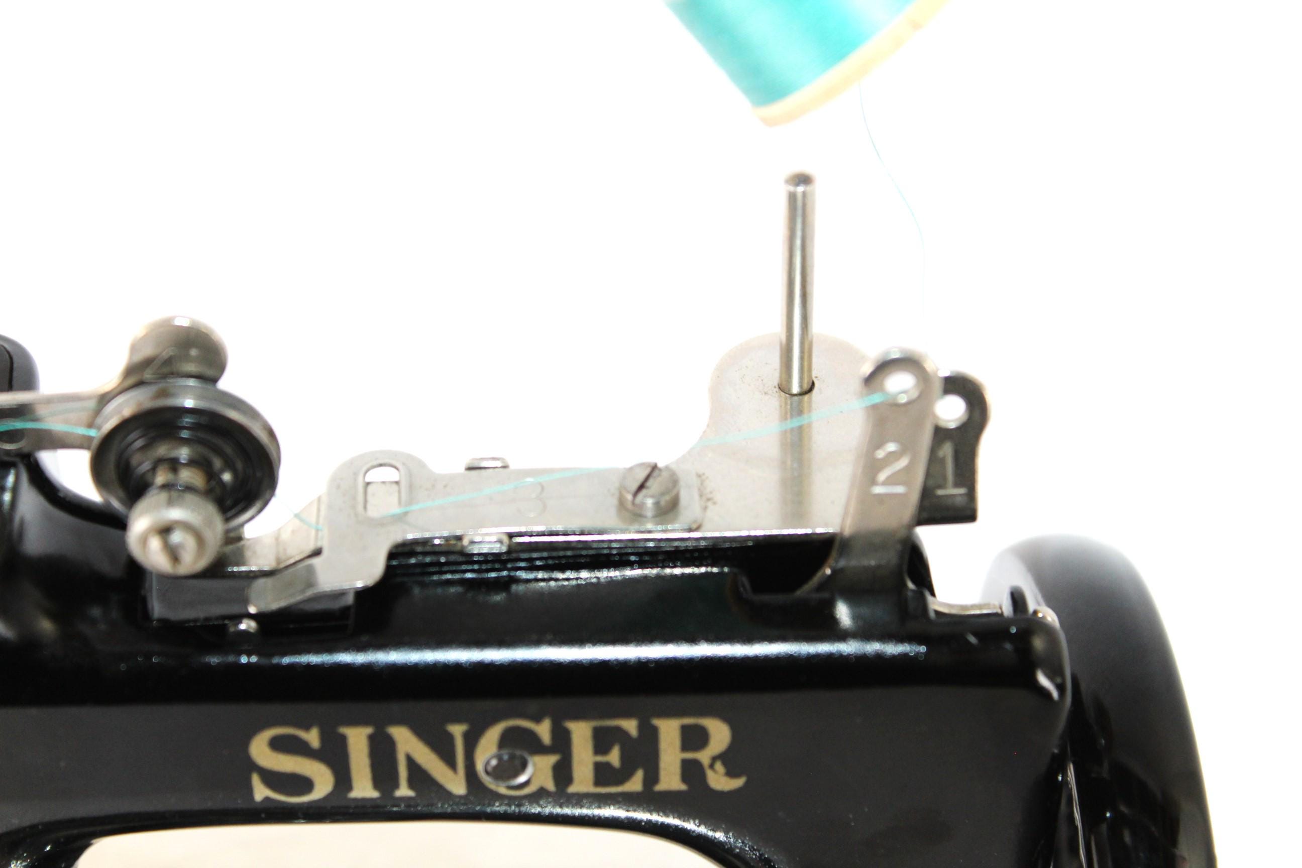 This machine is finished in the Singer classic black with gold trim. It operates smoothly. The thread running is simple on this machine, with all the parts numbered 1 through 5, and down to the needle to thread this little machine.