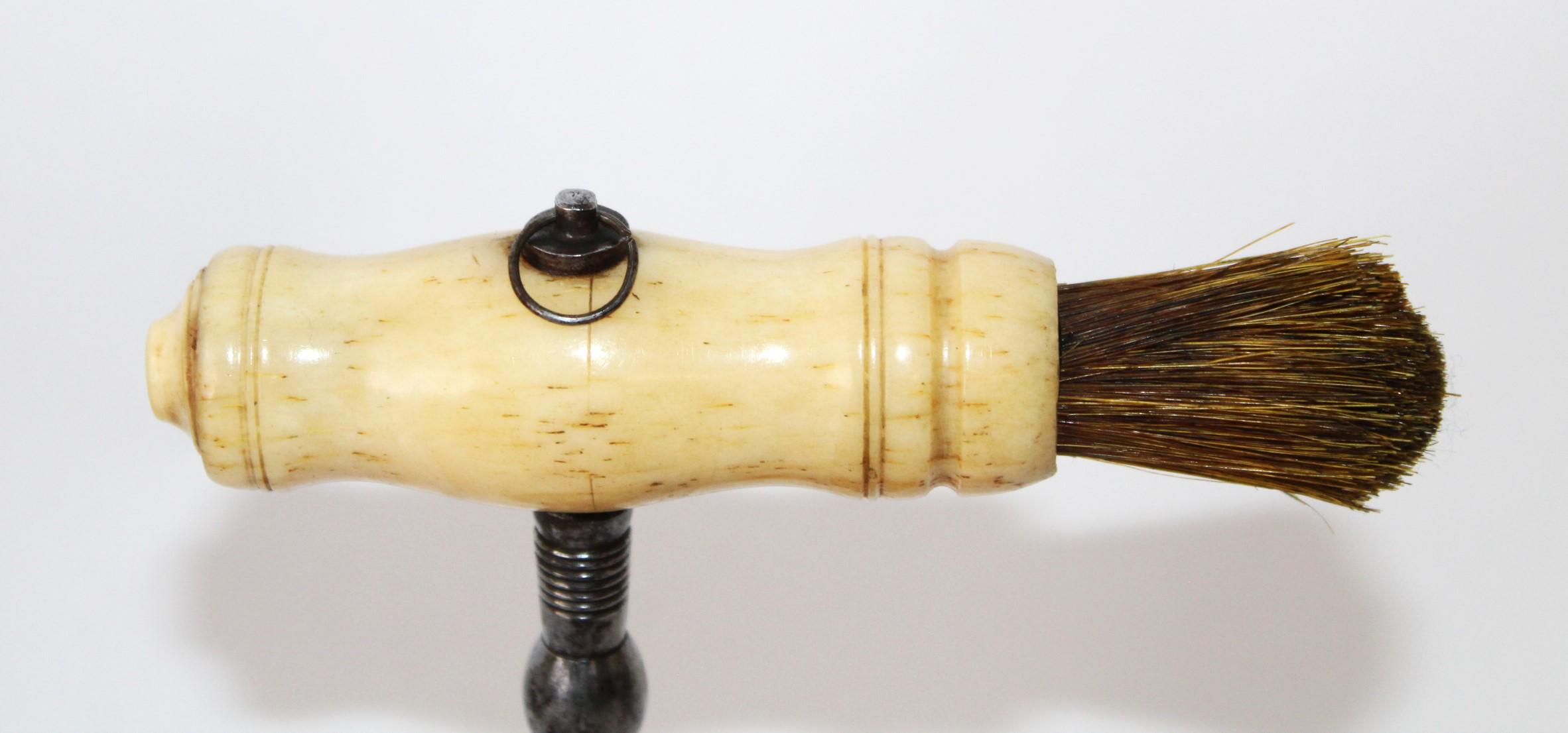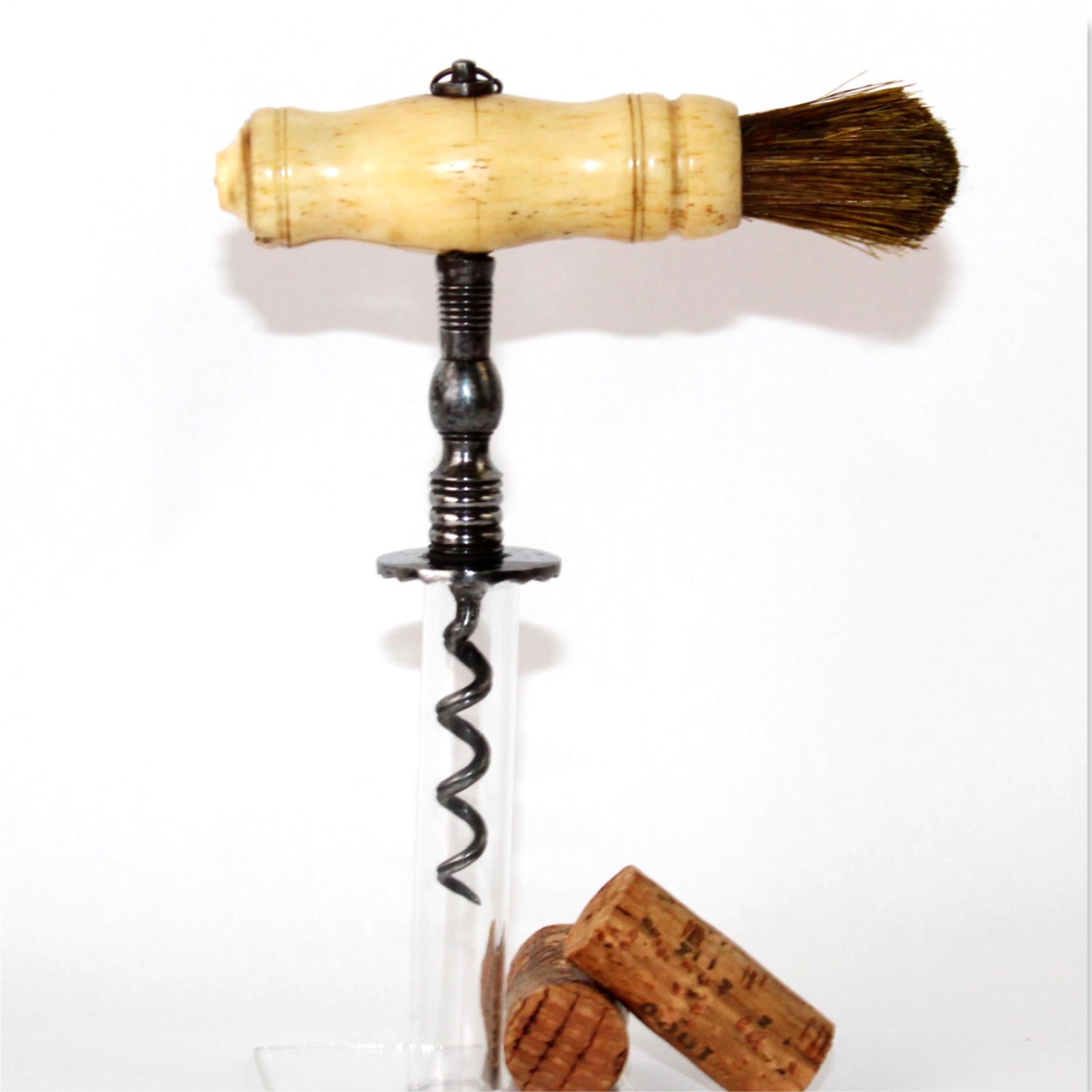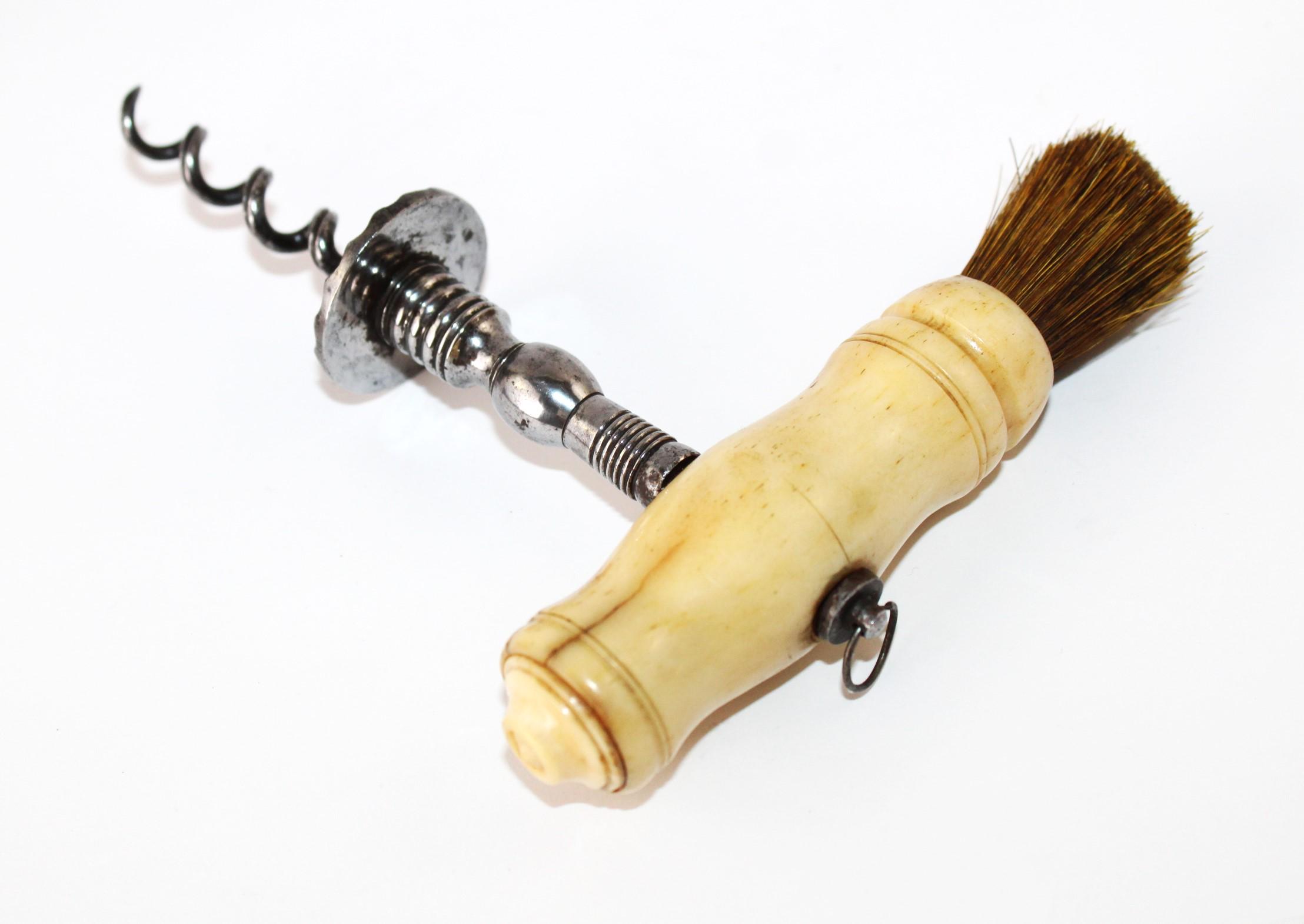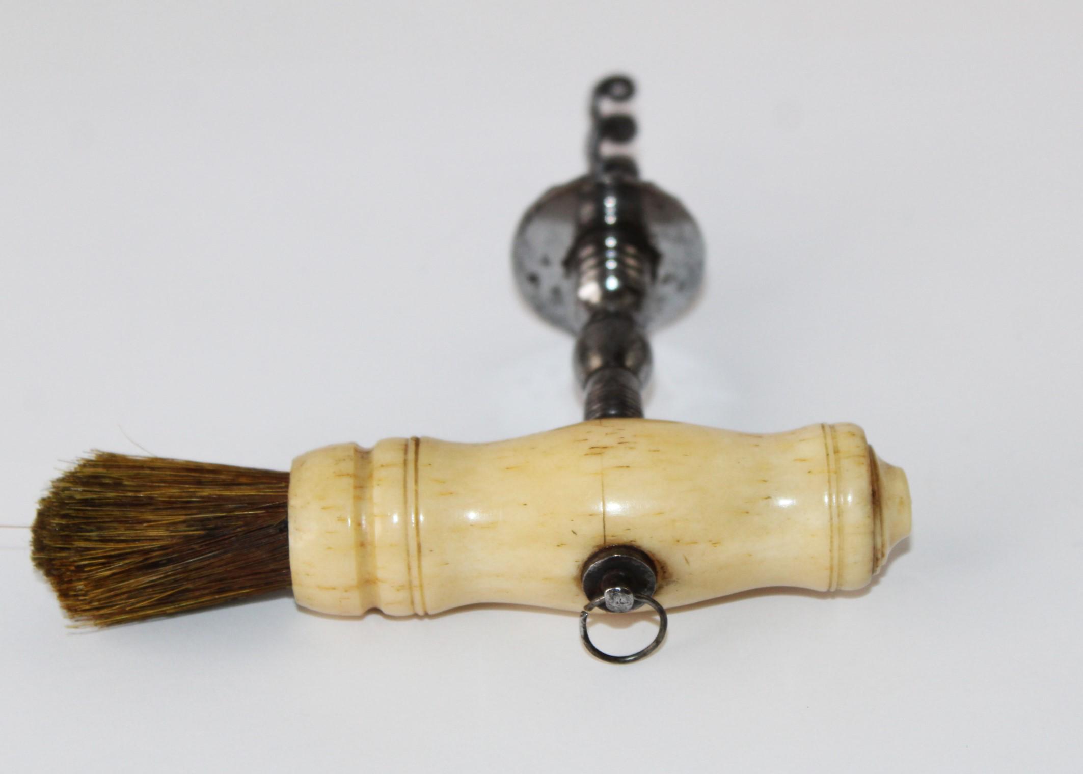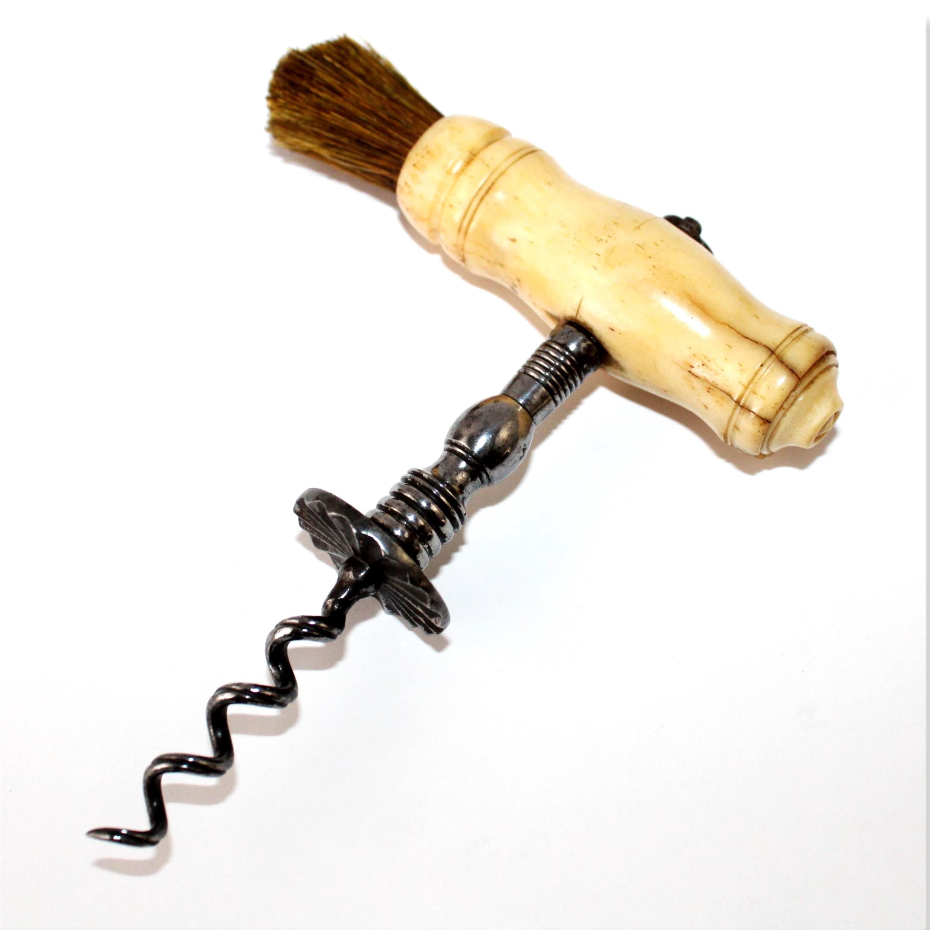 Antique 1850s Bovine Bone Handle Corkscrew with Easer and Horsehair Dusting Brush
