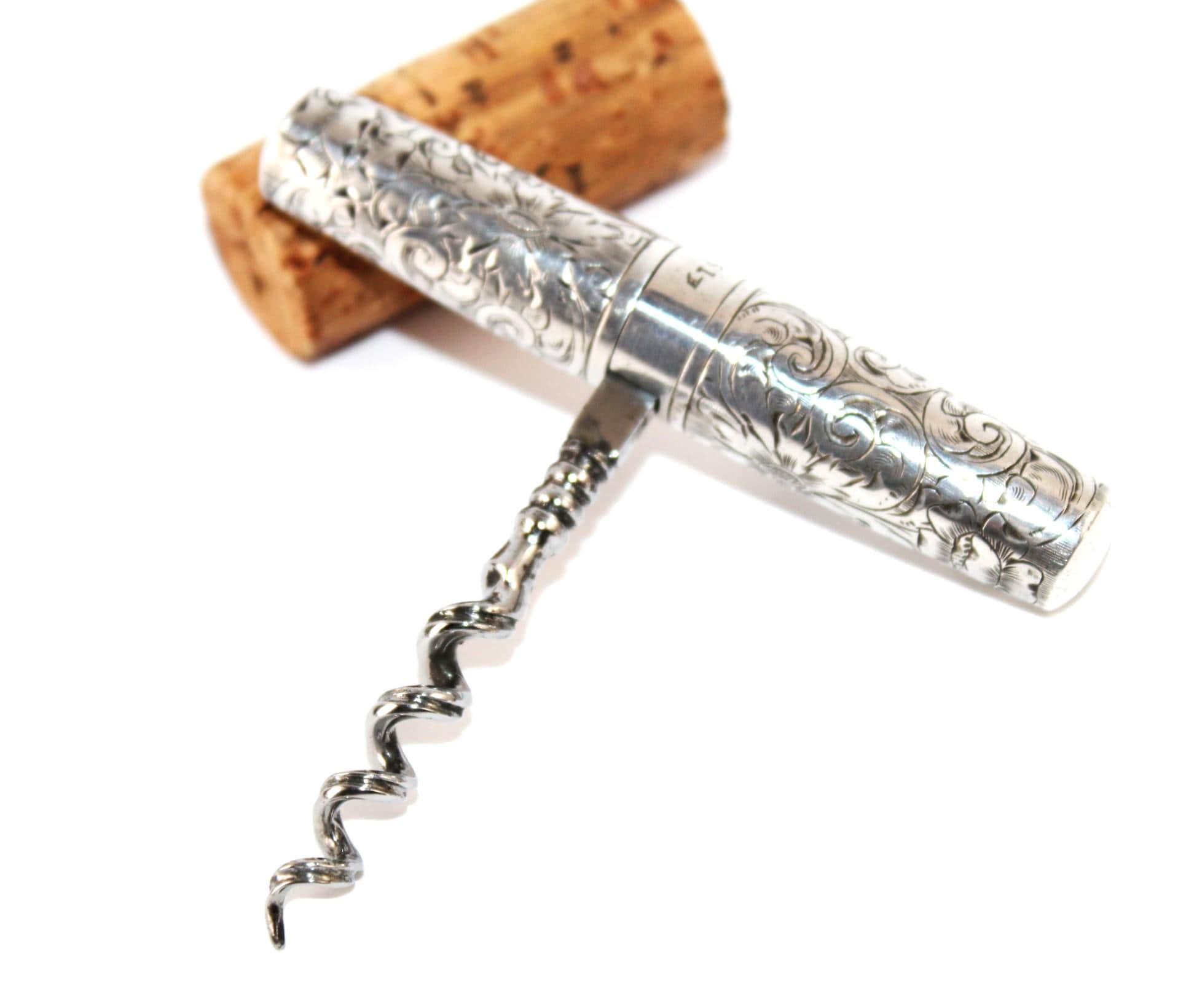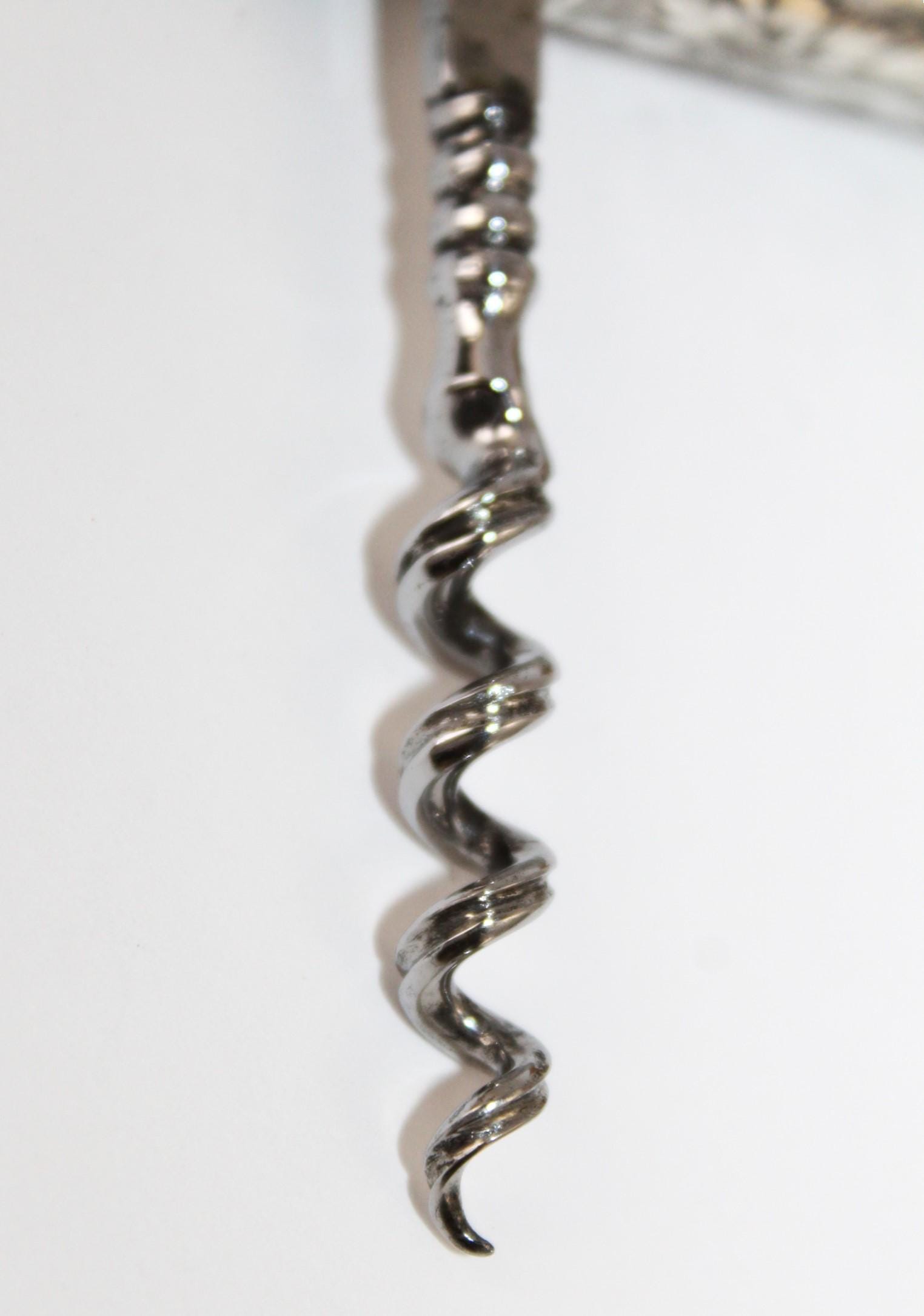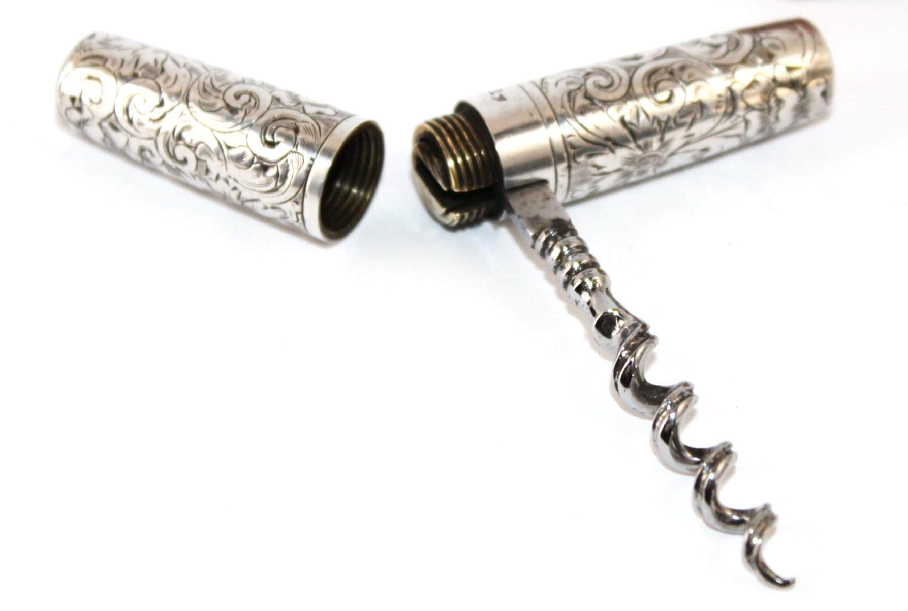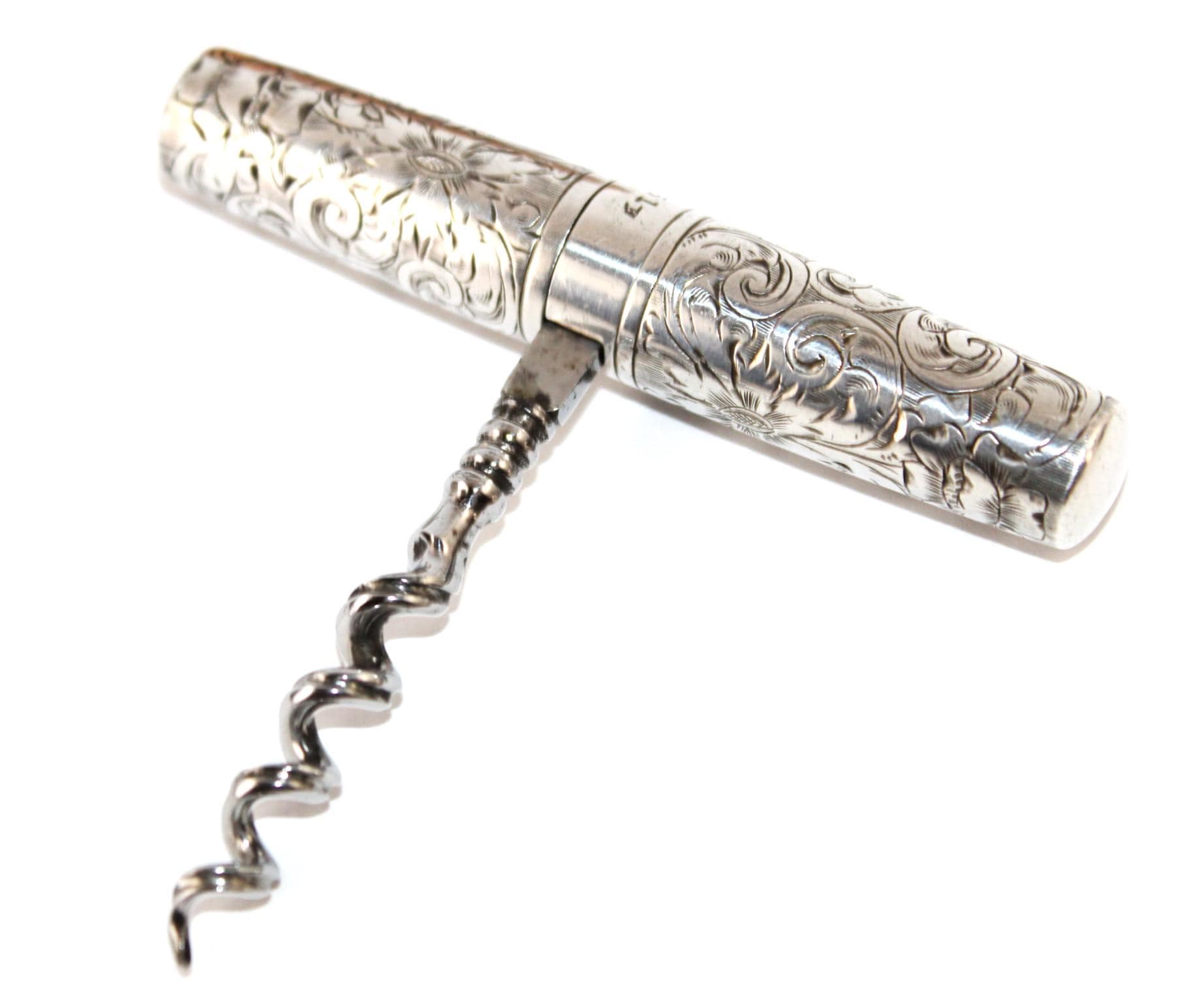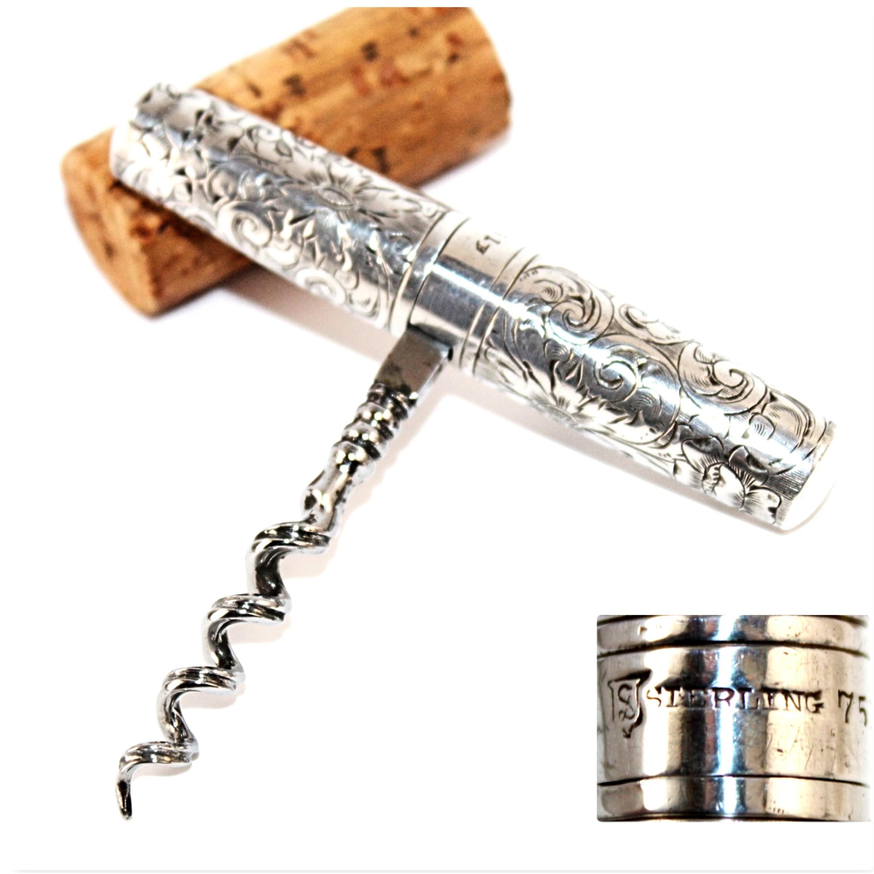 Wonderful find: this pocket-style Corkscrew, also known as a Roundlet-Style Corkscrew. Originally designed in the early 18th century, this wonderful piece dates from the late 1800s. This is made of a Sterling silver case with a silver-plated steel Corkscrew. Unscrew the case at the middle slide and pull down the Corkscrew. Reattach the case to form a handle for the Corkscrew. The worm (corkscrew) is designed with a fluted worm, which is a groove cut along the backside of the worm. This allows air to enter the bottle once it has pierced the cork. This reduces the interior suction, allowing the cork to be pulled with ease. The outer case of this Corkscrew is beautifully designed wonderful scroll work and is marked sterling with the Maker's Mark and 751 D. Each end of the case is marked with the number 23 to signify it as a matching case.
