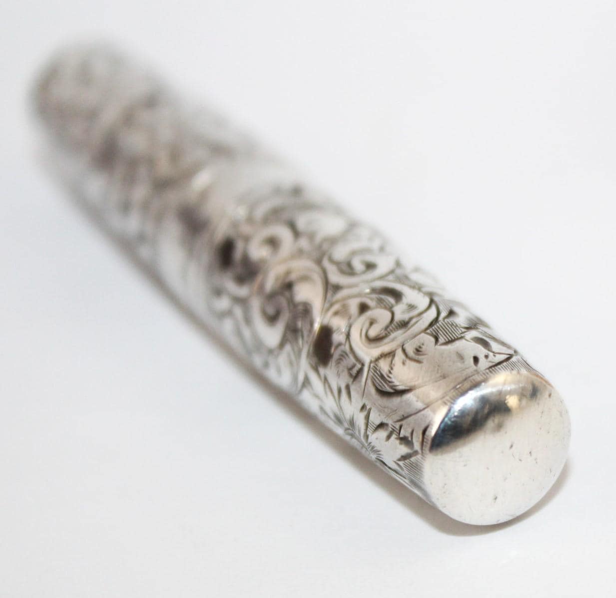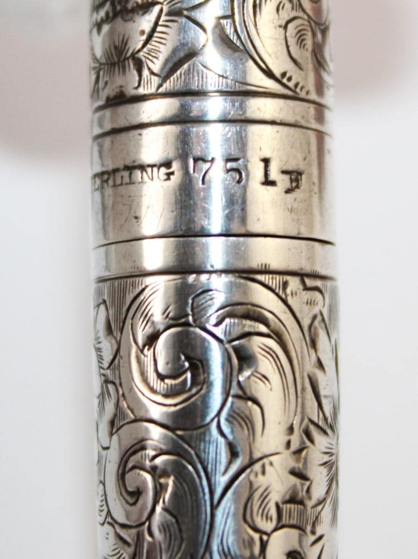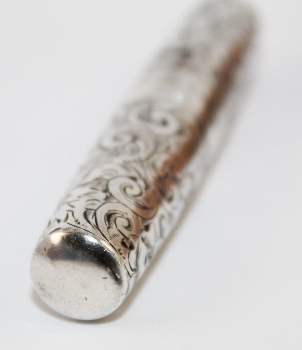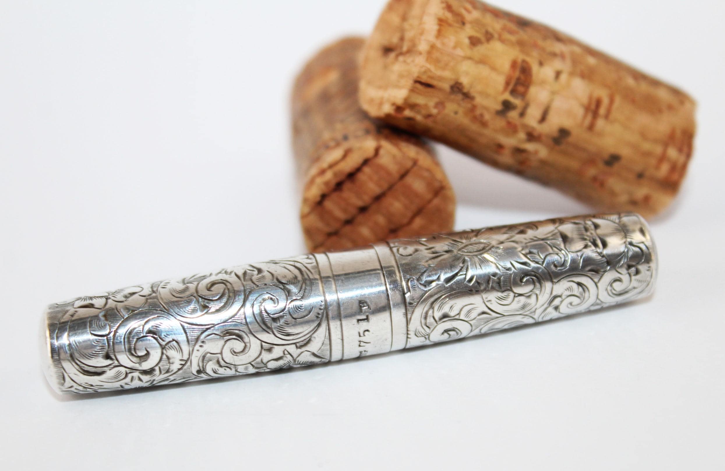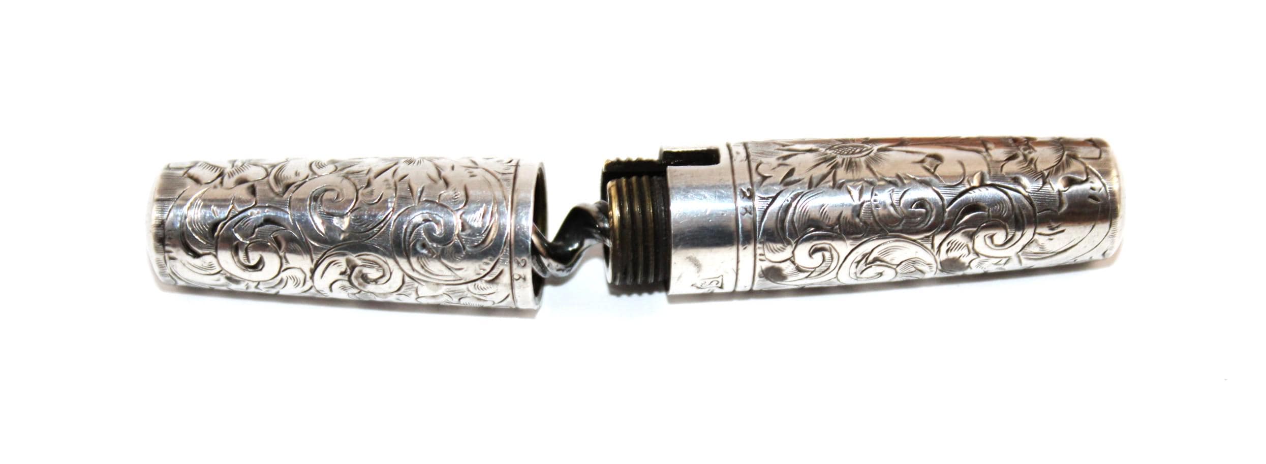 Wonderful find: this pocket-style Corkscrew, also known as a Roundlet-Style Corkscrew. Originally designed in the early 18th century, this wonderful piece dates from the late 1800s. This is made of a Sterling silver case with a silver-plated steel Corkscrew. Unscrew the case at the middle slide and pull down the Corkscrew. Reattach the case to form a handle for the Corkscrew. The worm (corkscrew) is designed with a fluted worm, which is a groove cut along the backside of the worm. This allows air to enter the bottle once it has pierced the cork. This reduces the interior suction, allowing the cork to be pulled with ease. The outer case of this Corkscrew is beautifully designed wonderful scroll work and is marked sterling with the Maker's Mark and 751 D. Each end of the case is marked with the number 23 to signify it as a matching case.