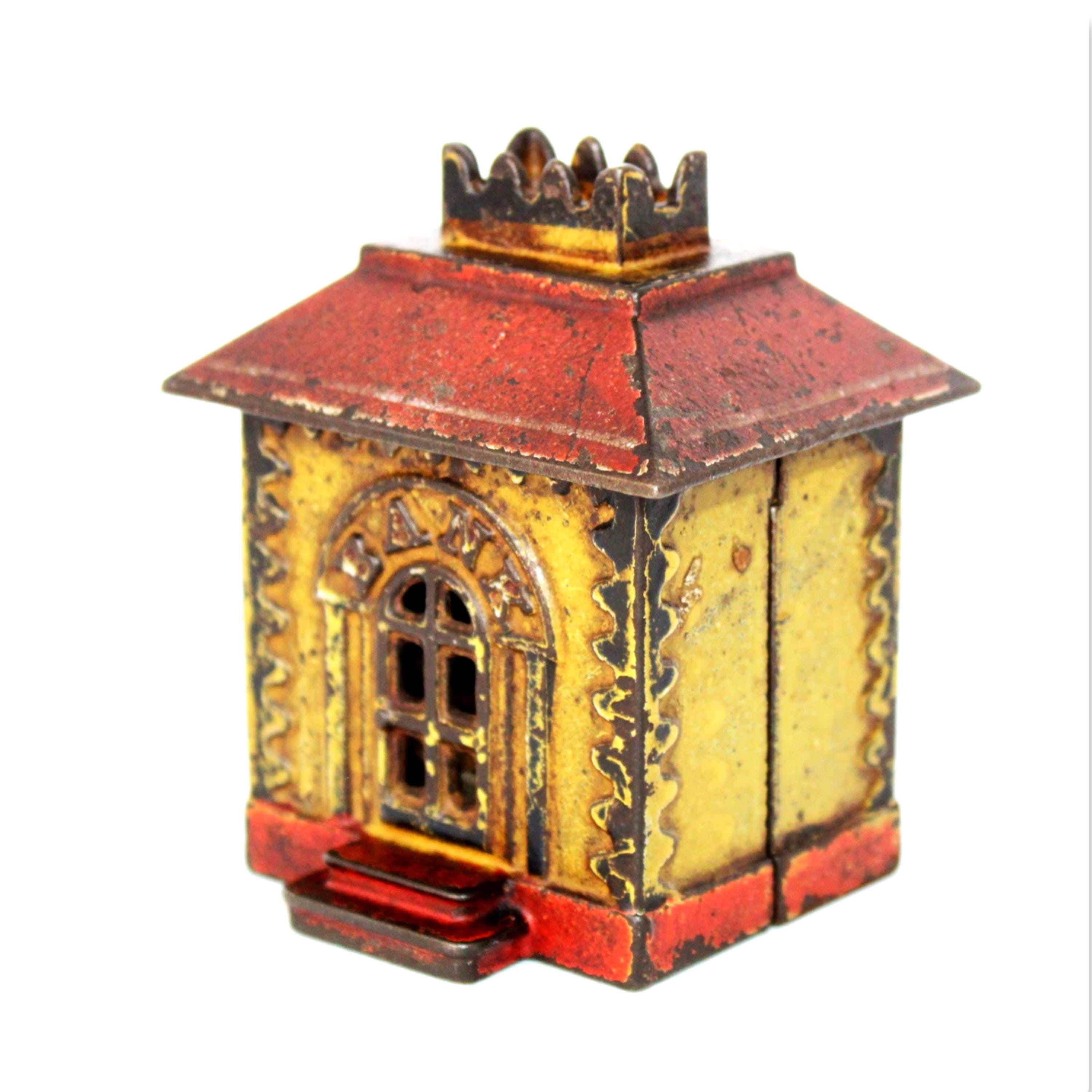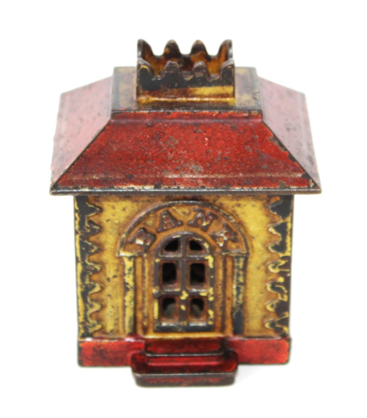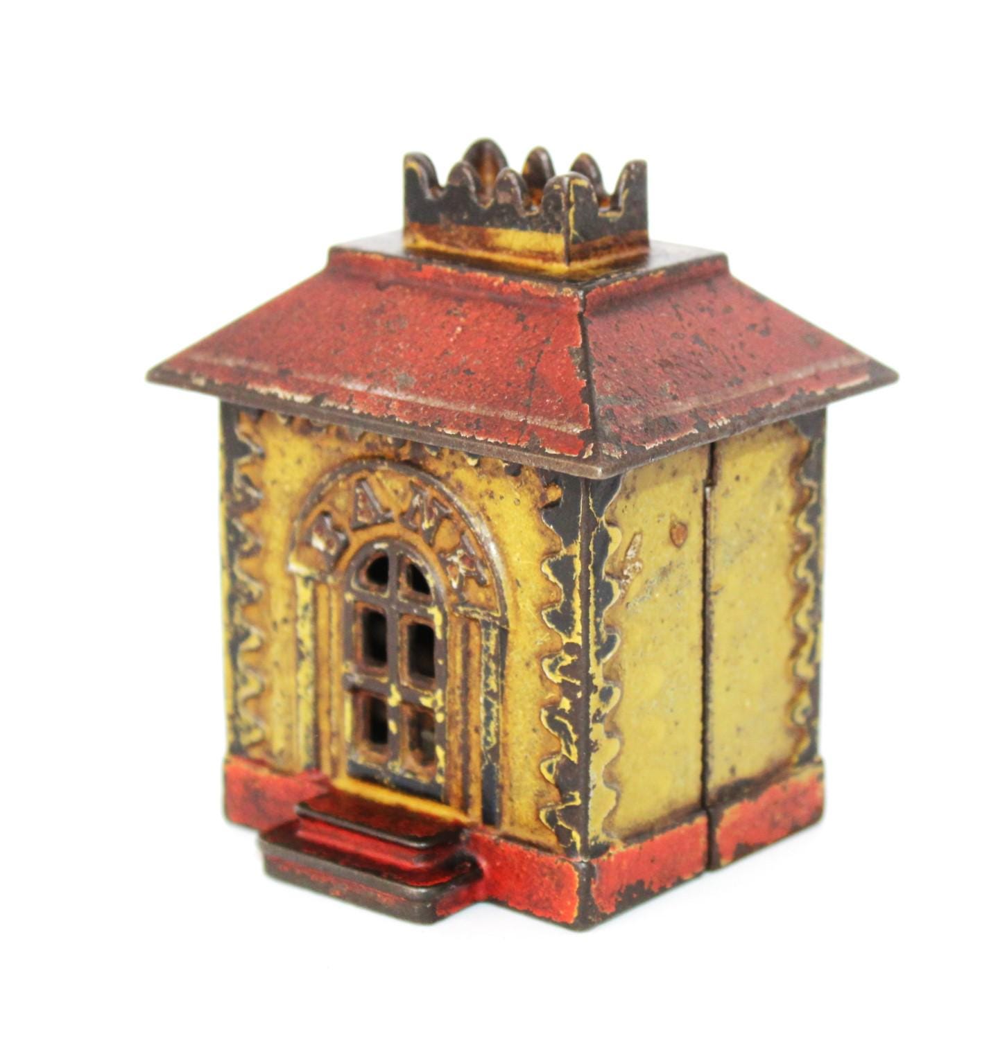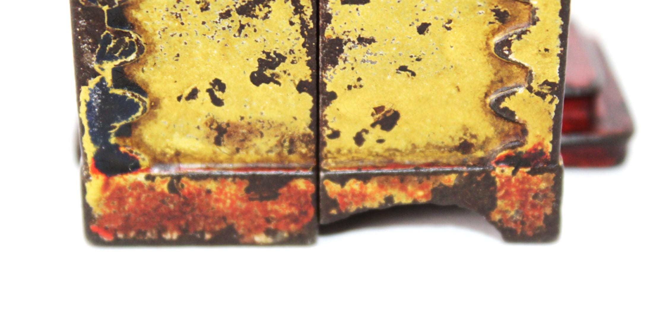 Wonderful find, this antique cast iron Still Penny Bank, made in the early 1900s. The original color of the Bank was red and yellow; a substantial portion of the original paint remains.