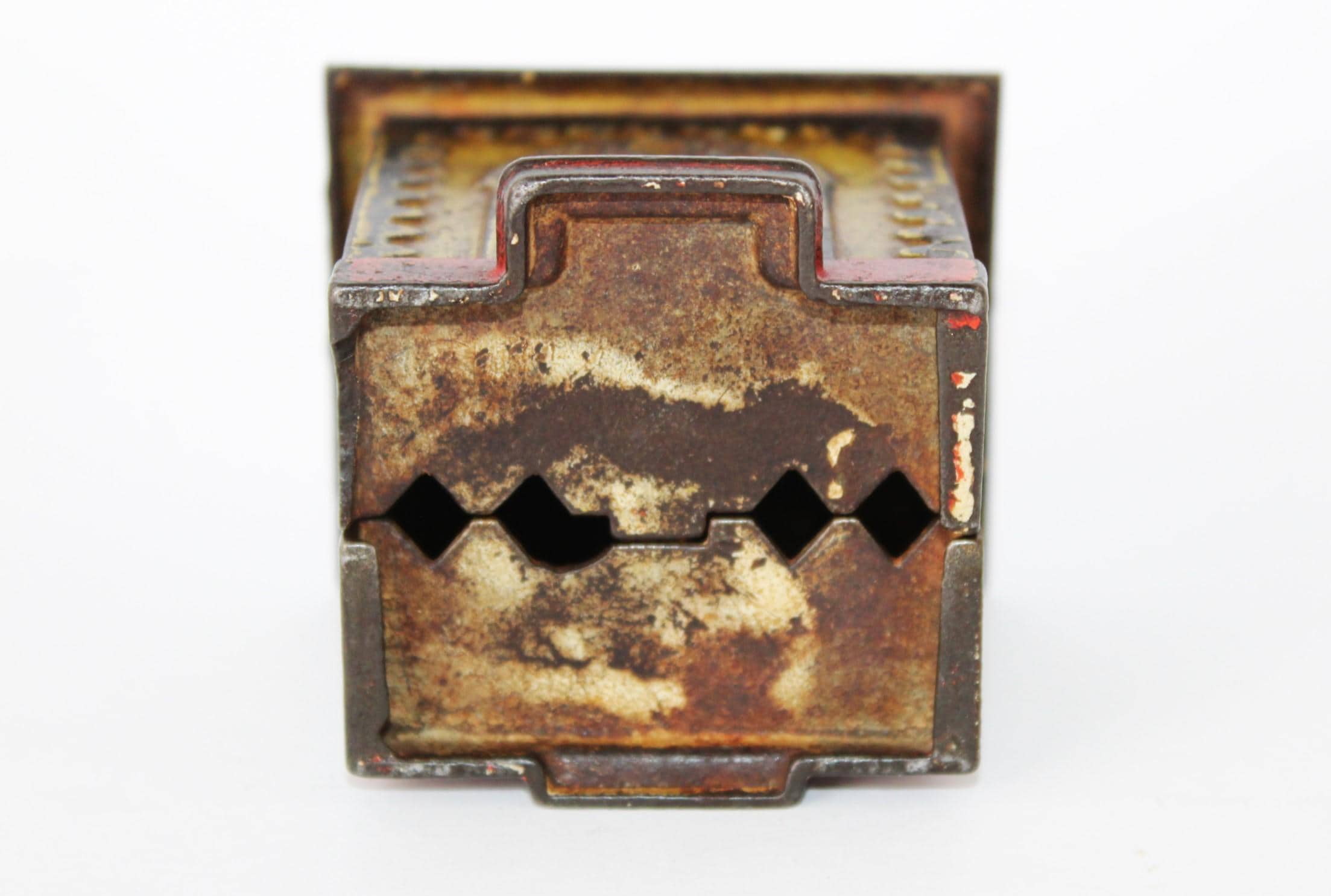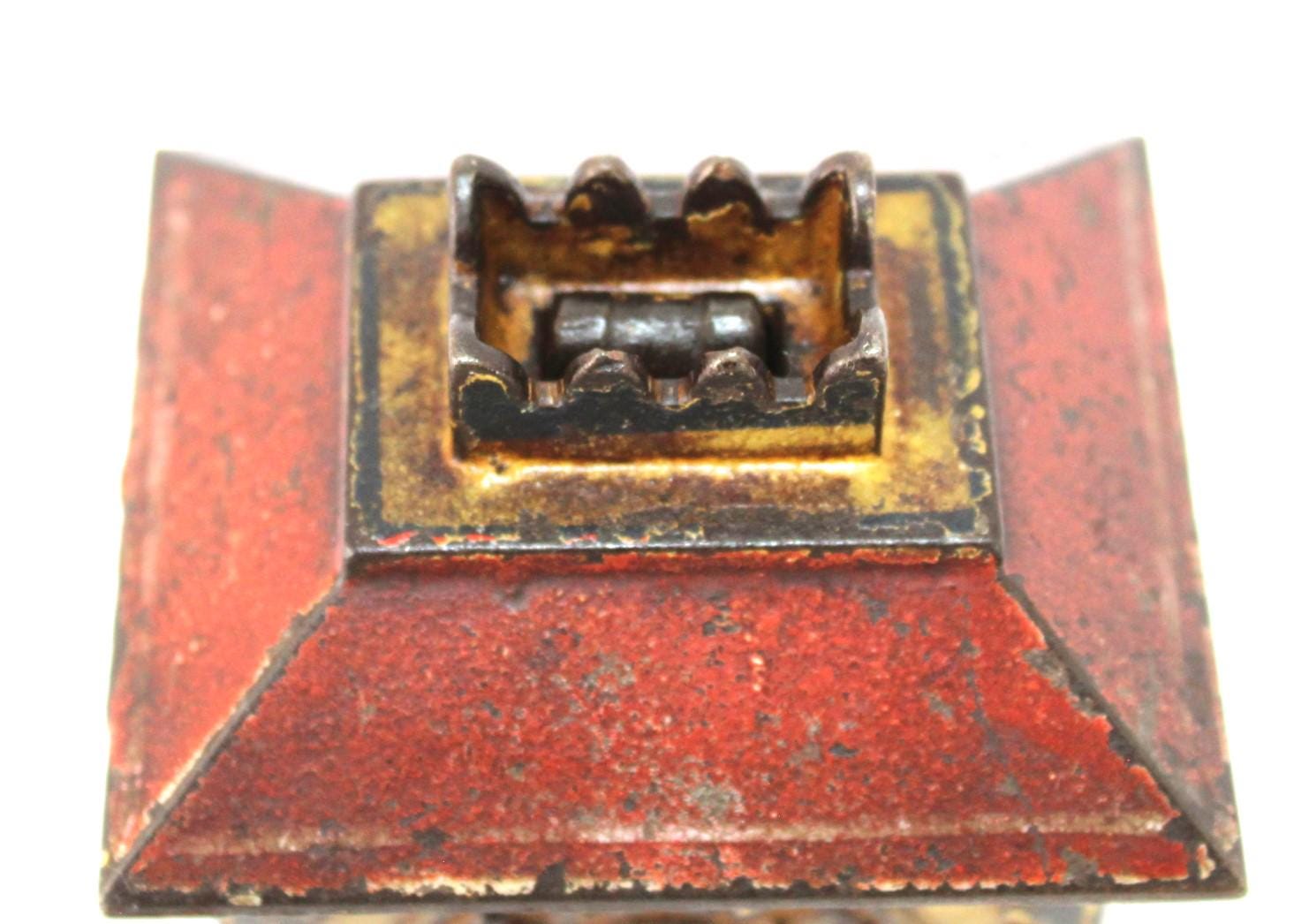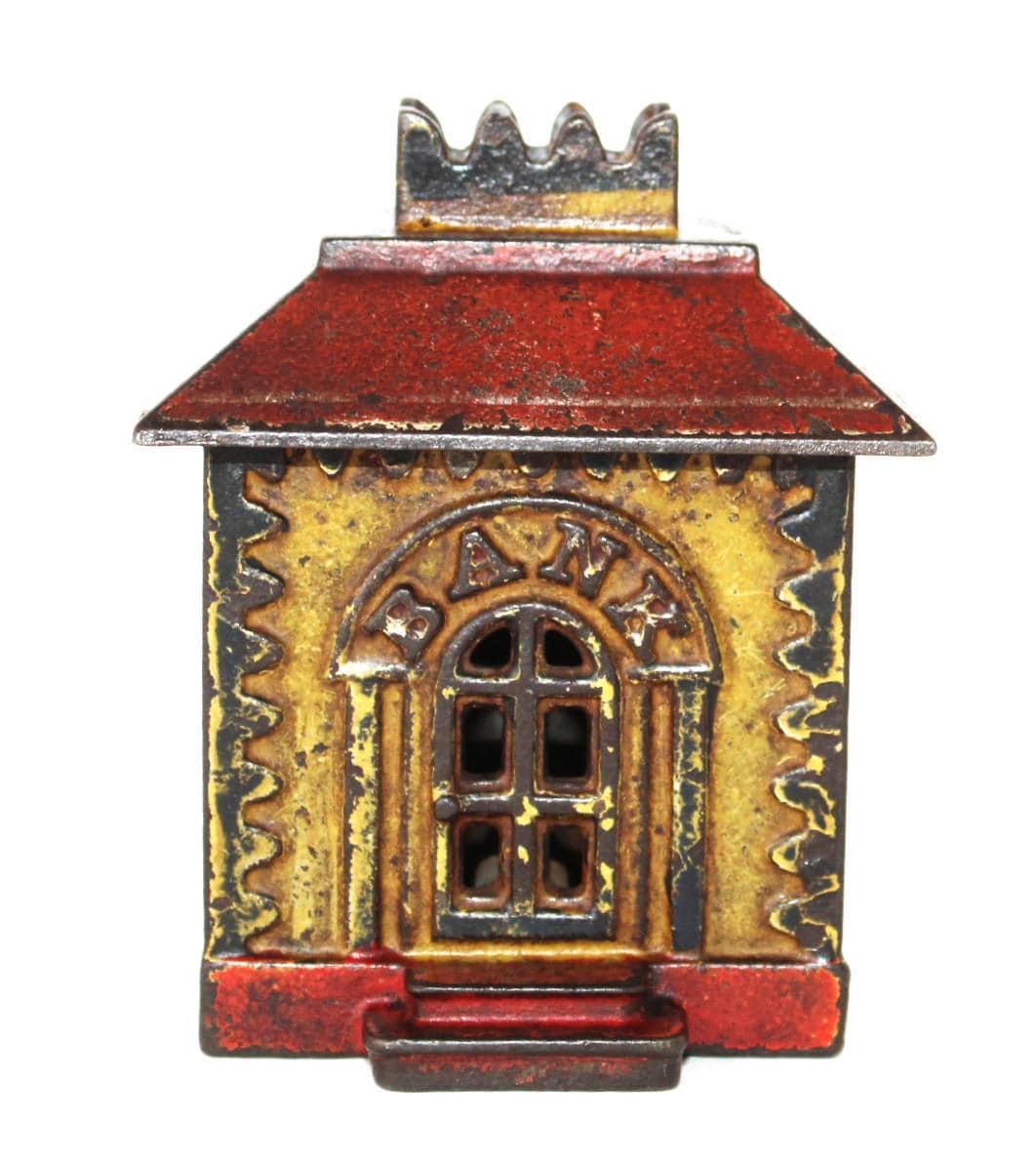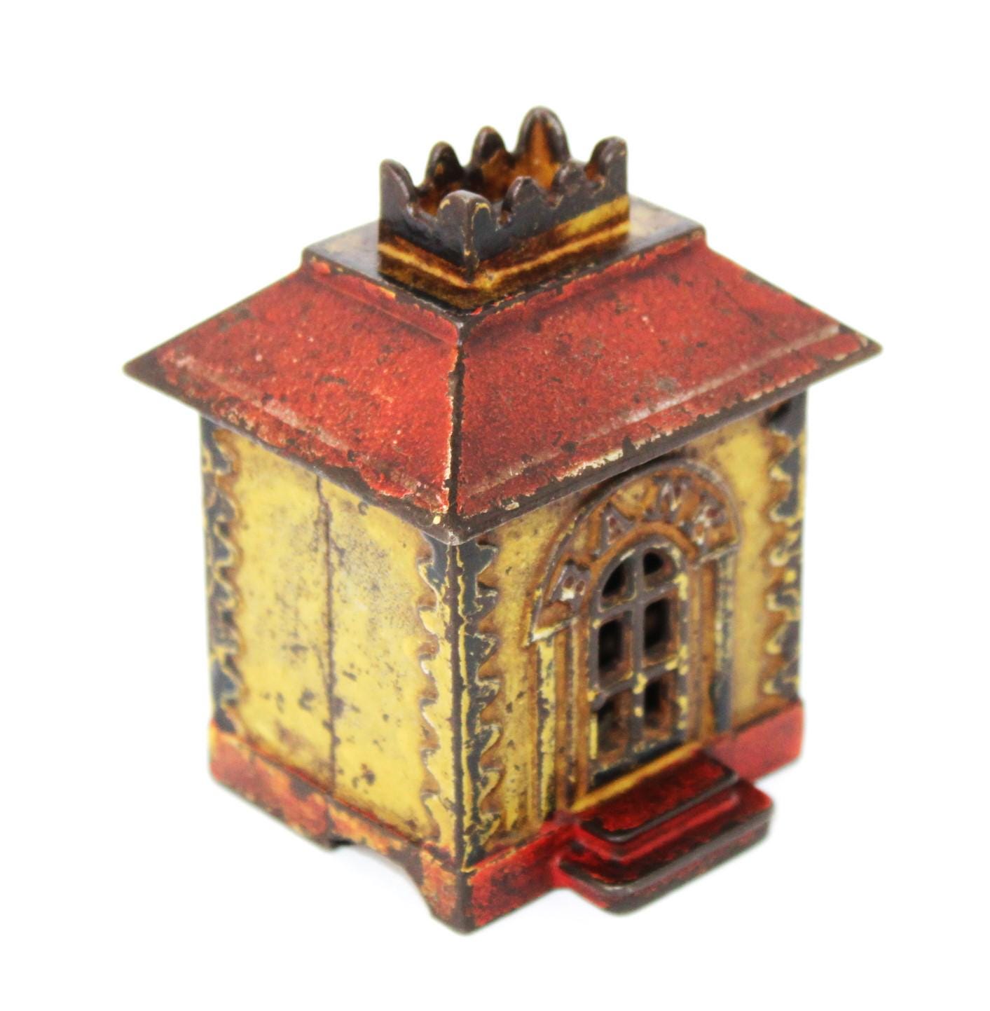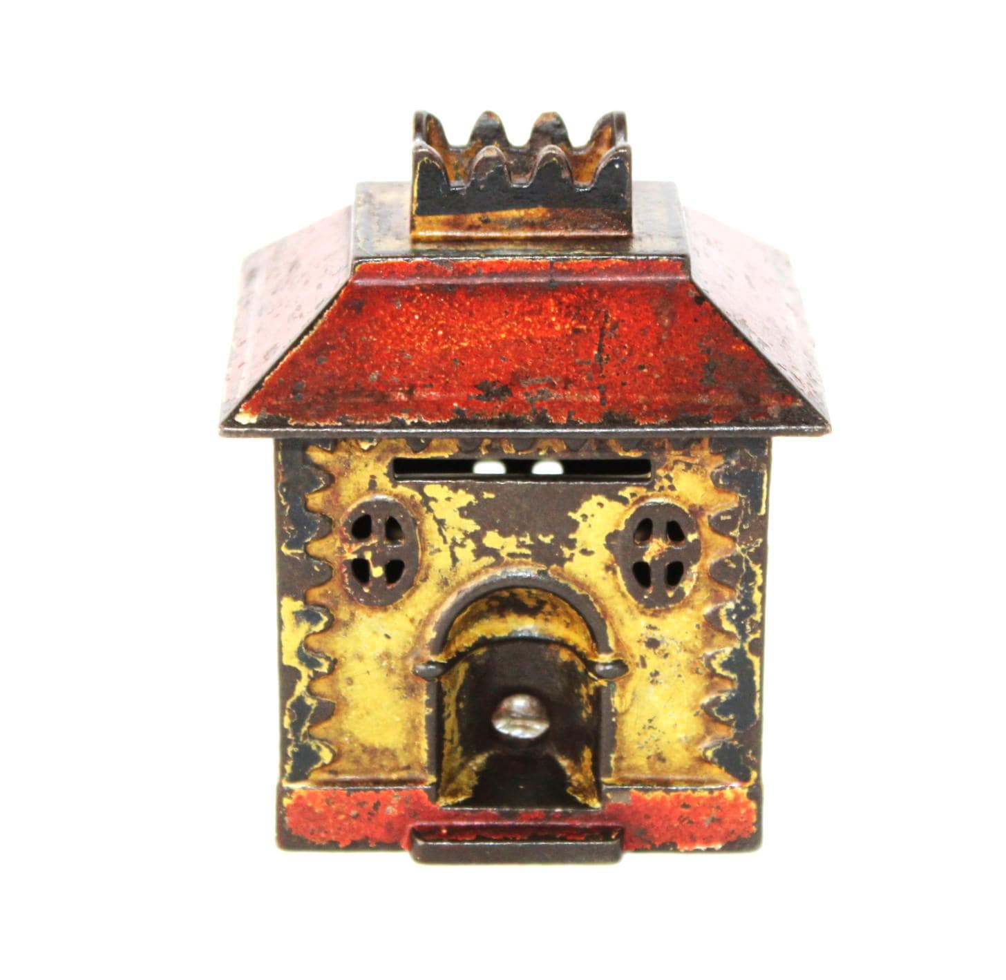 Wonderful find, this antique cast iron Still Penny Bank, made in the early 1900s. The original color of the Bank was red and yellow; a substantial portion of the original paint remains.