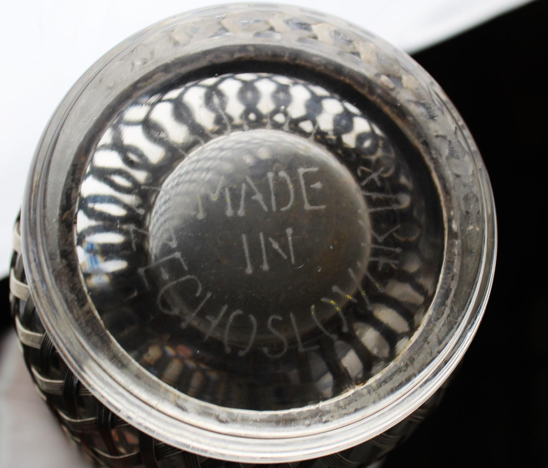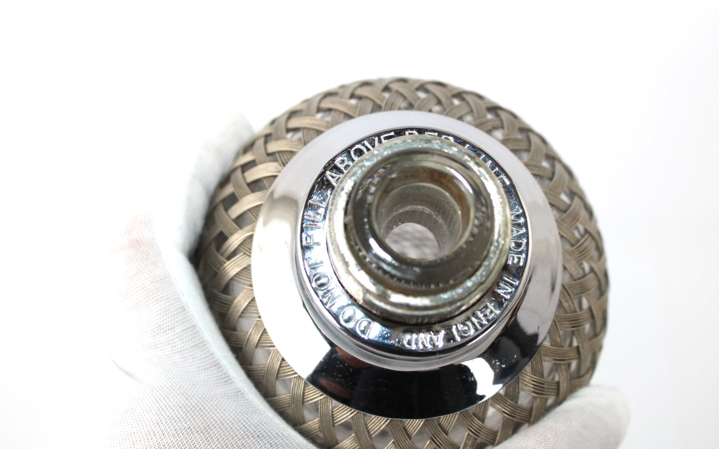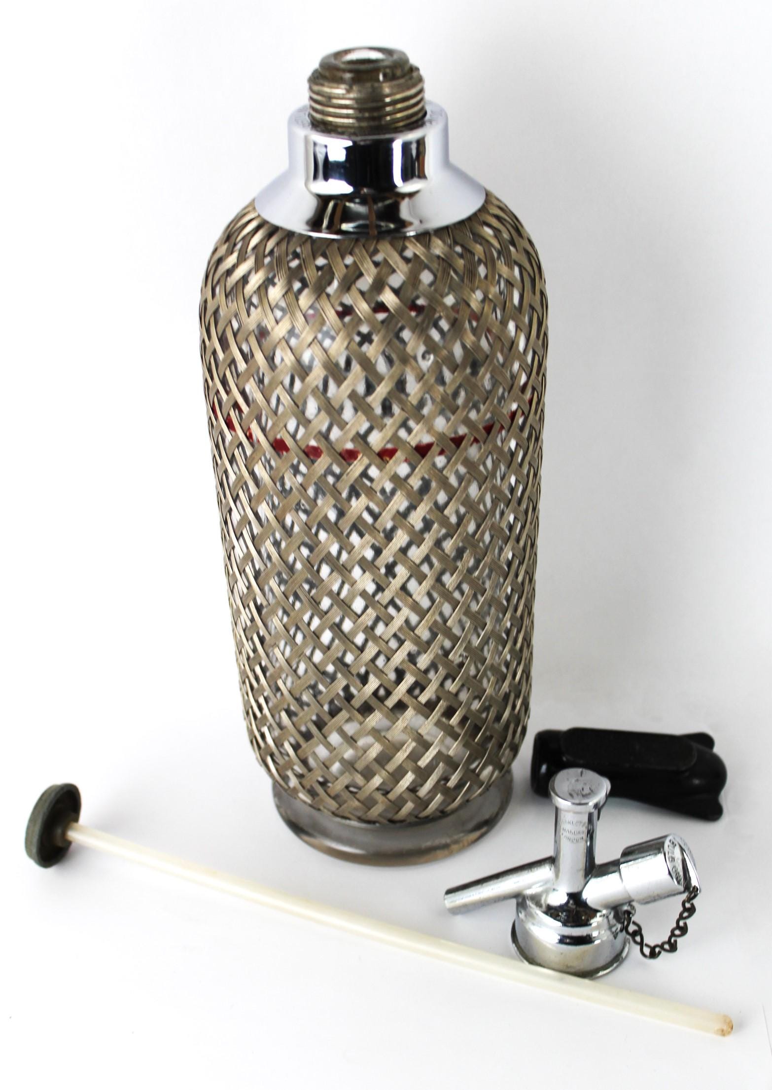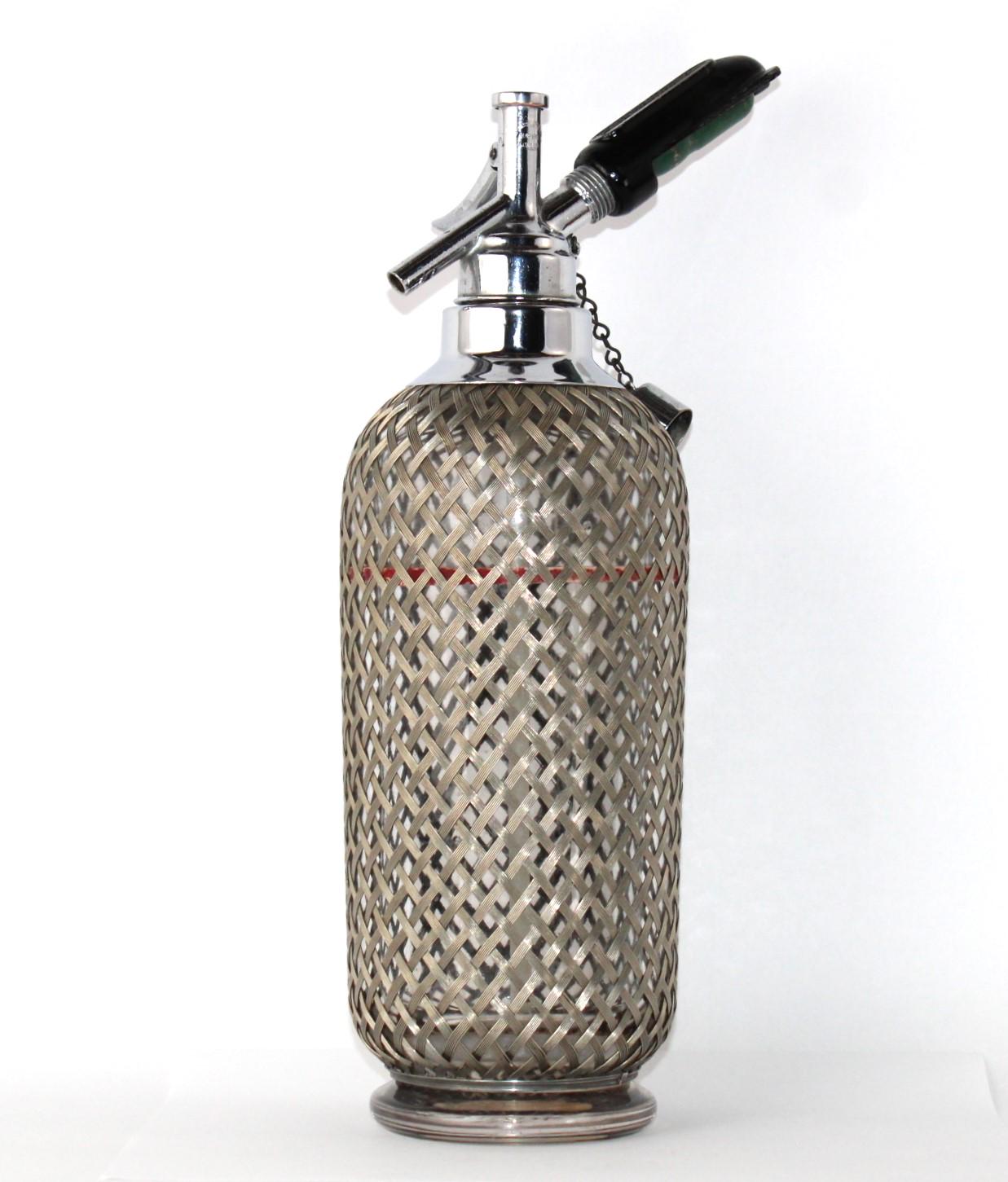 The heavy, thick glass bottle was made in Czechoslovakia. It has a wire-mesh sleeve covering. The chrome charger nozzle mechanism on top was made in London, England, which has a removable gas cartridge and a covering attached. Towards the top of the bottle is a red fill line. This is the 80/20 rule for filling a pressurized canister. Water 80%, pressure 20%.