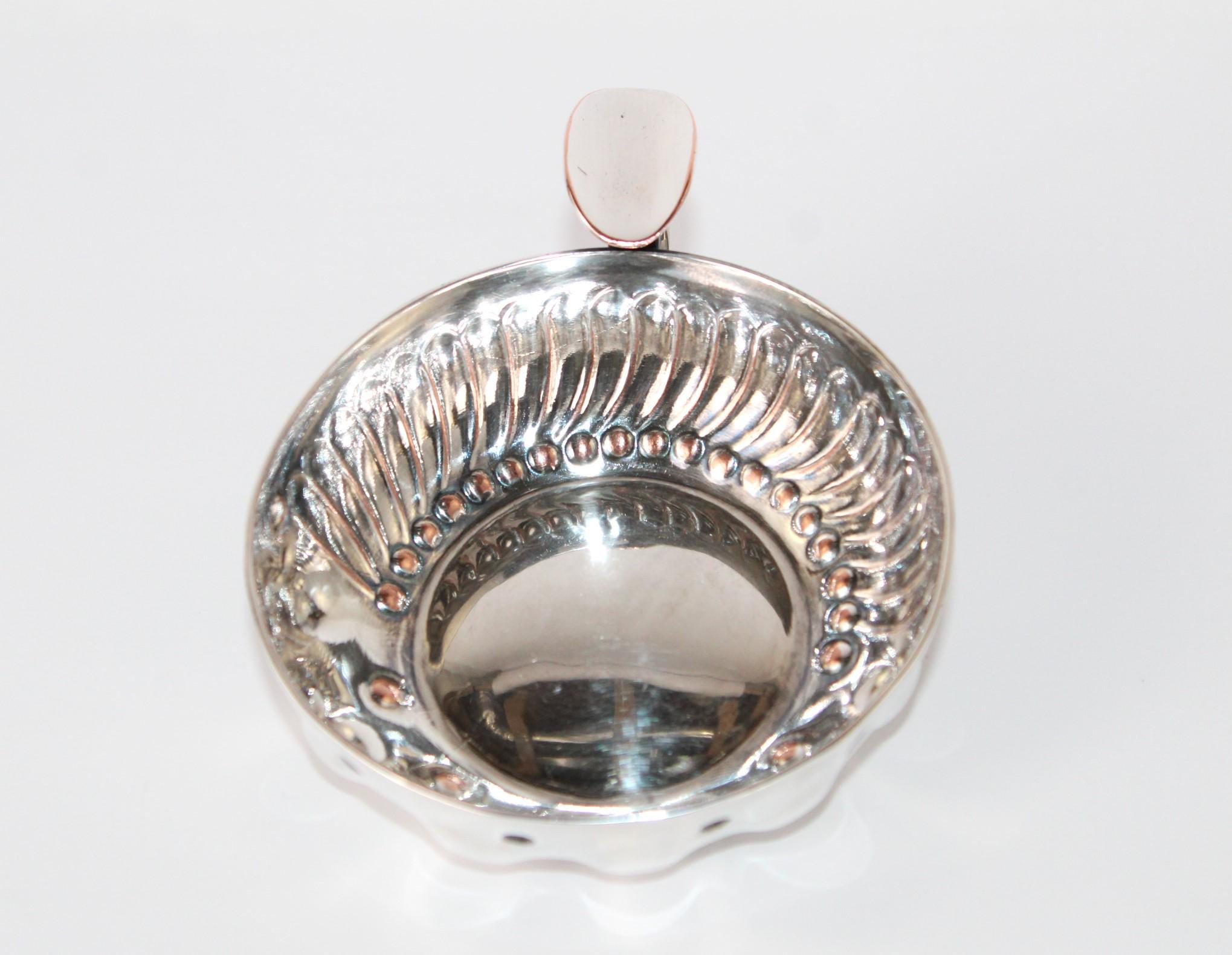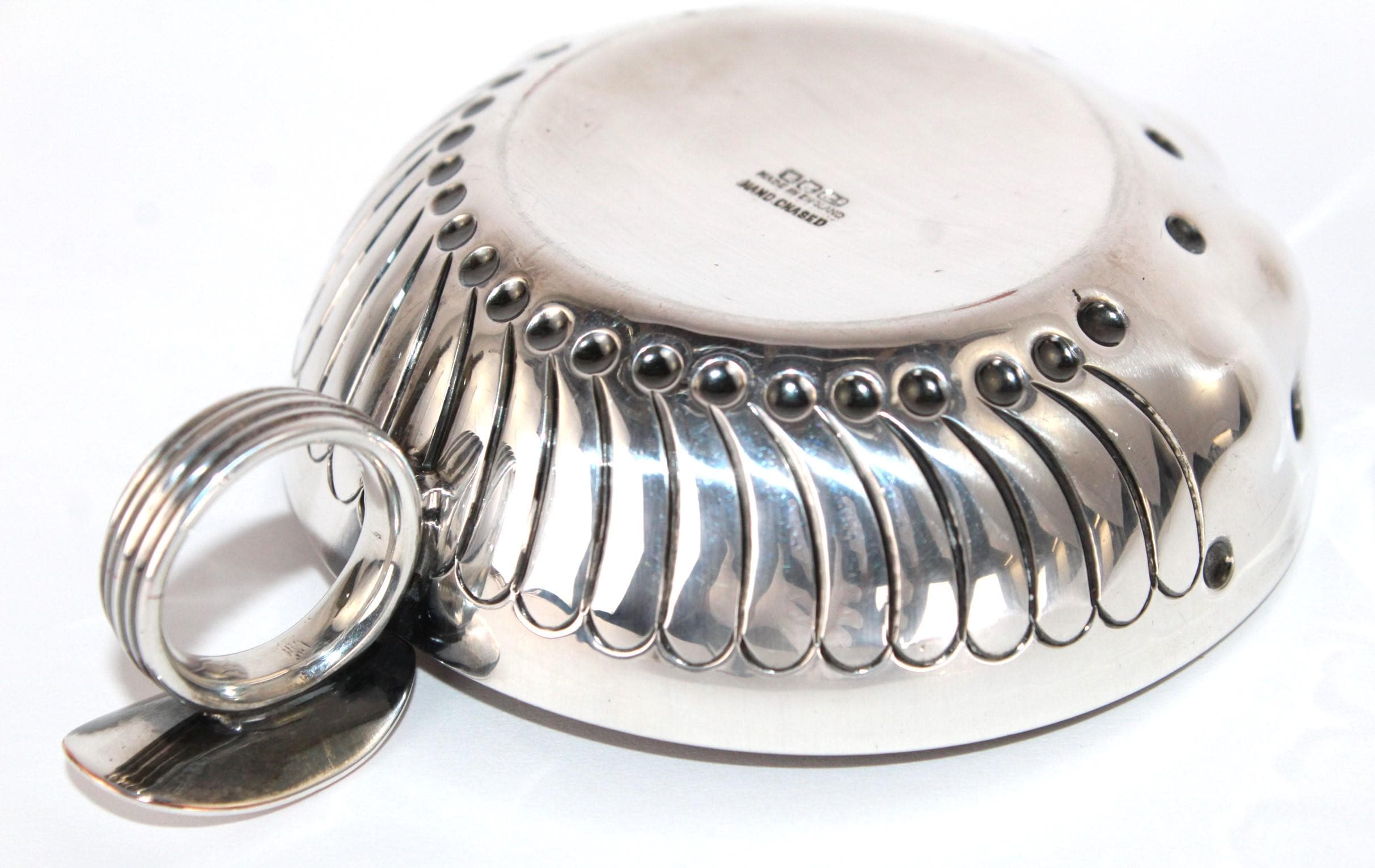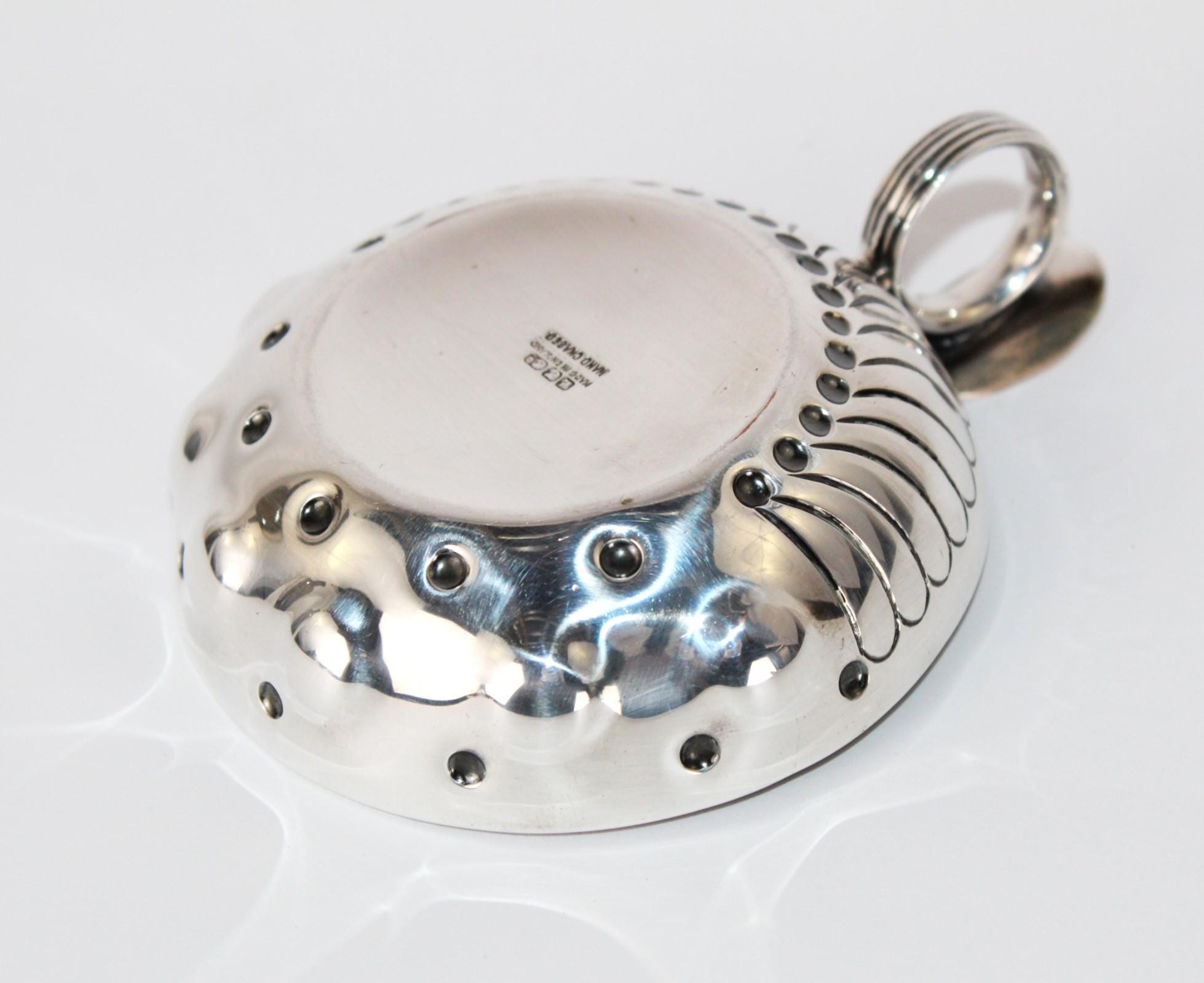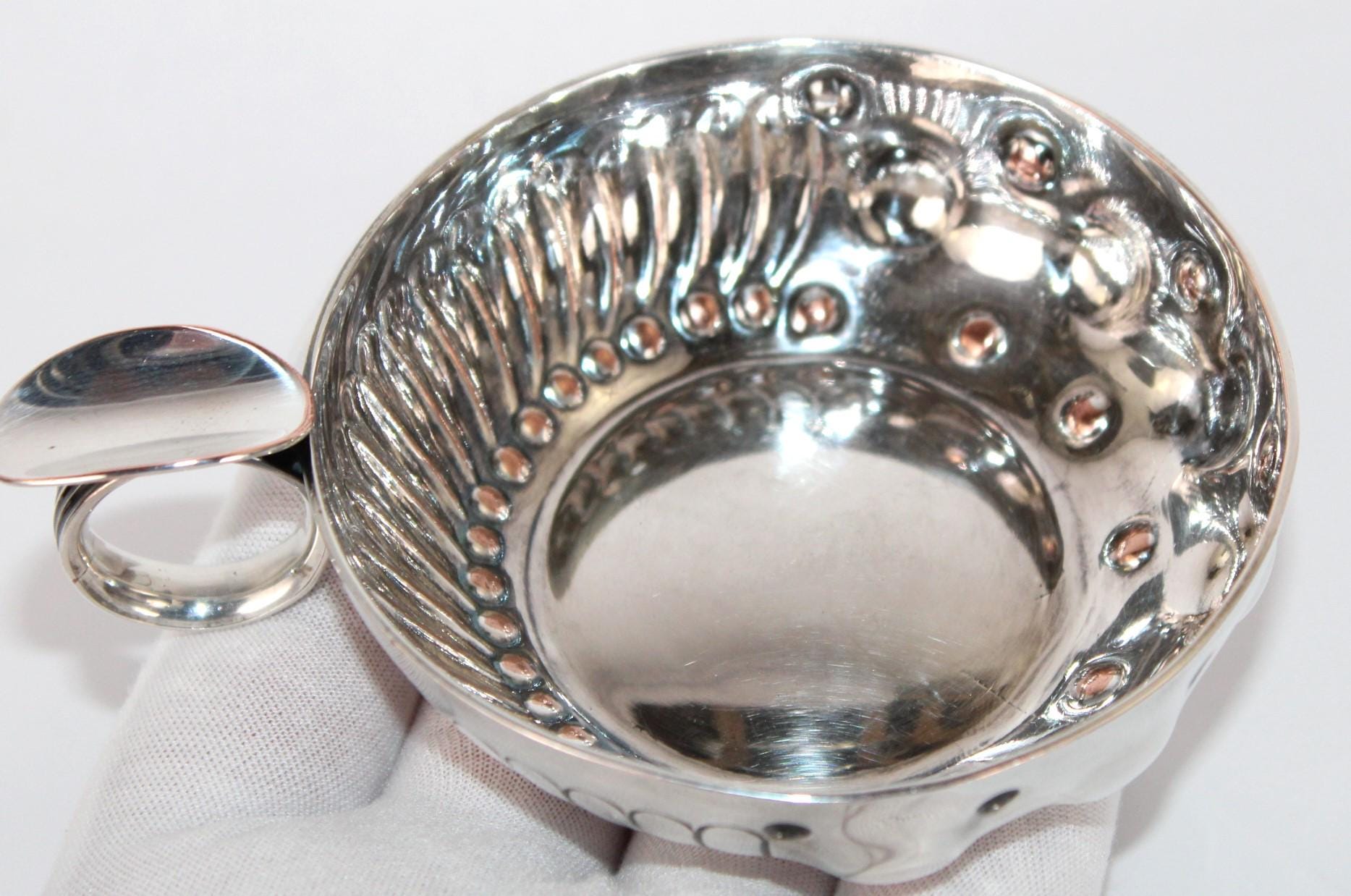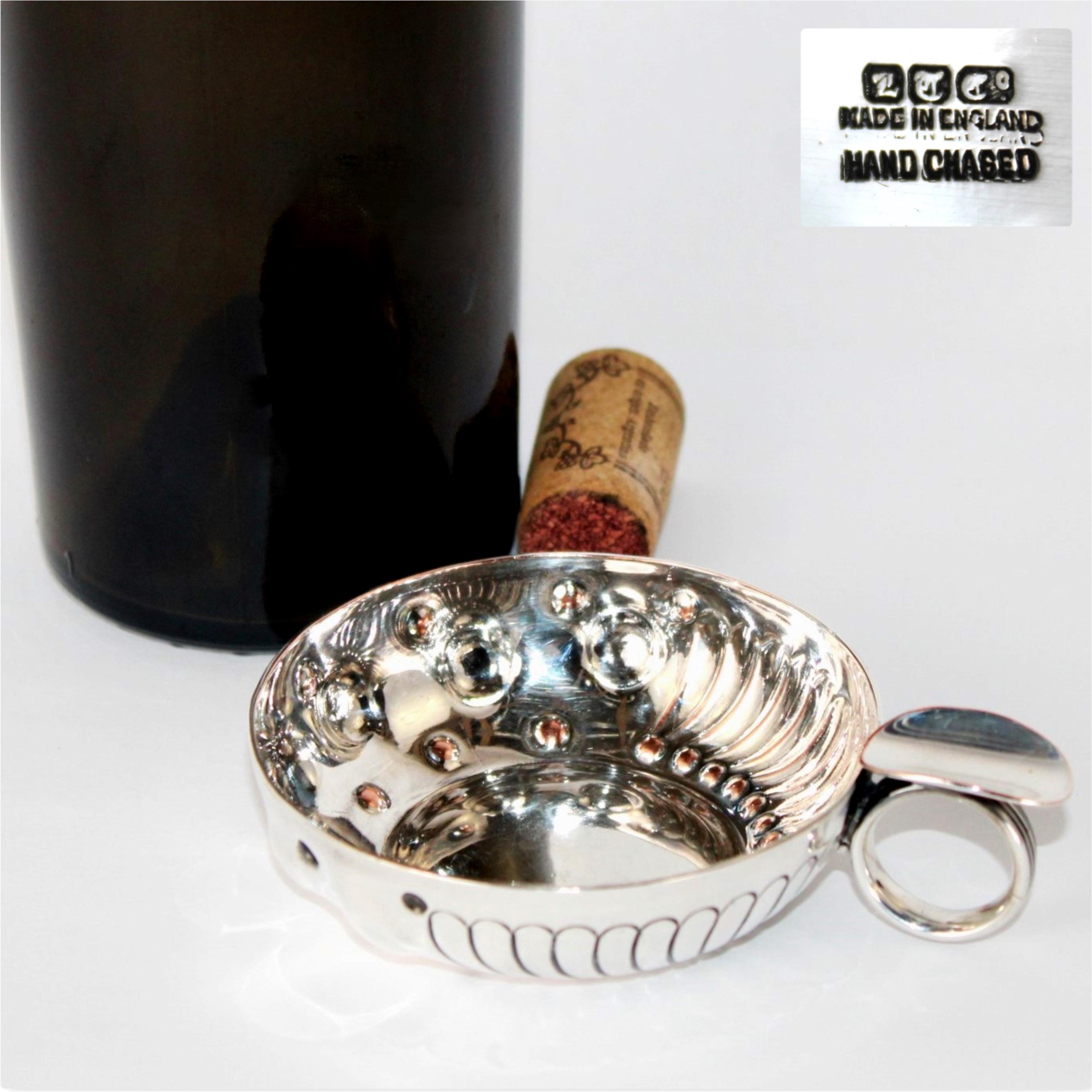 Wonderful find, this English Silver Tastevin Cup, Wine Tasting Sommelier Cup. Marked, made in England, and Hand Chased with maker's marks.