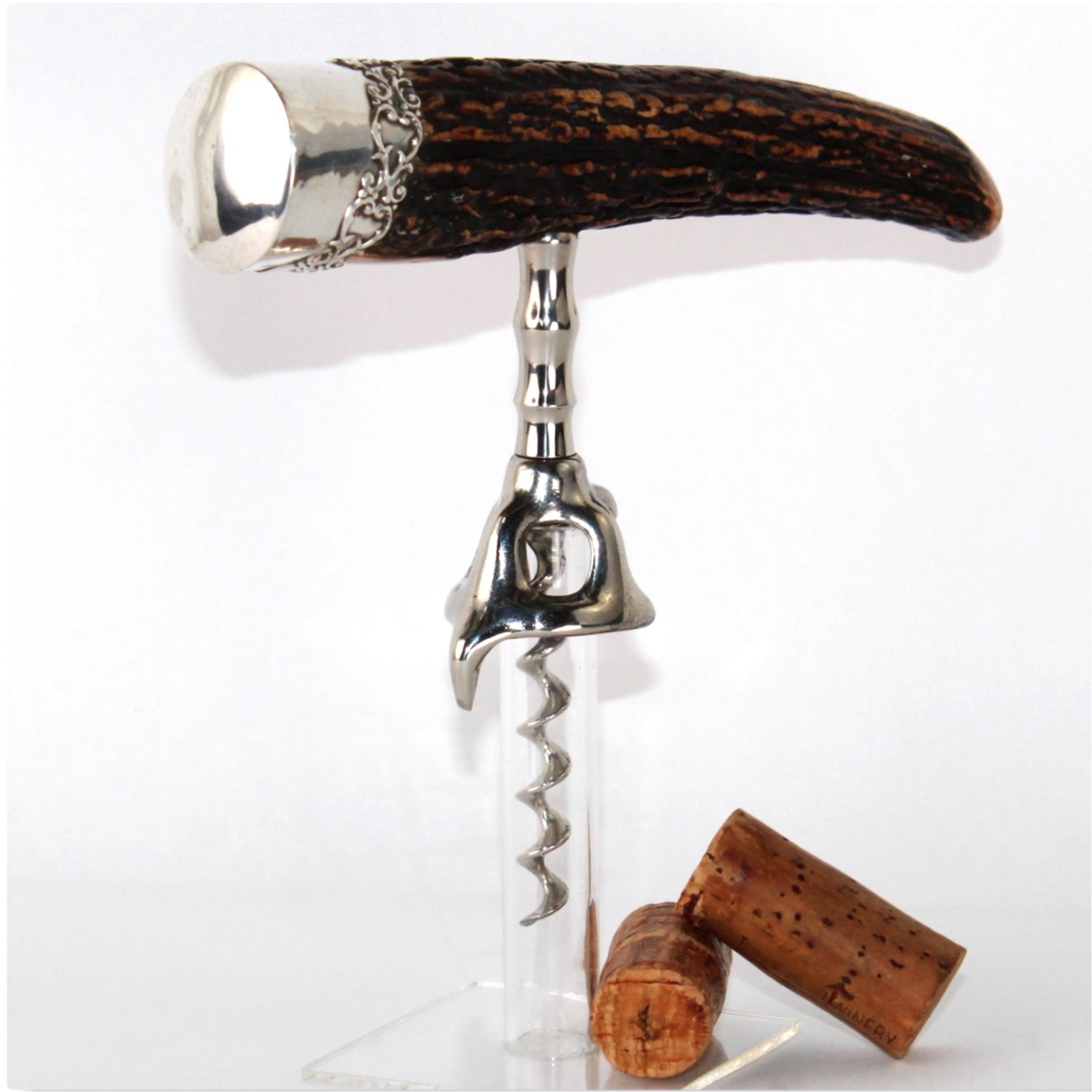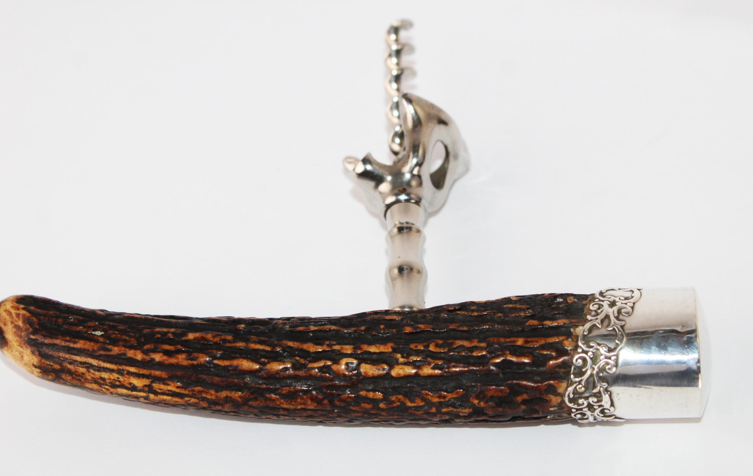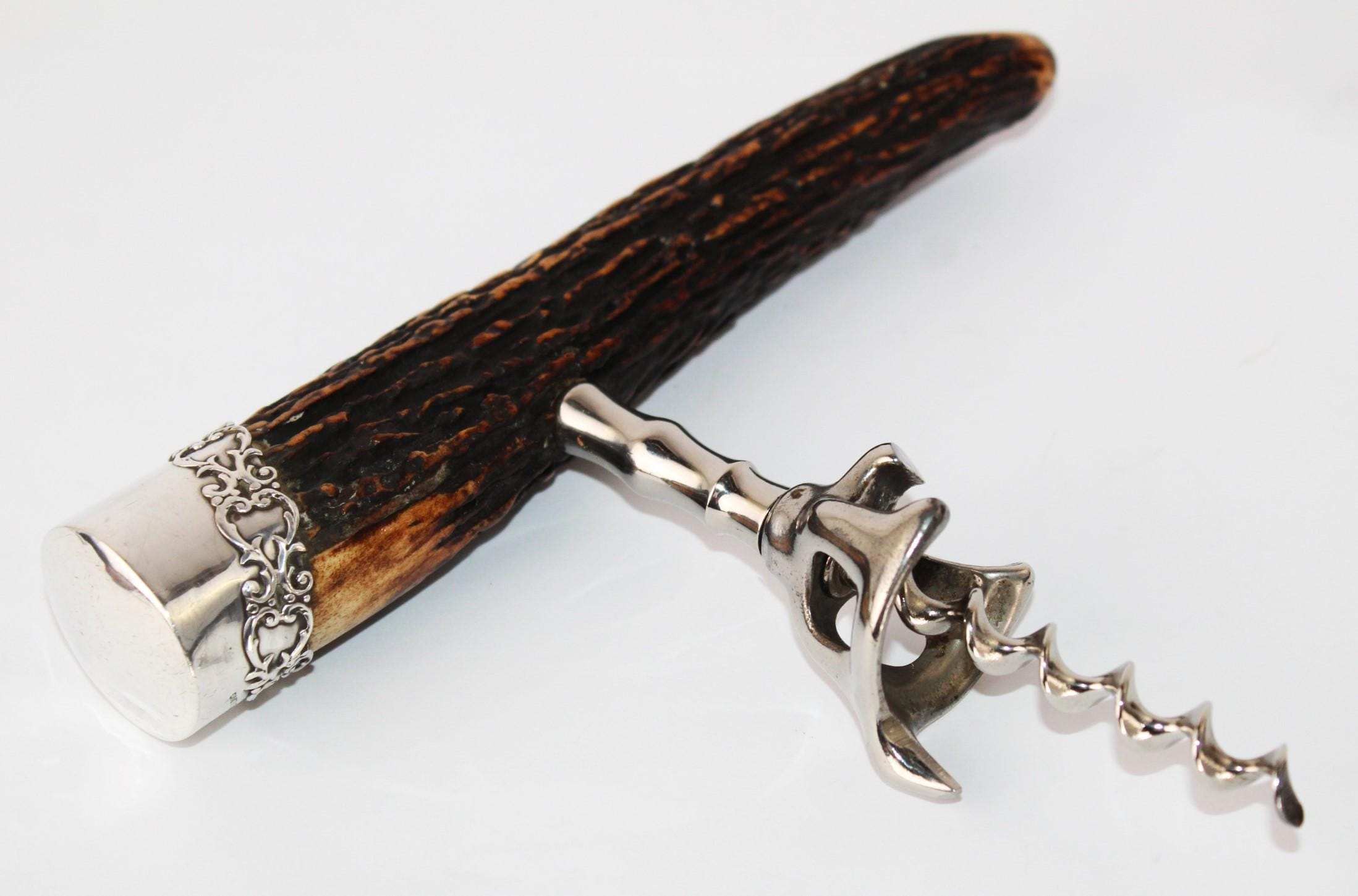 Antique Sterling Silver Stag Horn Handle Corkscrew, Wine Bottle Opener