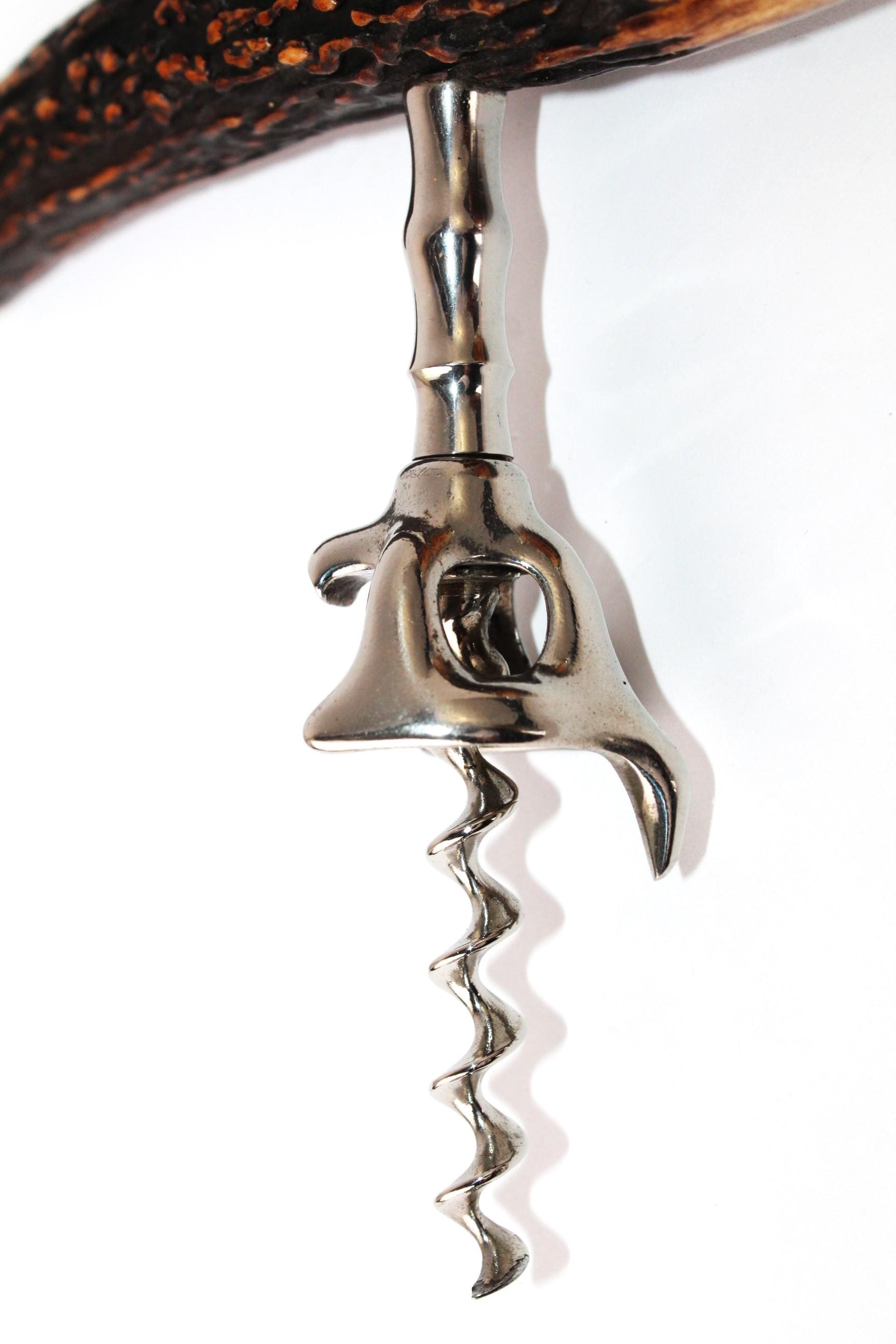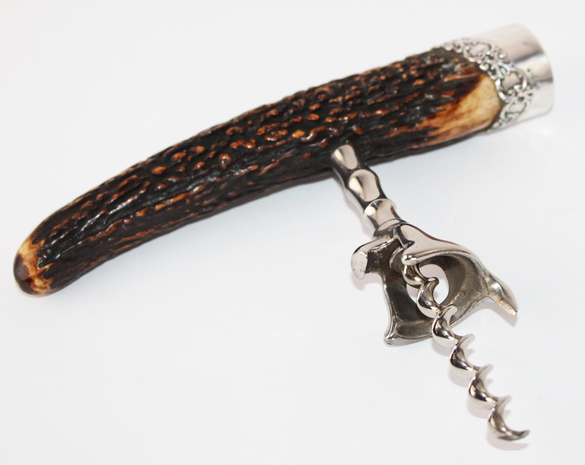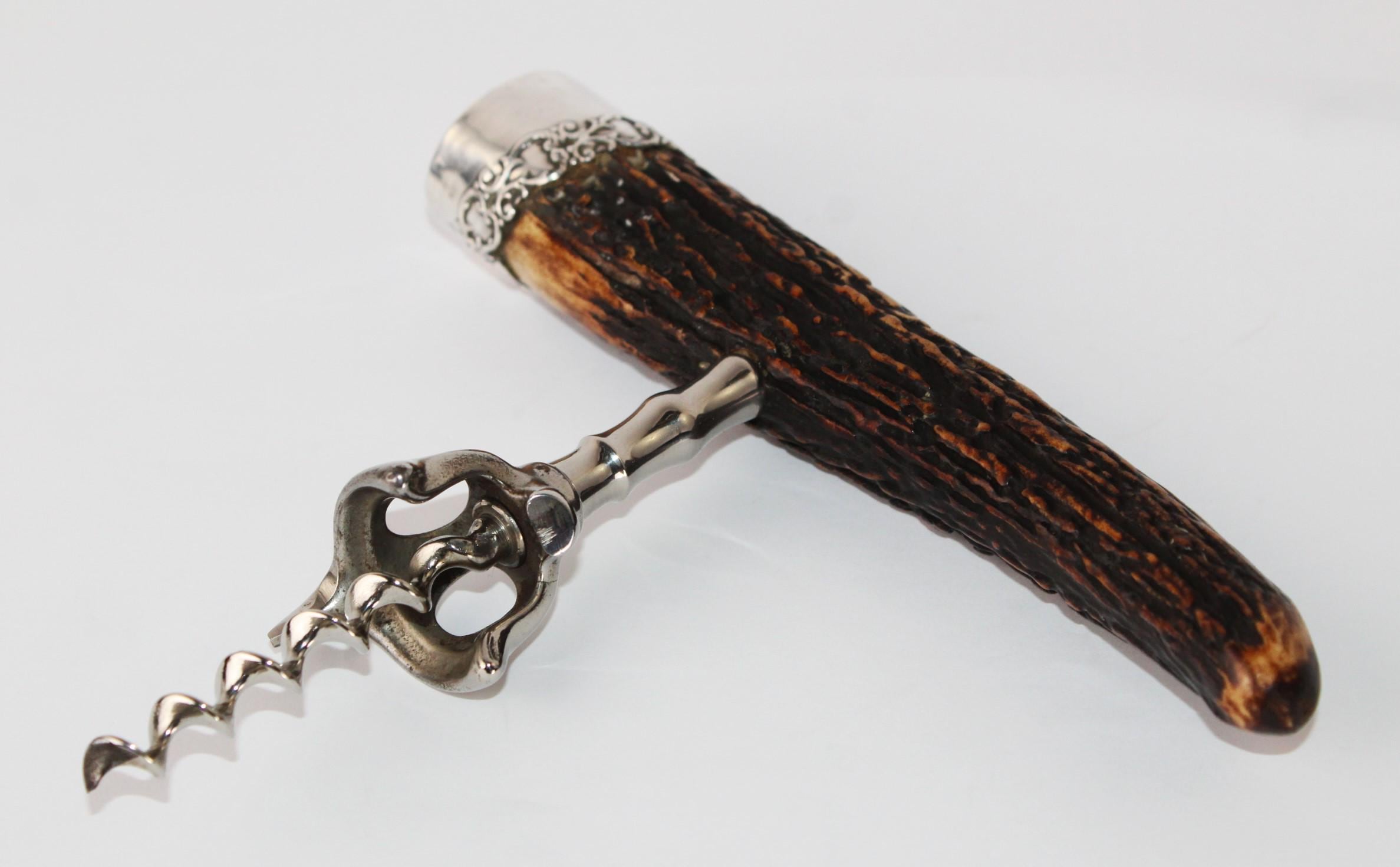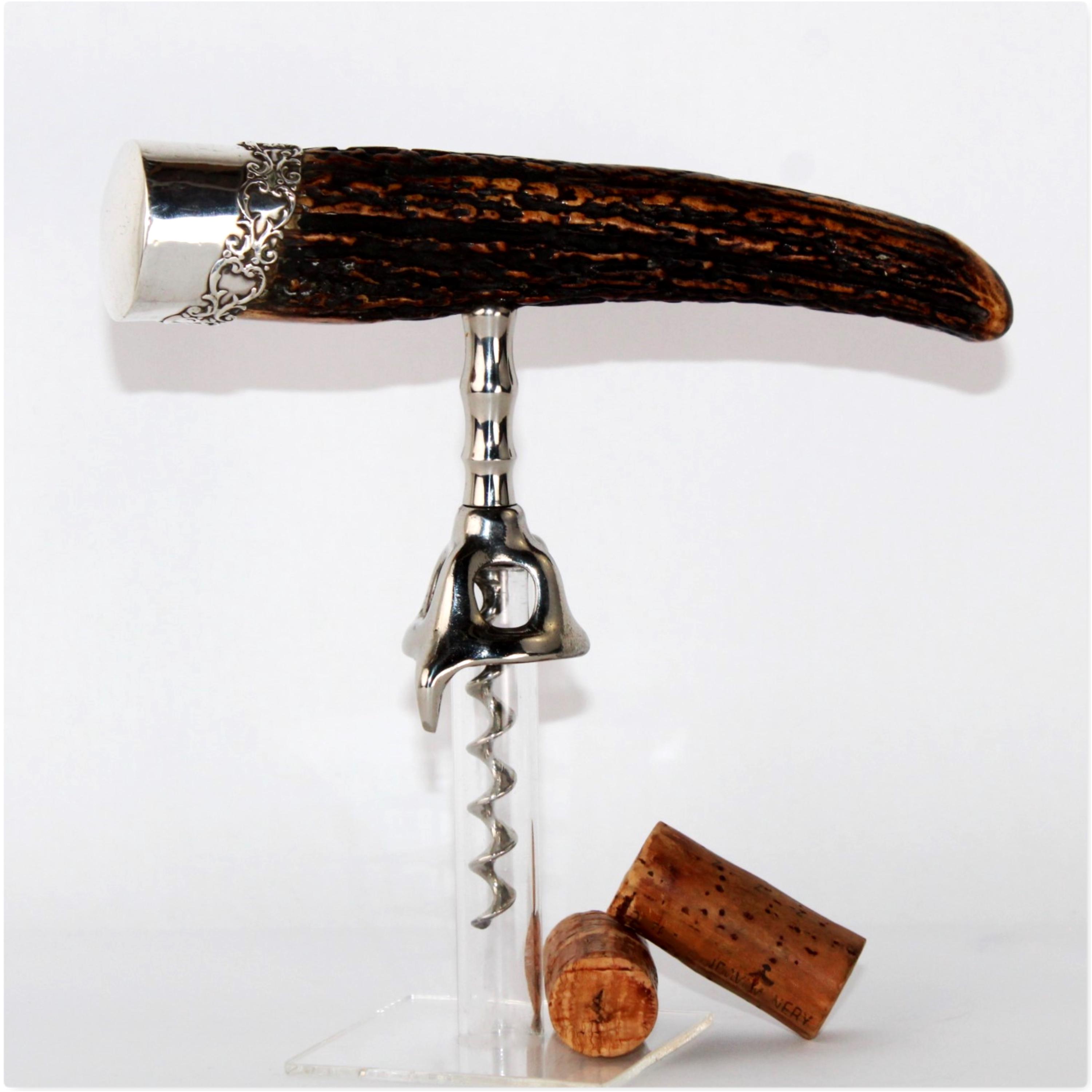 Antique Sterling Silver Stag Horn Handle Corkscrew, Wine Bottle Opener