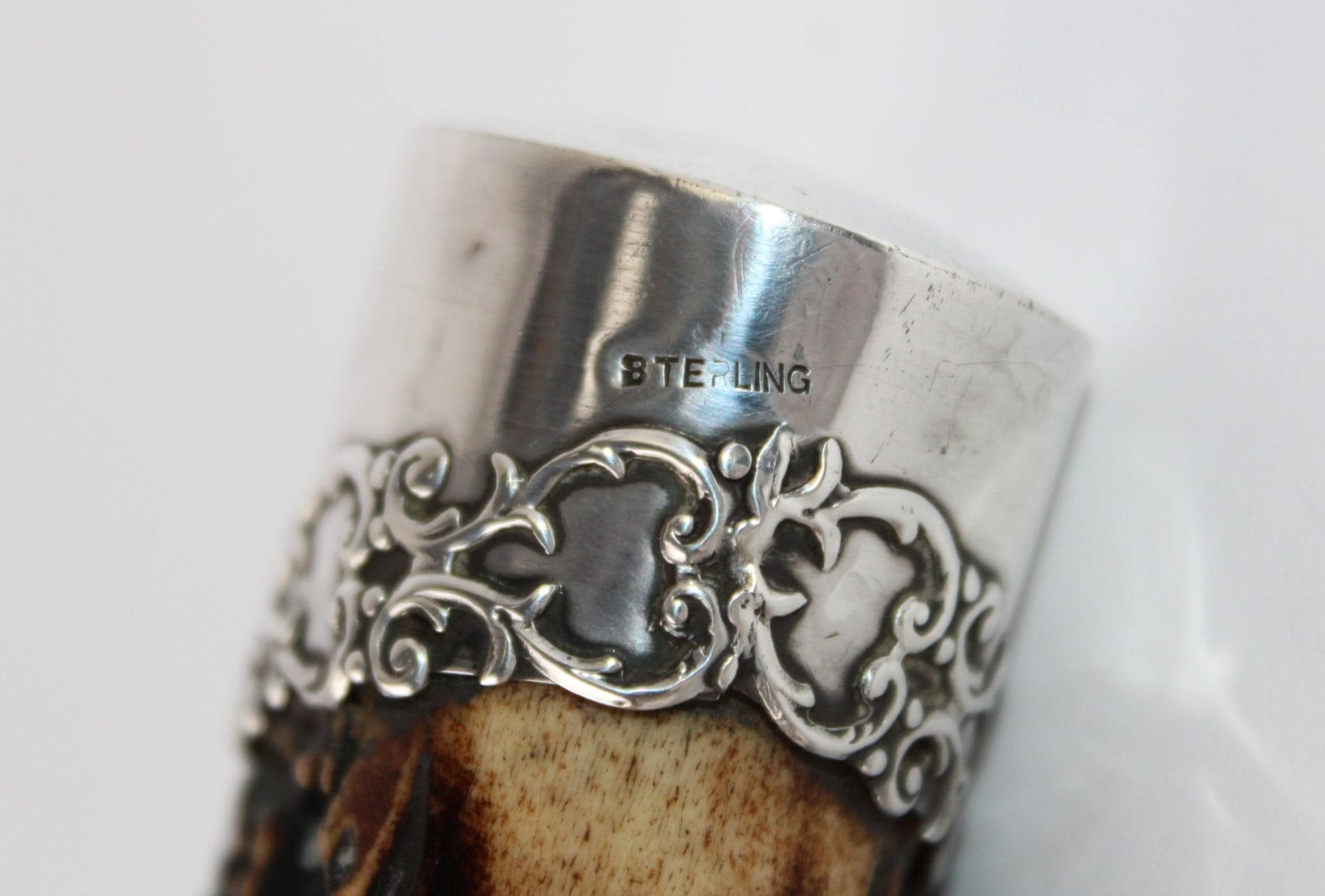 The Sterling silver cap is marked with (Sterling) and features beautifully designed scrollwork. The end is not monogrammed; you can add your initials or give it as a gift with their initials—a truly spectacular gift. We do not offer monogramming.
