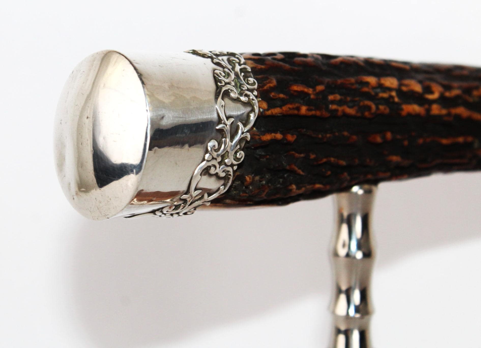 Made with a large English Stag horn handle and a sterling silver capped end, the bell above the corkscrew is a Walker Company design from 1900, which has a wire breaker and cap-lifter. The worm (corkscrew) is a bladed style, with the outer edge designed to cut through the cork with ease. Above the bell is a decorative collar that covers the shaft, which attaches to the horn.