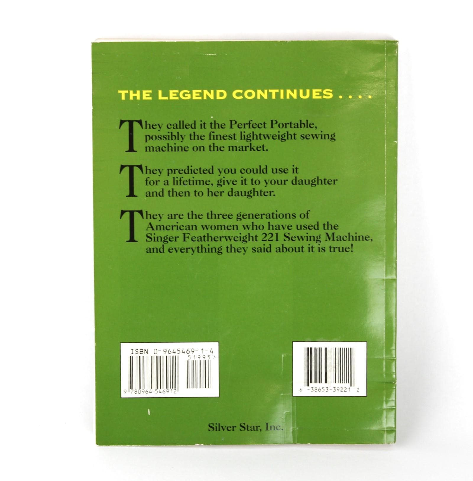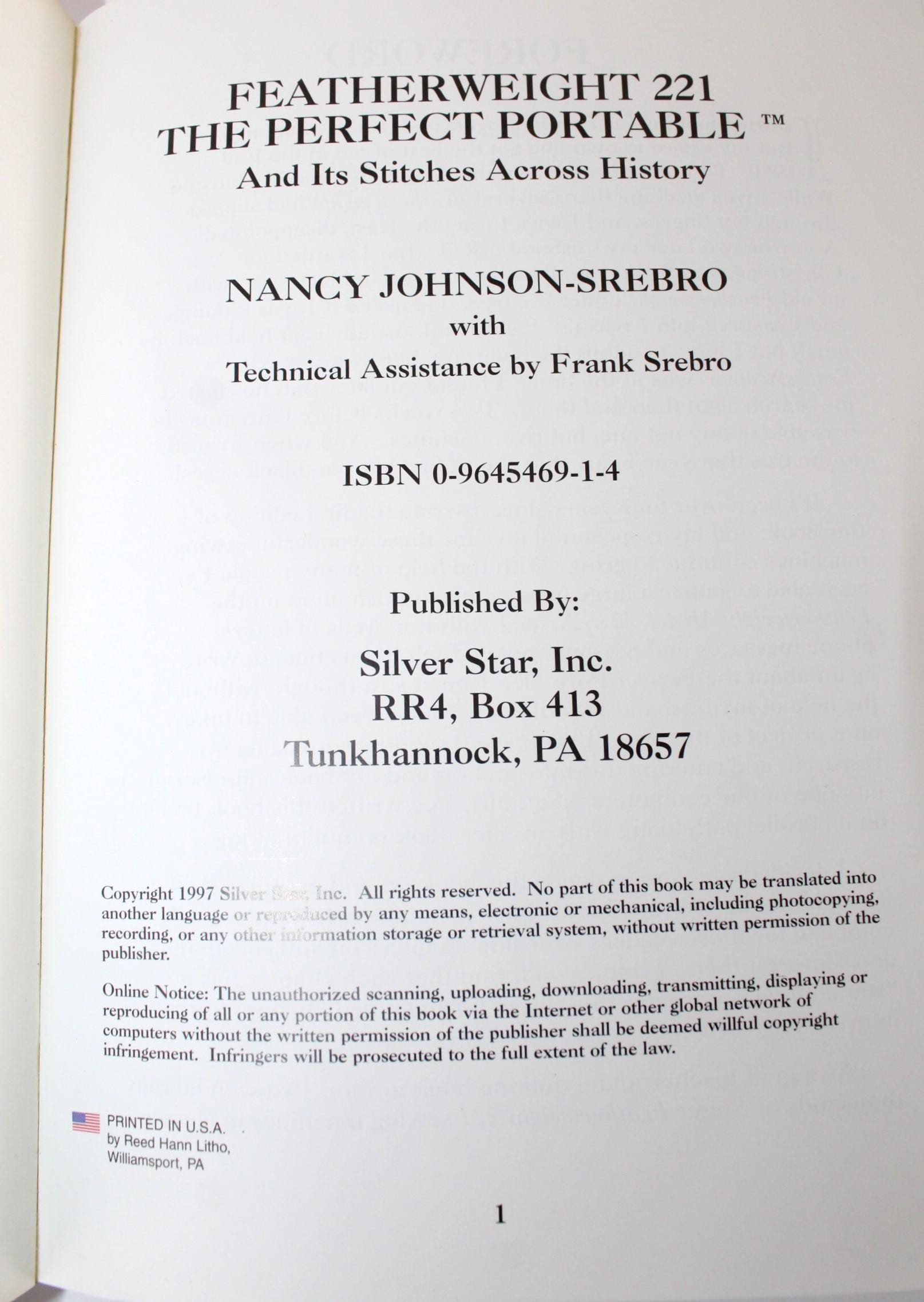 Original edition of Featherweight 221, The Perfect Portable, and Its Stitches Across History. Nancy Johnson-Srebro and Frank Srebro published this amazing book in 1997. Published by Silver Star Inc. in Tunkhannock, PA.