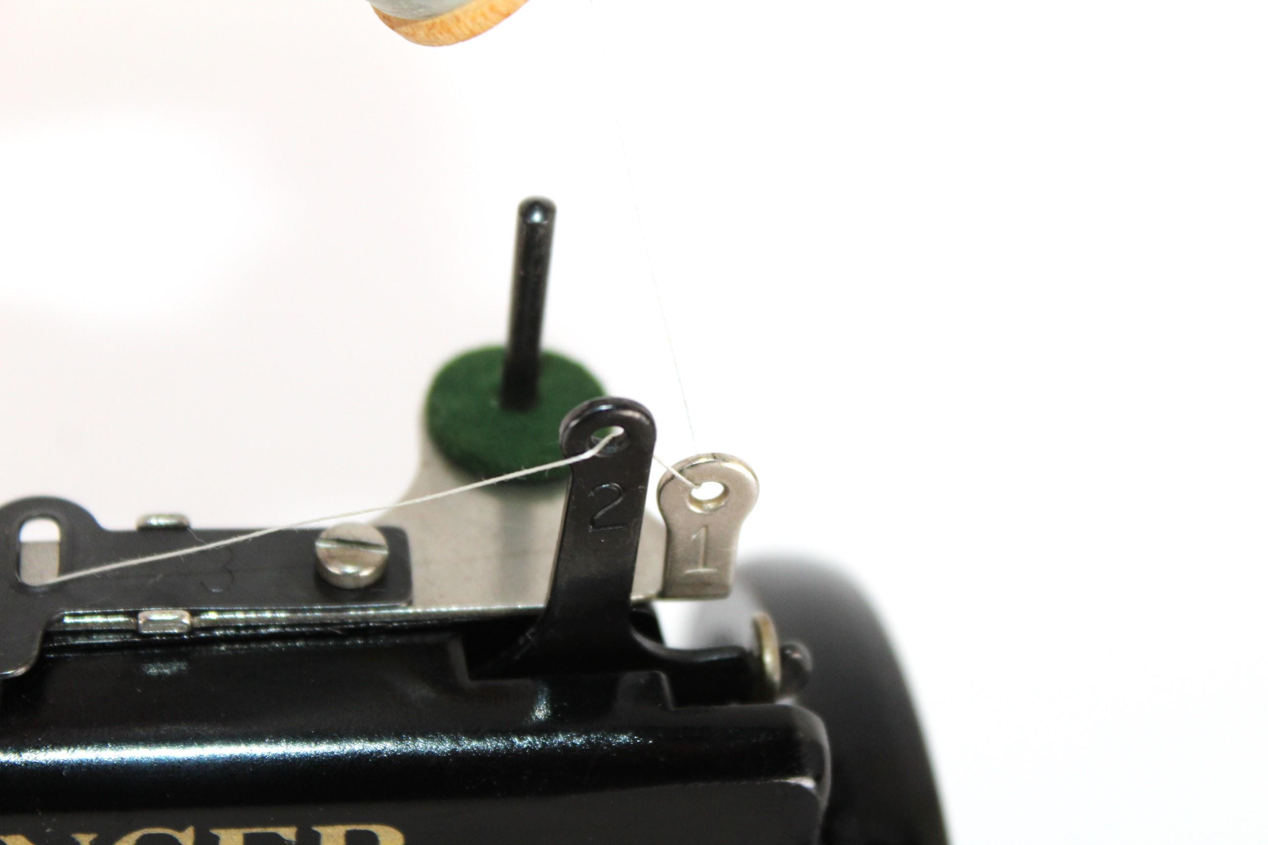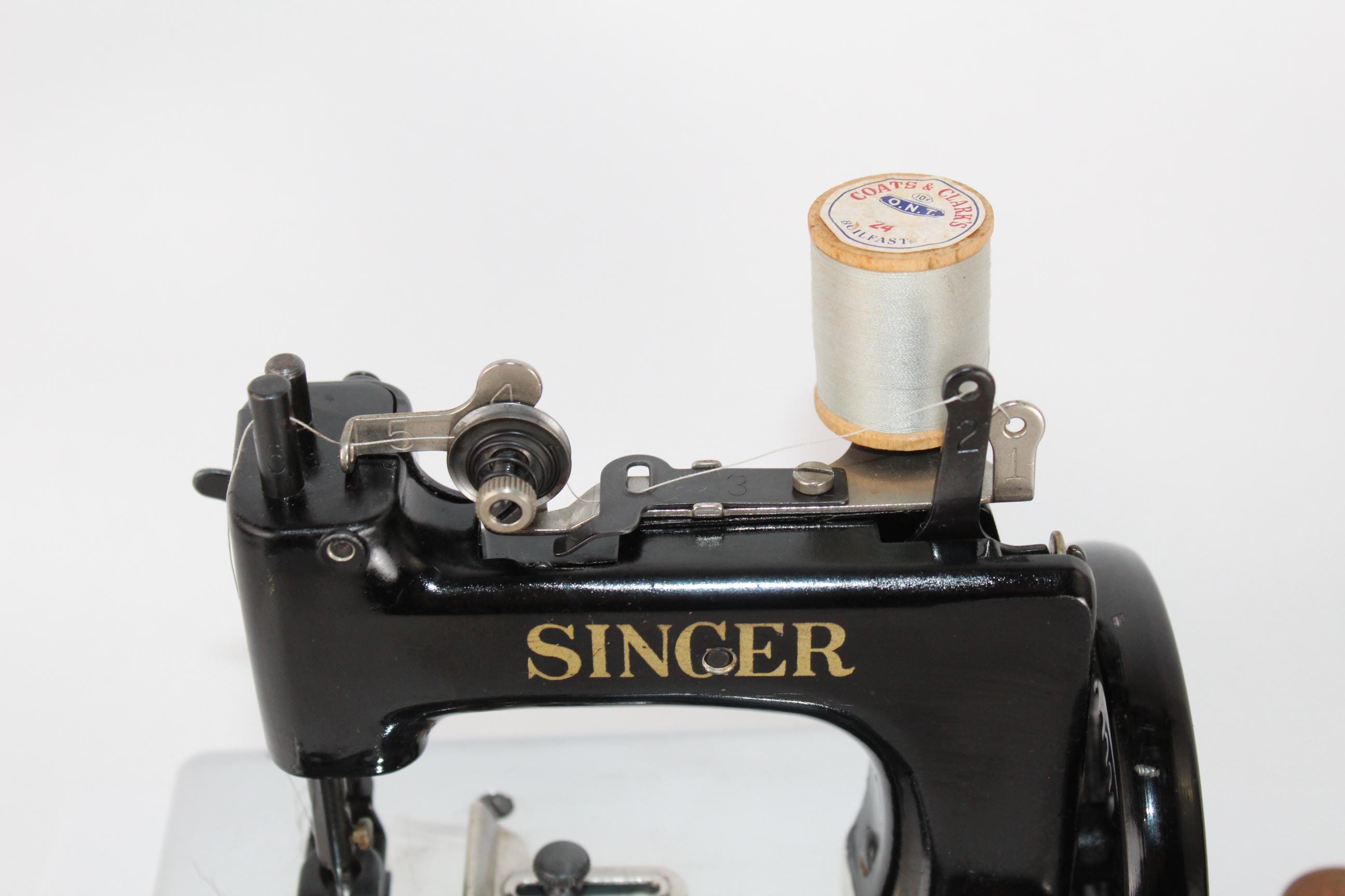 This machine is finished in the Singer classic black with gold trim. It operates smoothly. The thread running is simple on this machine, with all the parts numbered 1 through 5, and down to the needle to thread this little machine.