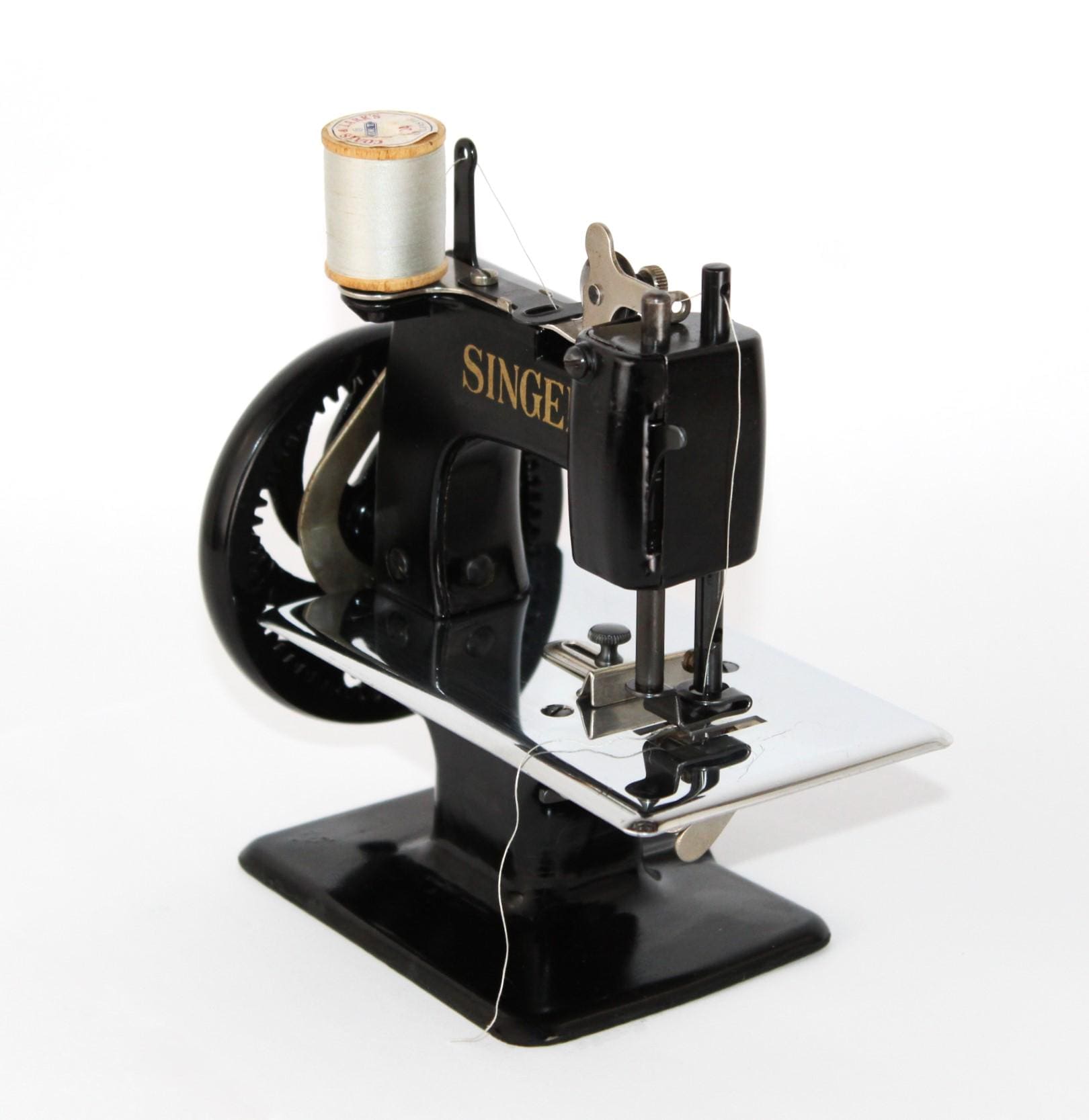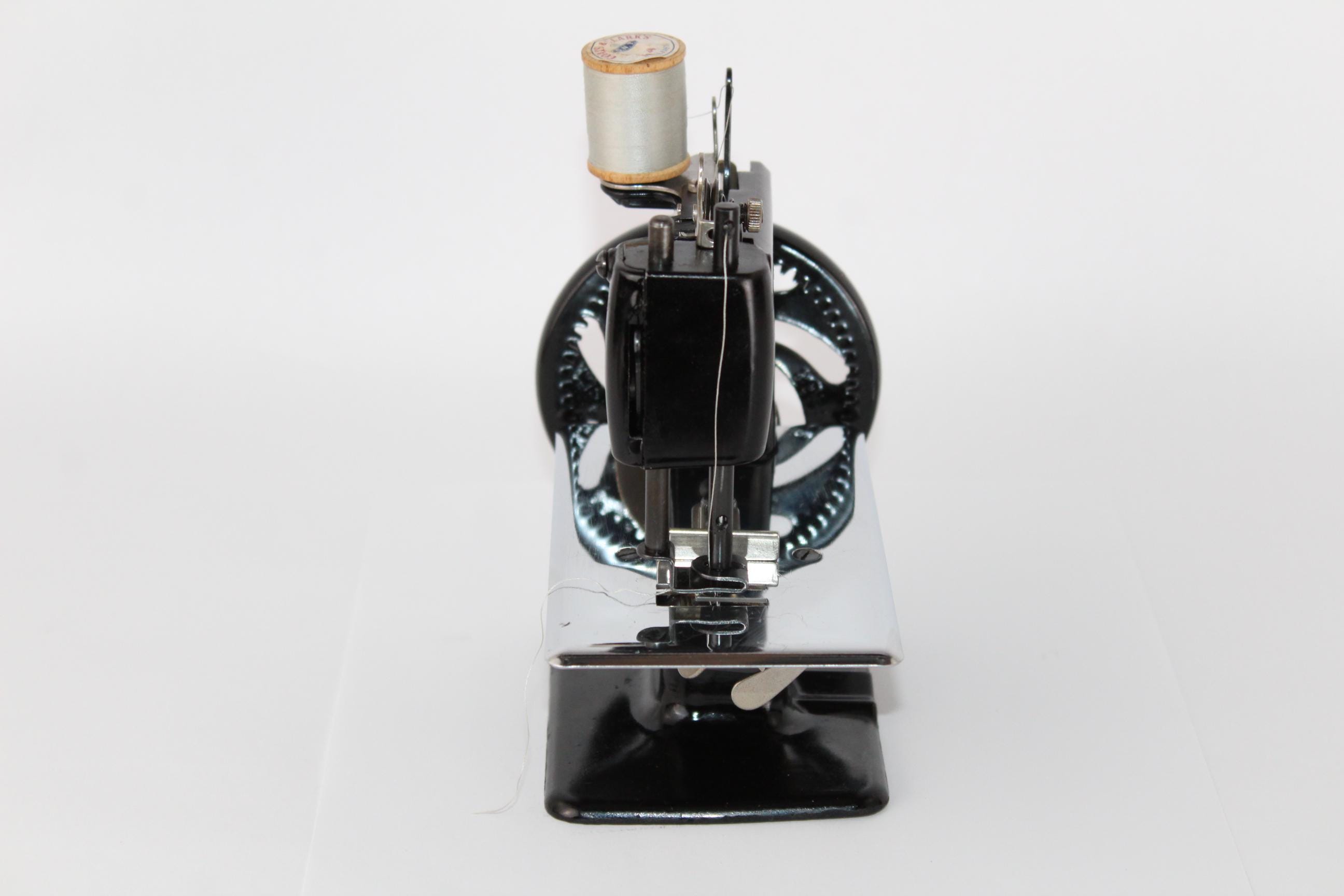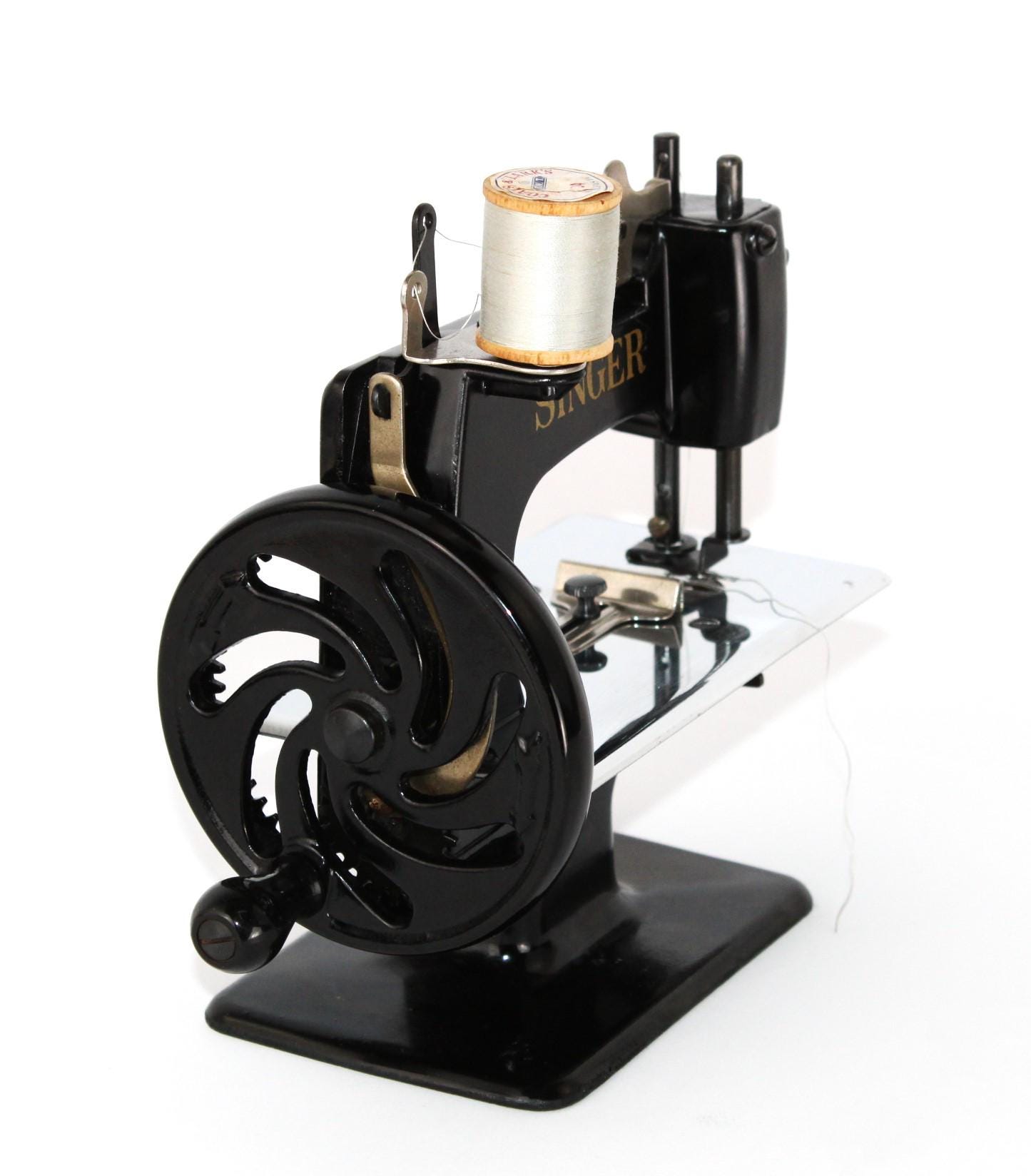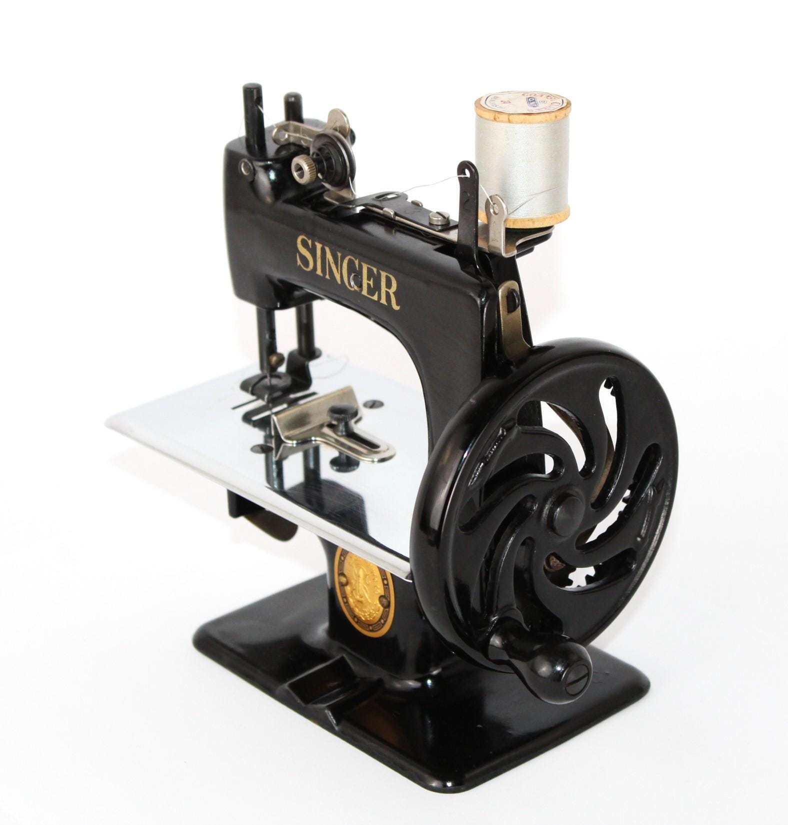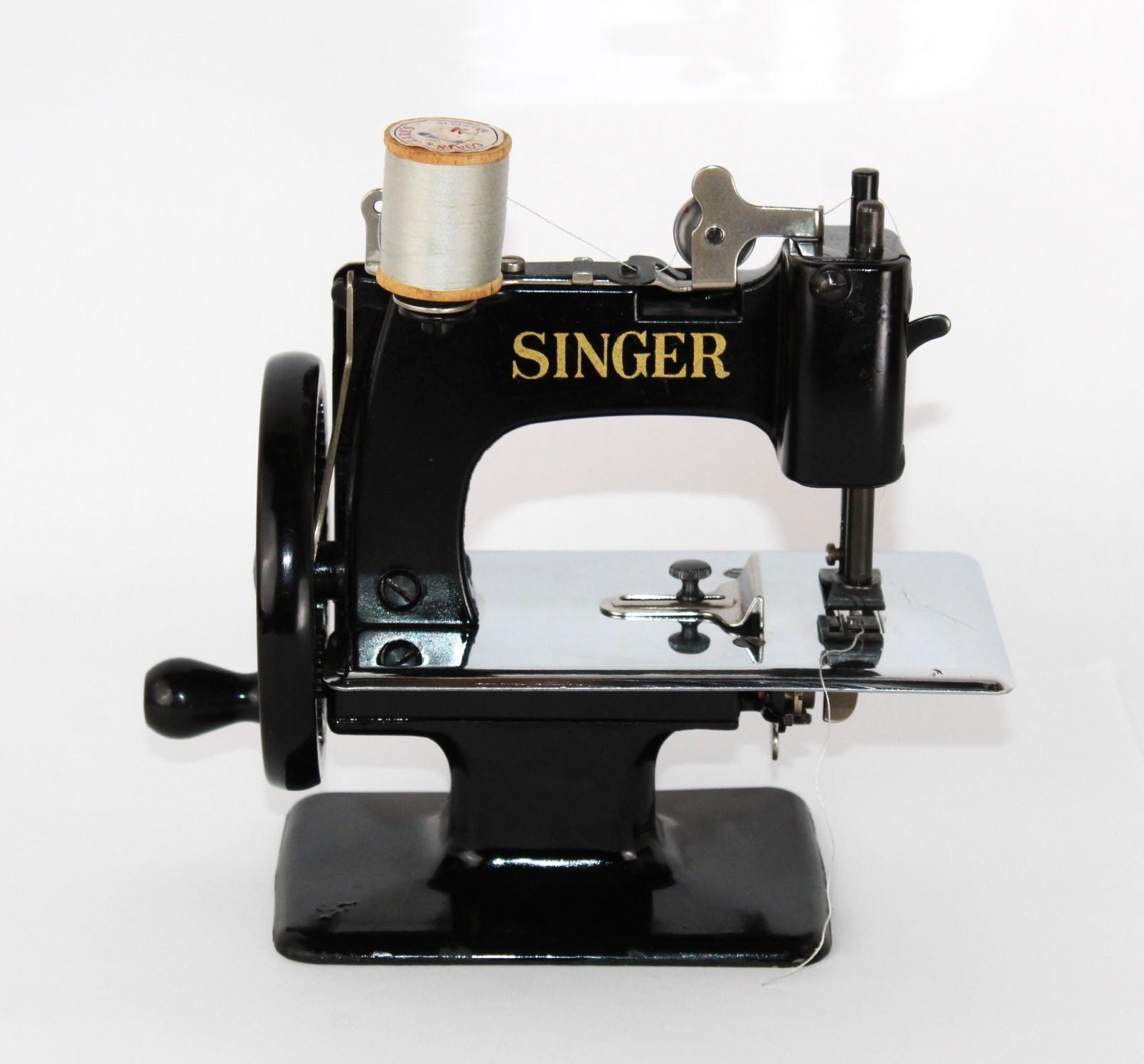 A wonderful child-sized sewing machine, made by Singer Manufacturing Company and manufactured in the USA. This is a fully Functional hand-crank sewing Machine in toy size. Originally patented in 1910 and manufactured until 1975, these were known as the most popular toy sewing machines ever made. This is the 1950s model, which has a thicker base column, although it still uses the same mechanics as its predecessor of 1910.