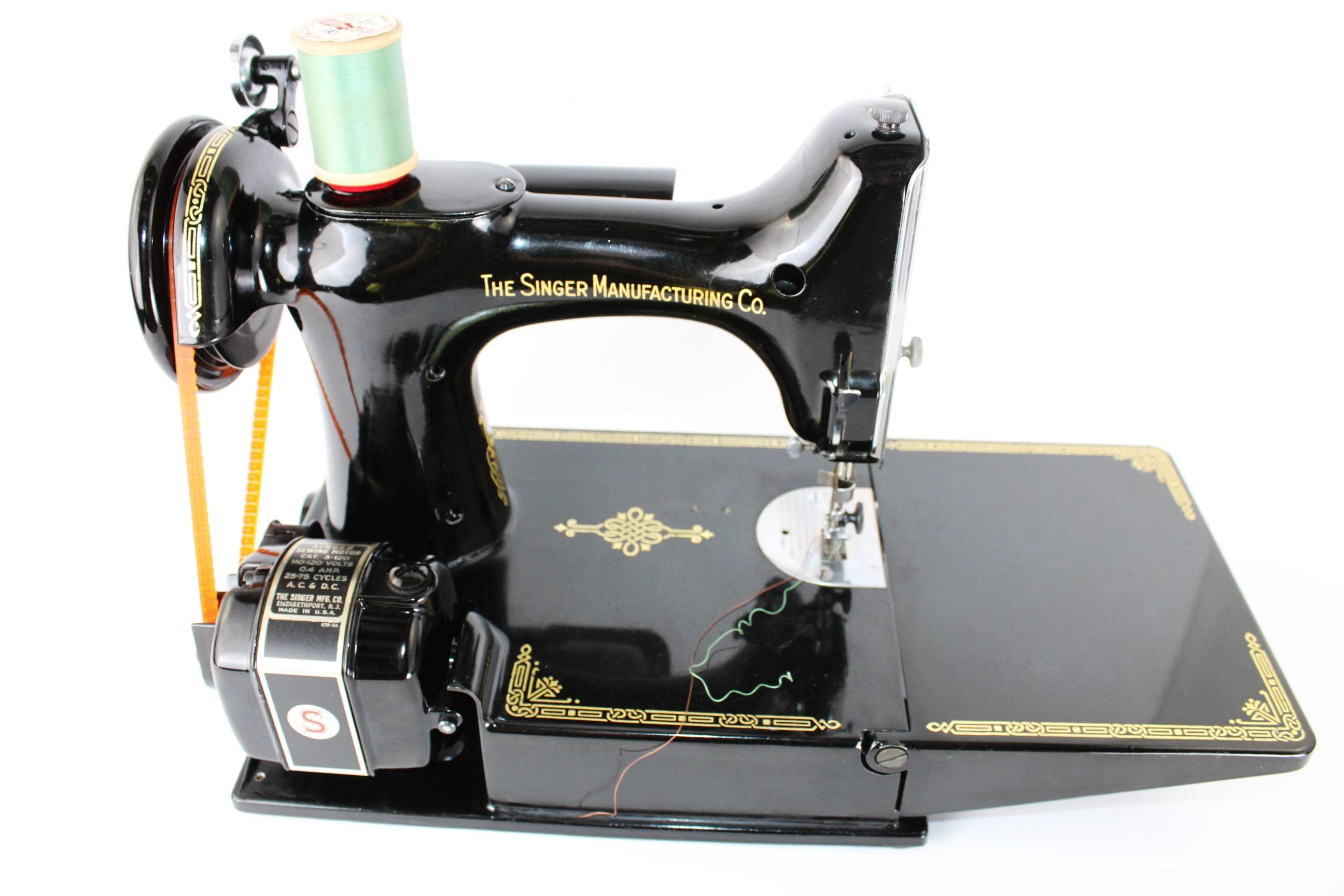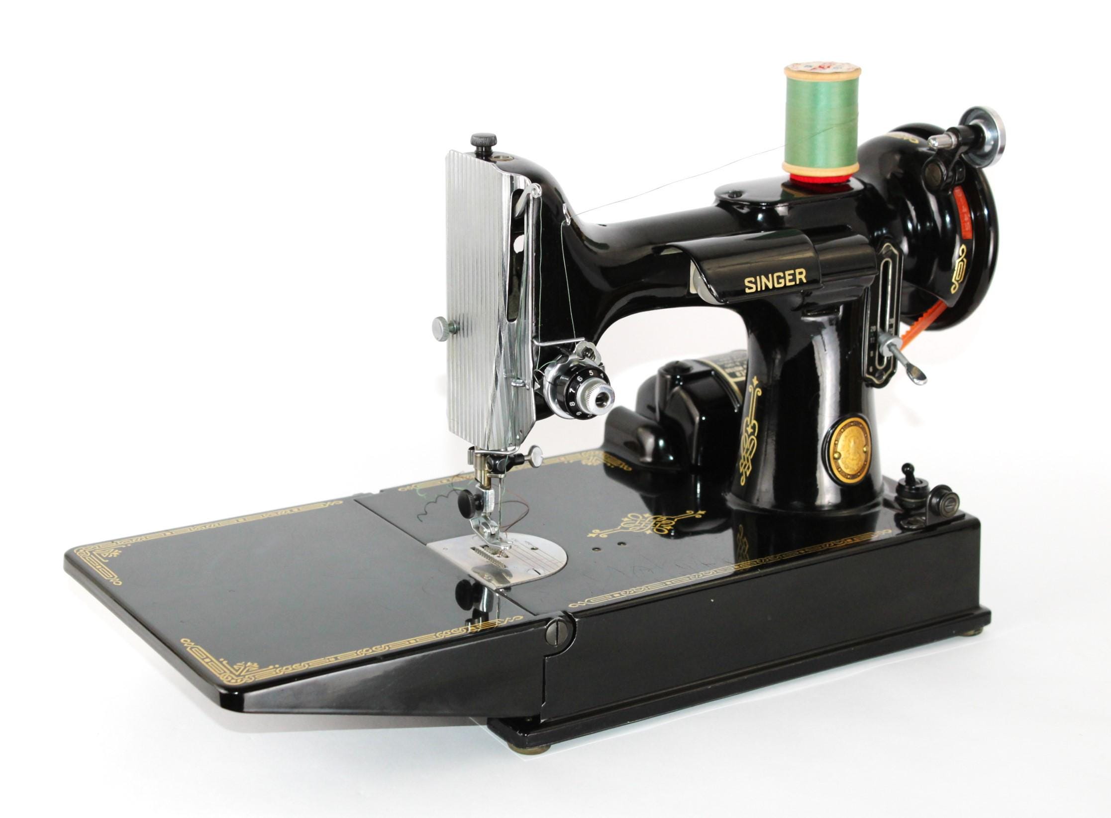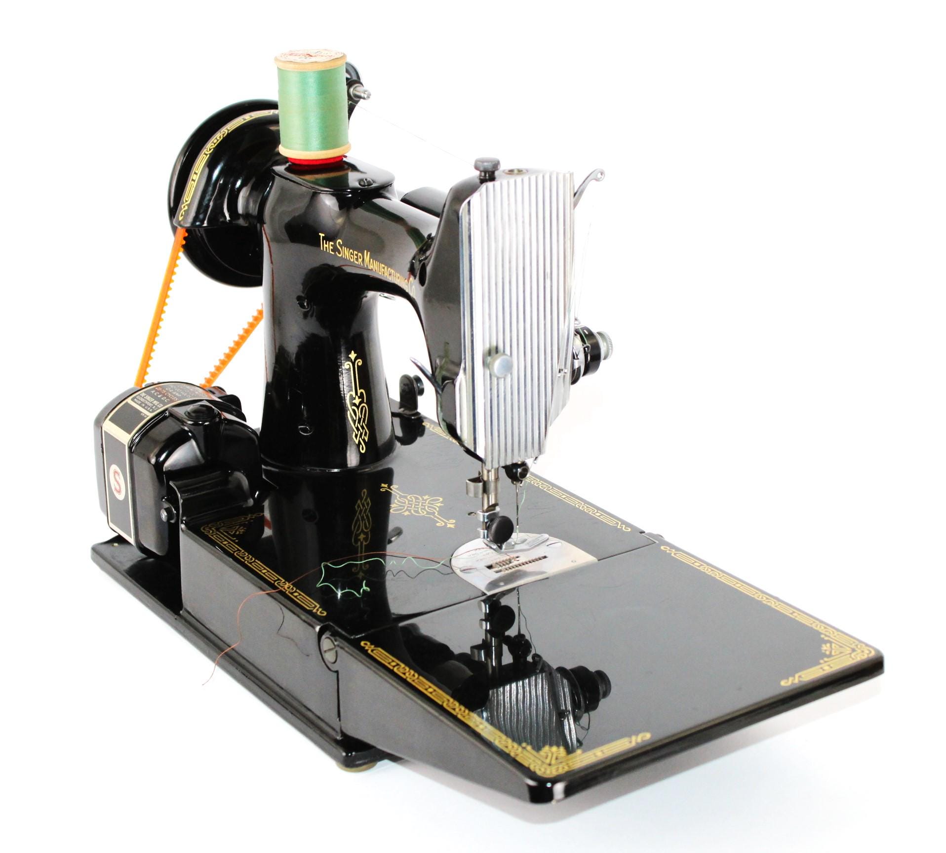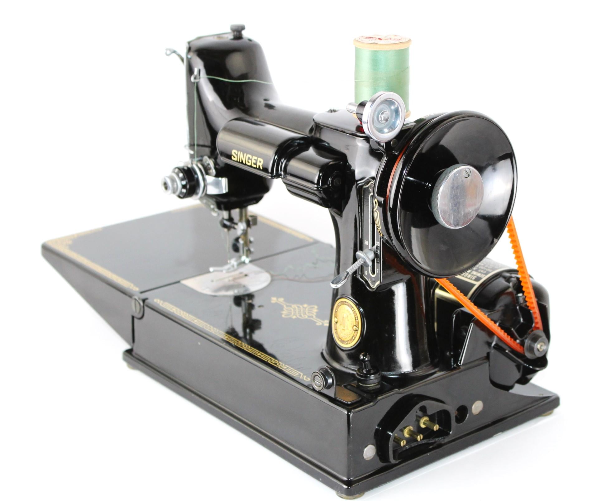 The machine is finished in that classic deep, gorgeous, shiny Black featherweight paint, gold decals, and chrome trim.