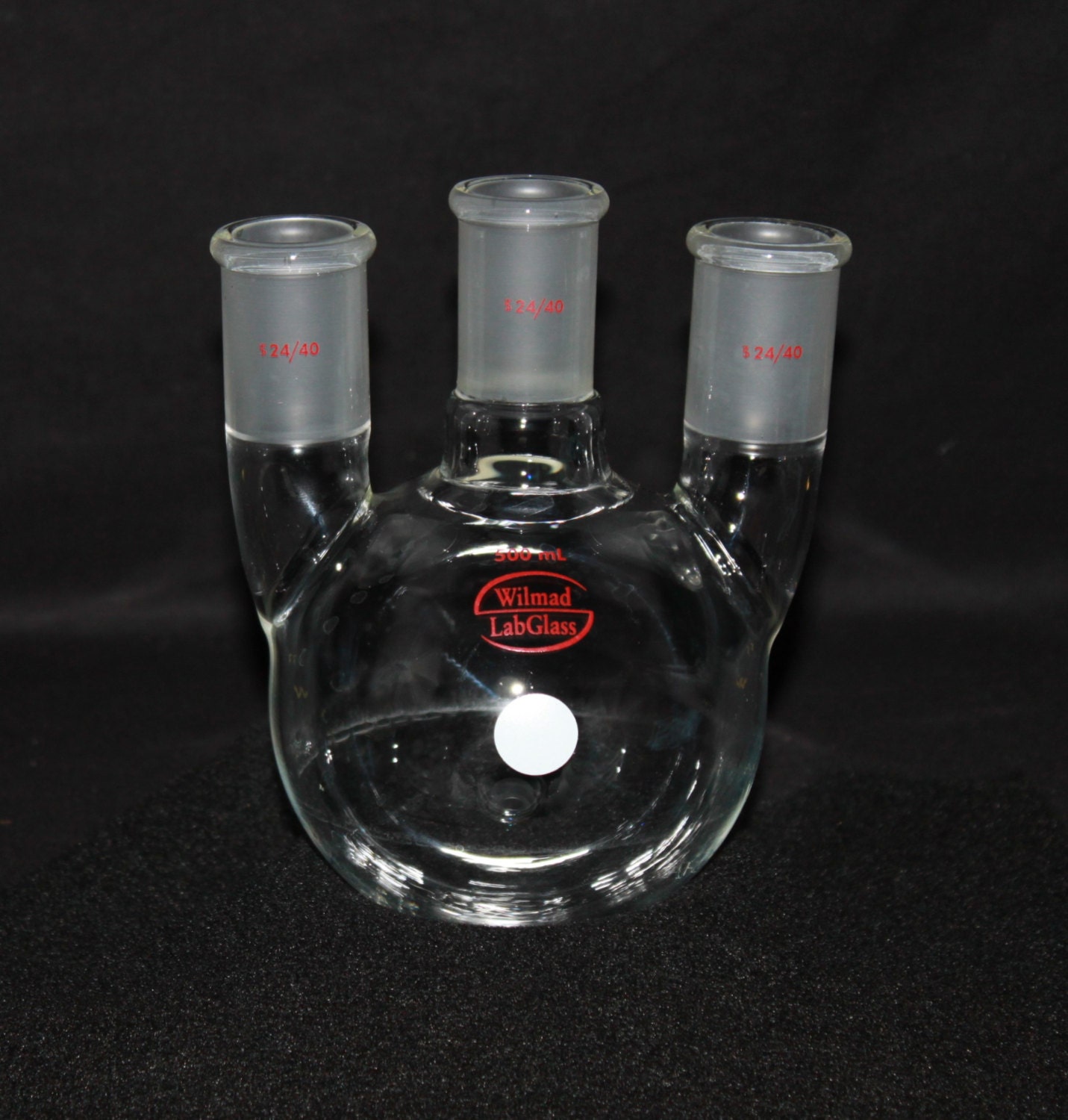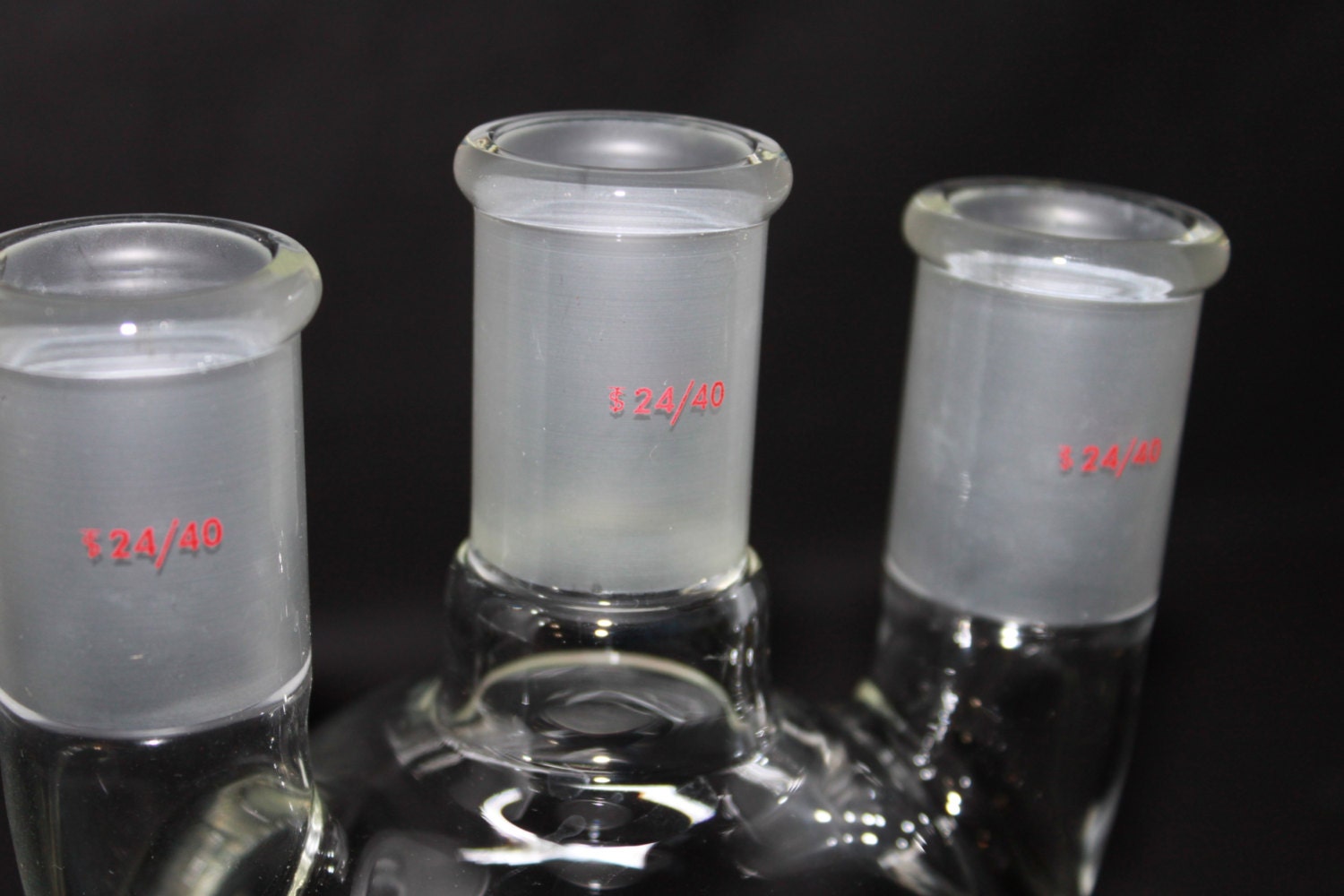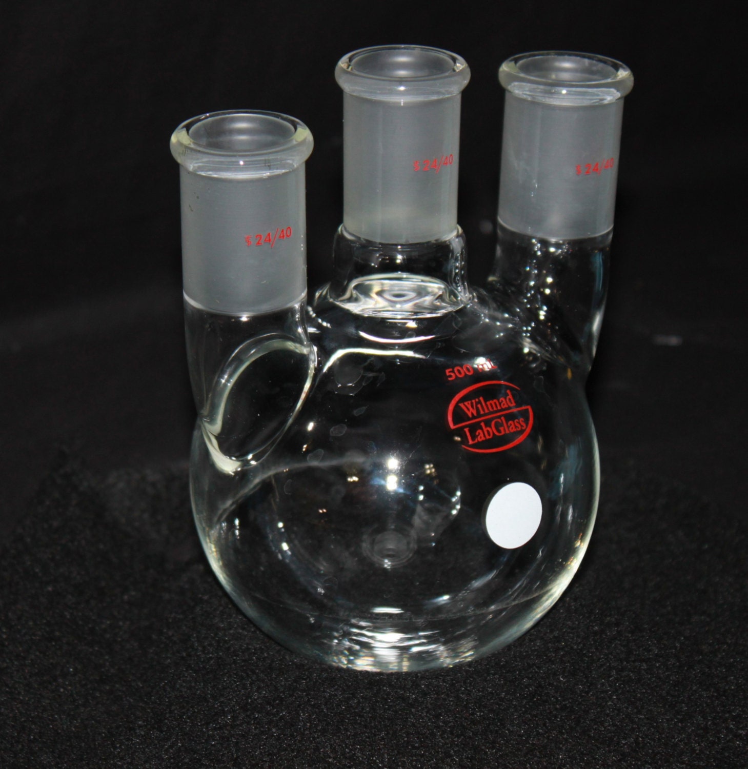 We have for sale a Vintage Wilmad three vertical neck 500mL distilling flask with 24/40 Ground Glass Joints (catalog # C-4950)