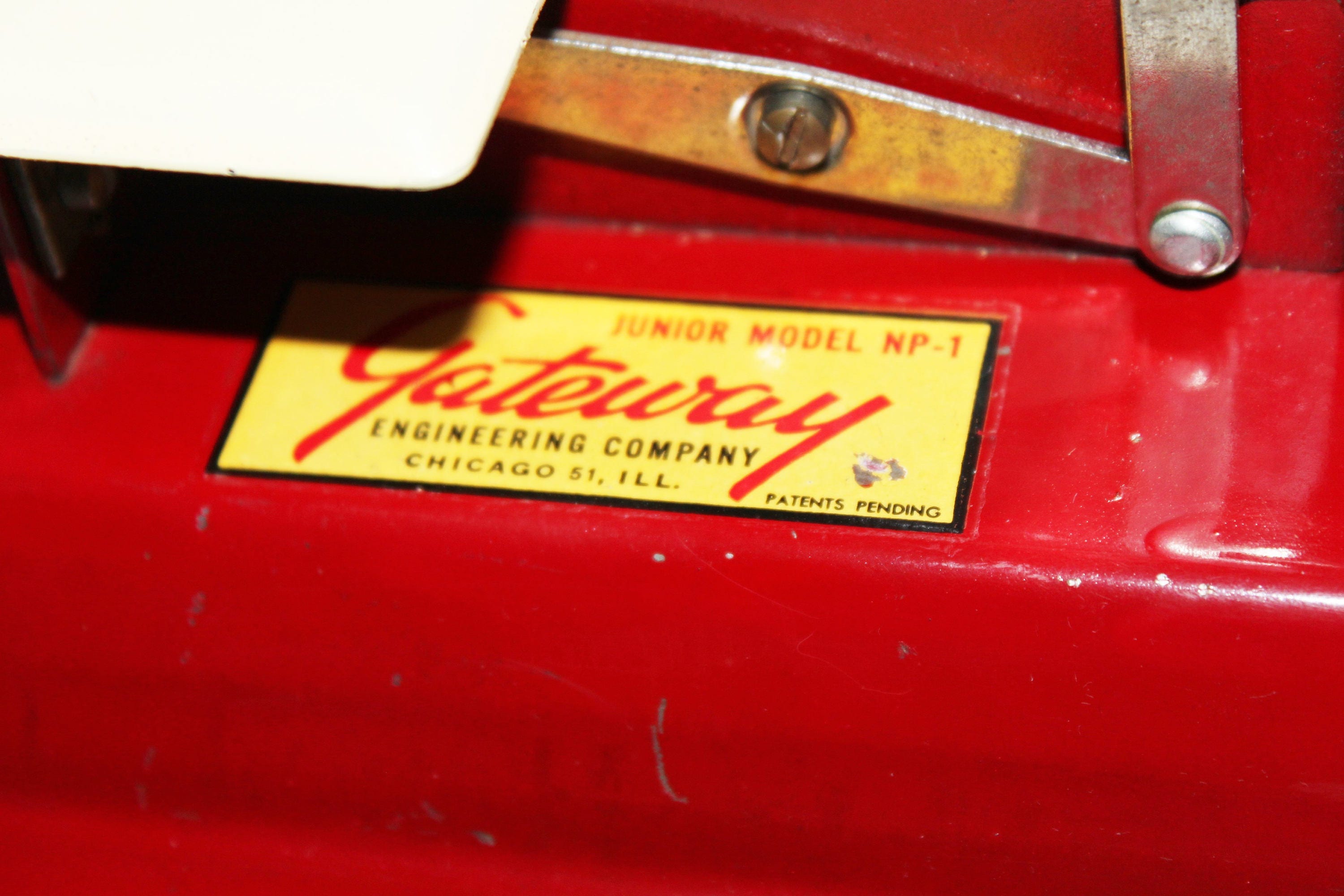 We have for sale a Vintage 1950s Gateway Junior Model NP-1 Toy Sewing Machine, Bright Red