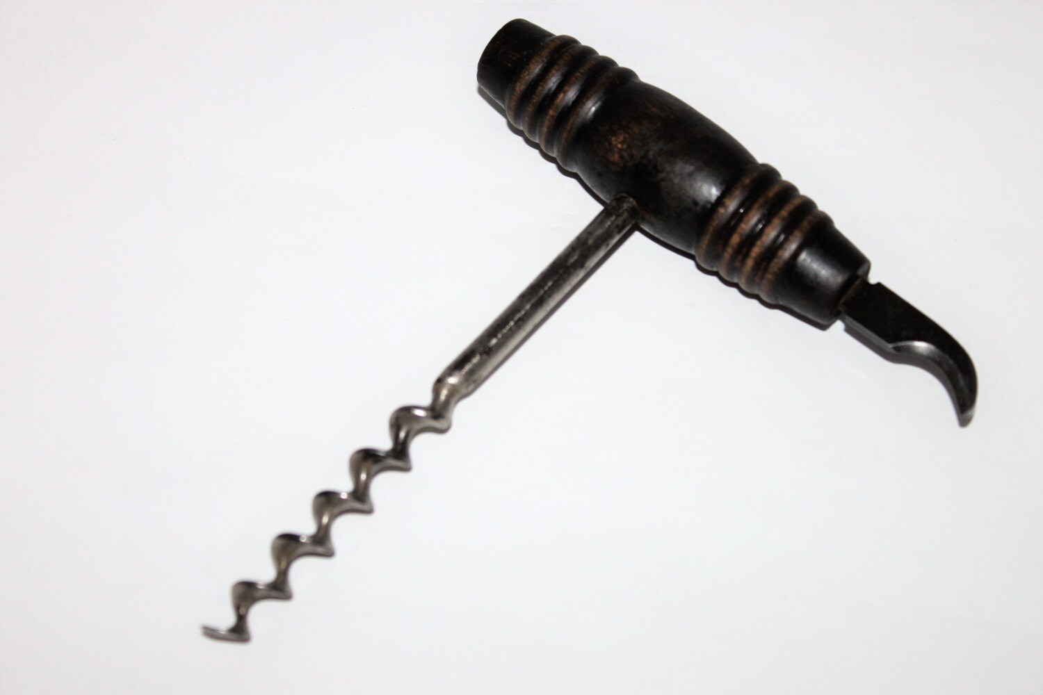 We have for sale an Antique Wood Handle Straight Pull with Foil Cutter Corkscrew.