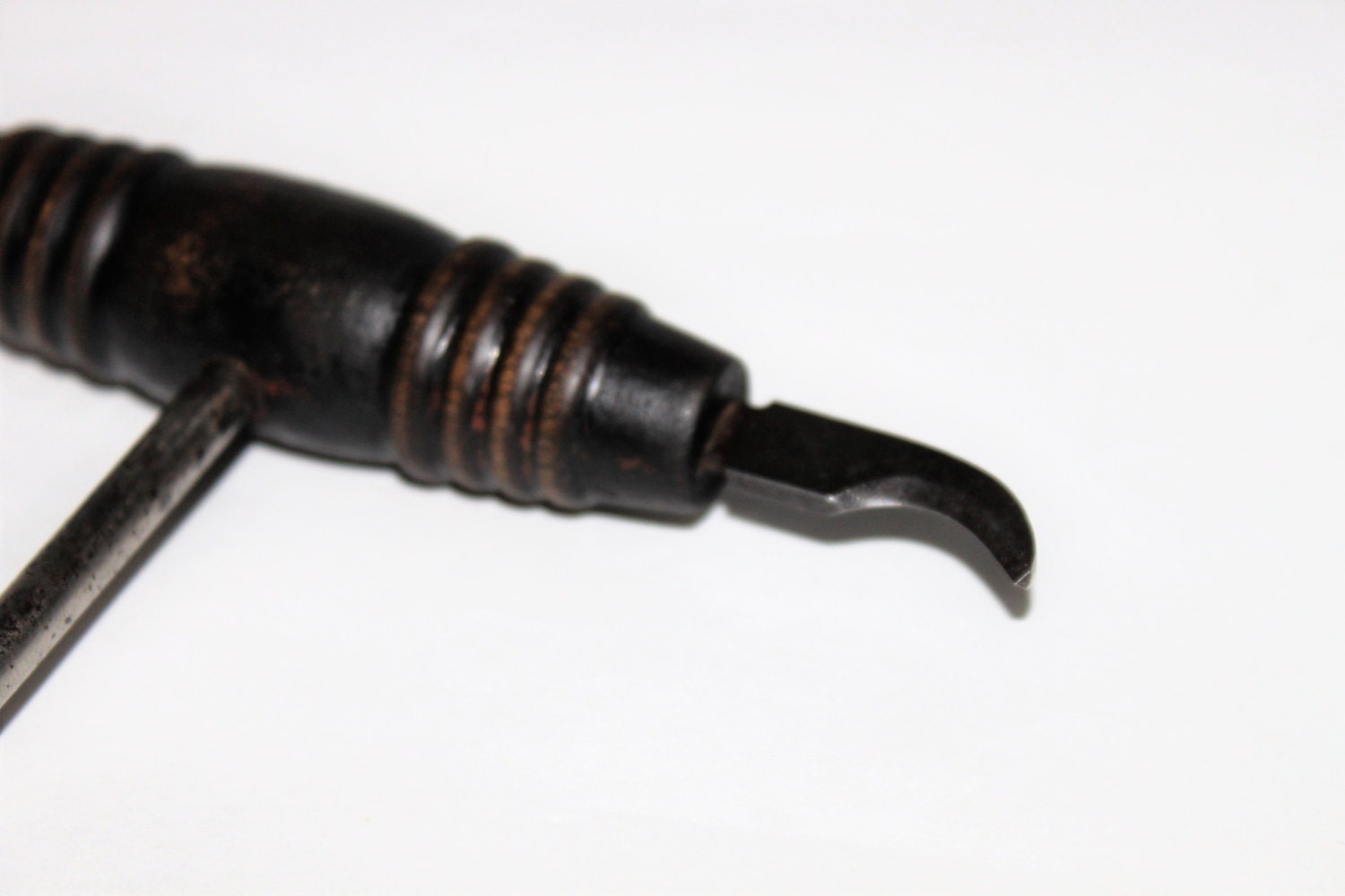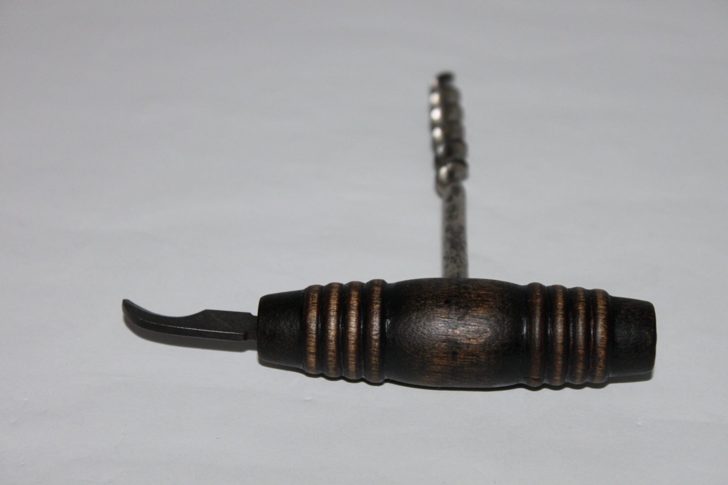 Has a decorative turned hand with foil cutter attached to one end, long straight bladed worm.