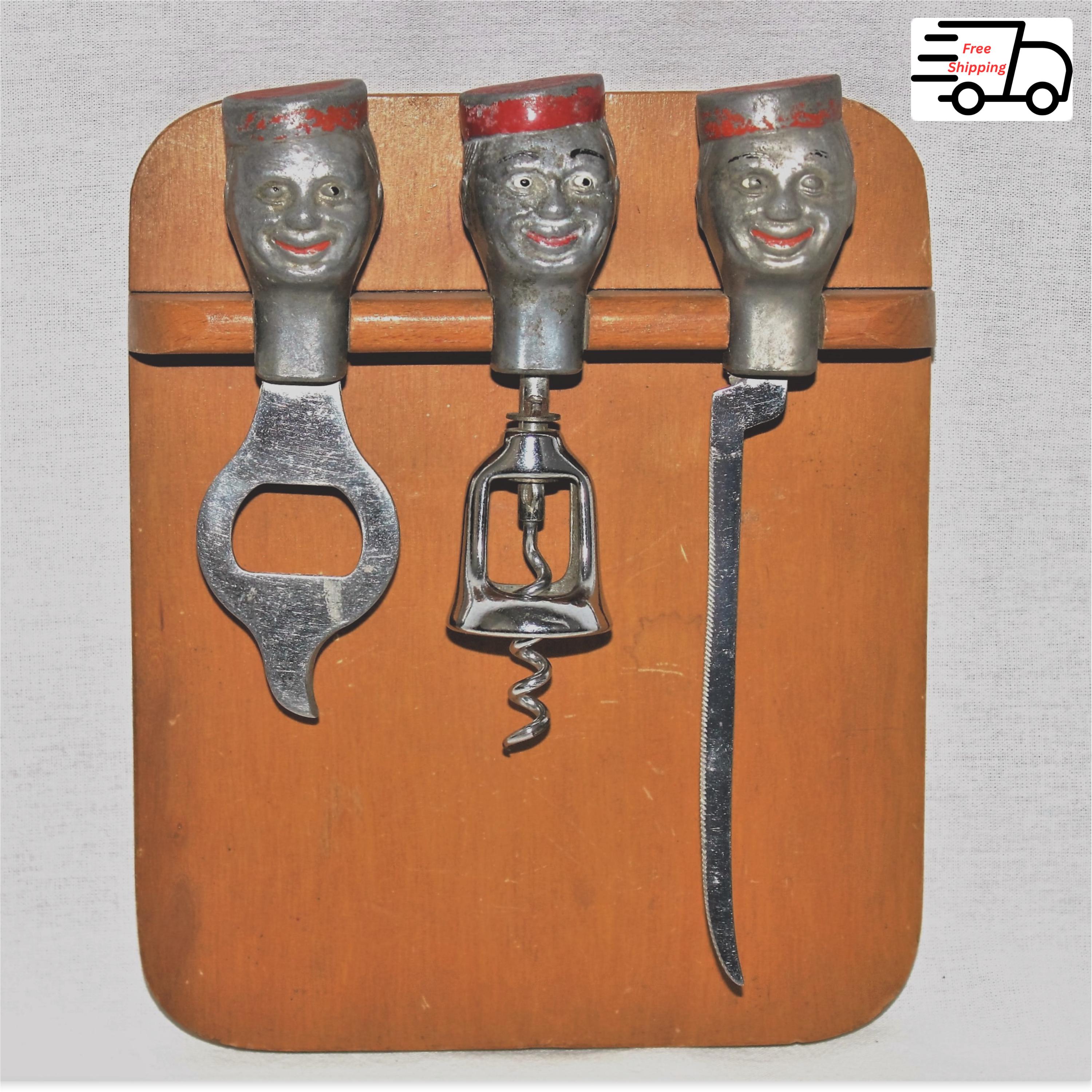 This is a rare find made in the 1950s this chipper trio includes a corkscrew, bottle opener, garnish knife with cutting board.