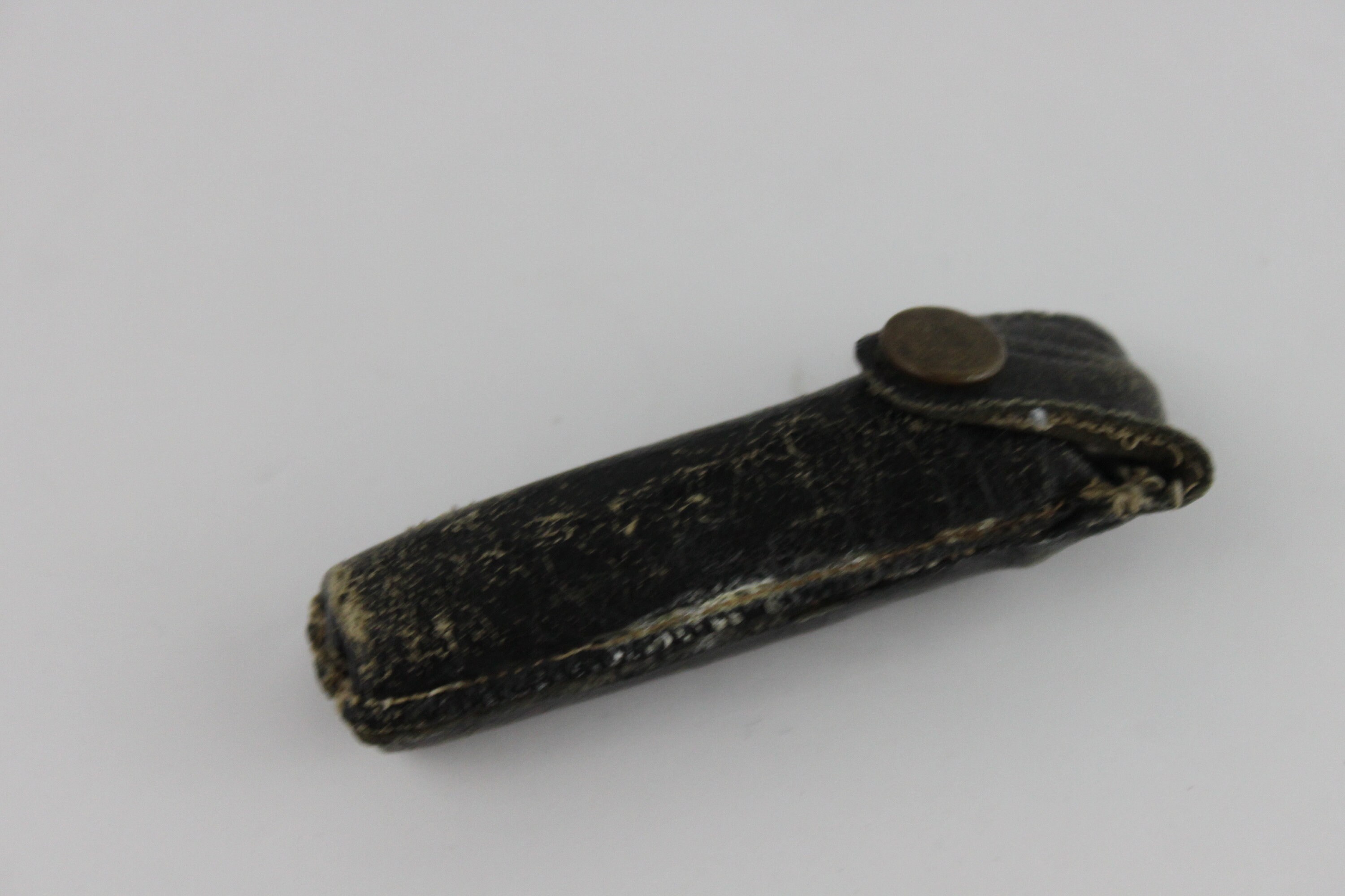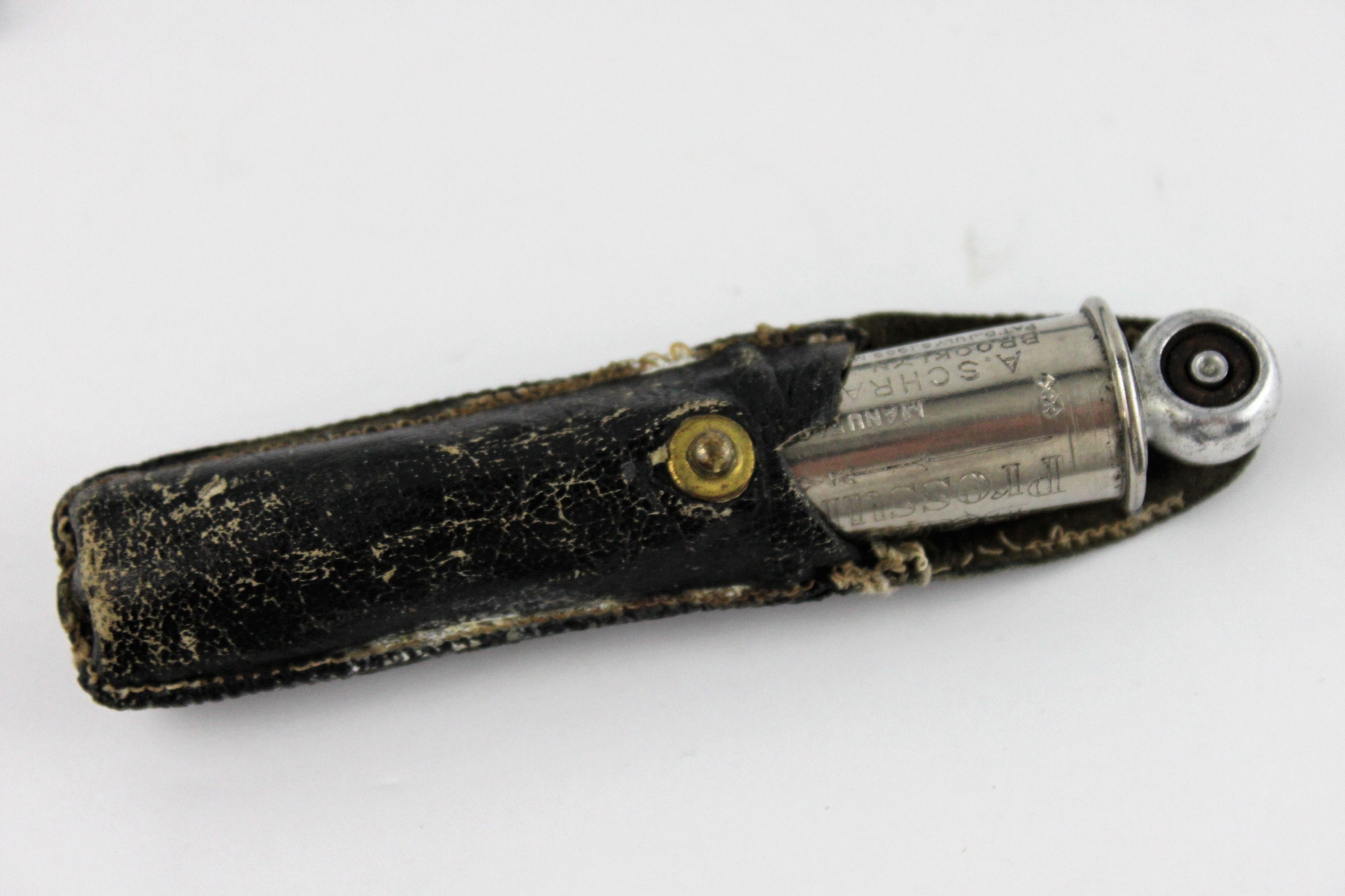 This is a great piece of American automotive nostalgia this pocket sized tire presser gauge with original leather case made by the Schrader’s Son Inc. Brooklyn N.Y. reads up to 42 pounds of presser and is in wonderful condition, made of nickel plated brass.