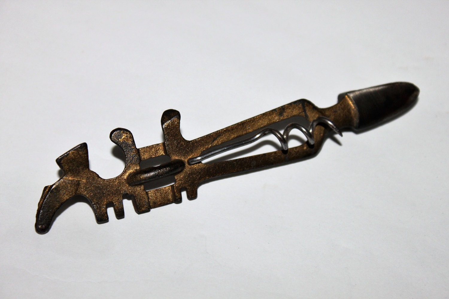 These types of multi tools were manufactured in the mid to late 1800s this particular one has a corkscrew, glass cutter and glass breakers, this was most likely used in a window shop it has all the trade tools needed for glazing window glass.