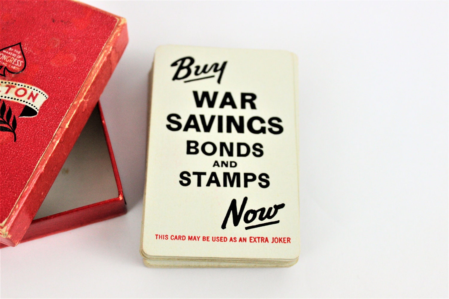 We have for sale a Deck of WWII 1940s Hamilton Congress Playing Cards with (Buy War Bonds and Stamps Now) in Original Box