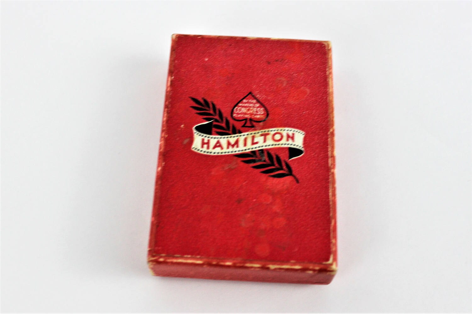 A vintage collectible full deck of Hamilton Congress playing cards from the 1940's with card stating to buy savings bonds from World War II. No tax stamp makes it a very unusual deck. Art deco image on front. Original box included.
