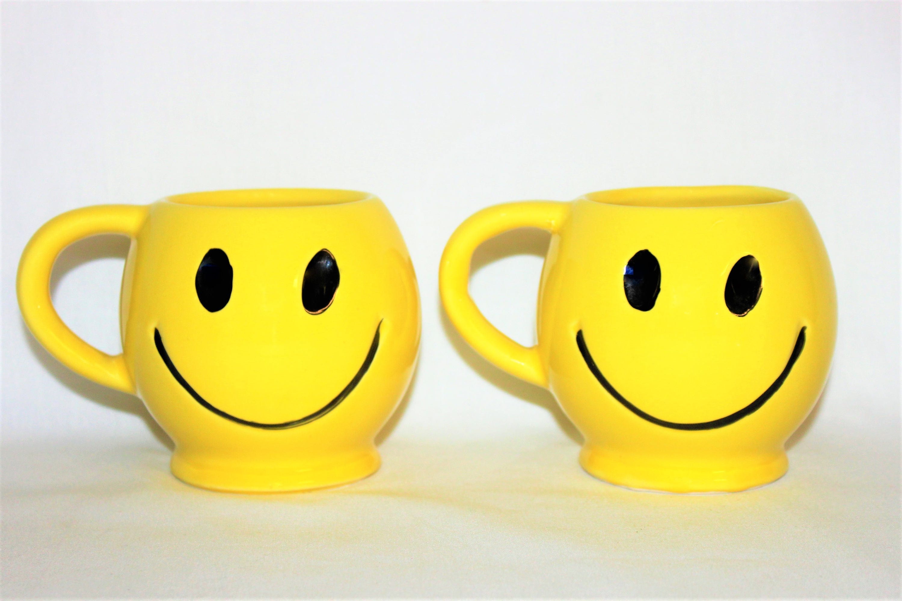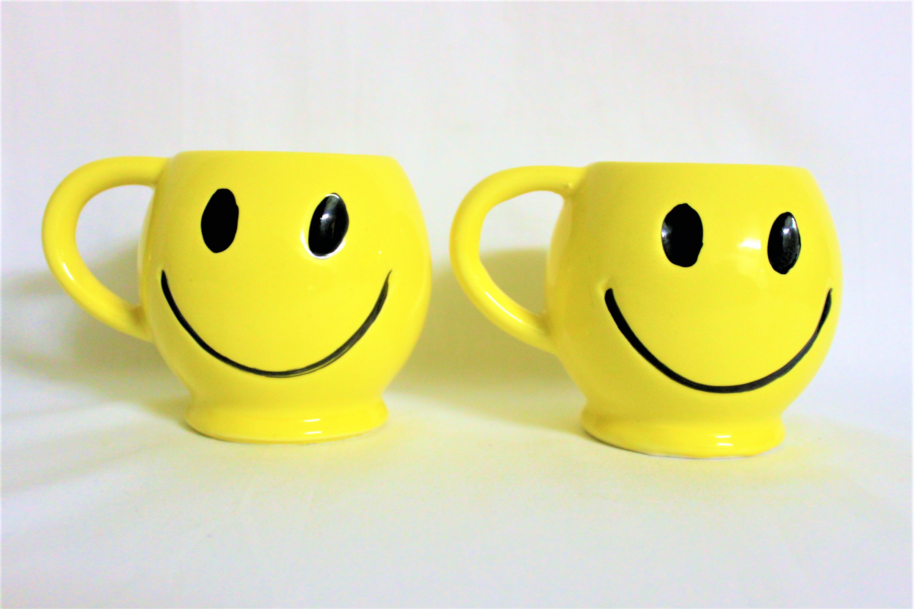 If you’re the type person that would love to wake up to your favorite tea or coffee in a vintage smiley face mug here is a pair one for home one for the office. These are made by McCoy Pottery USA marked on the bottom.
