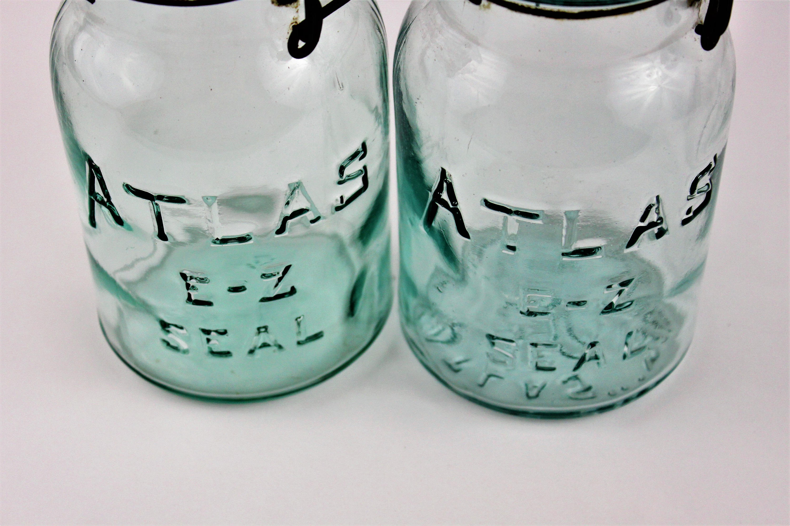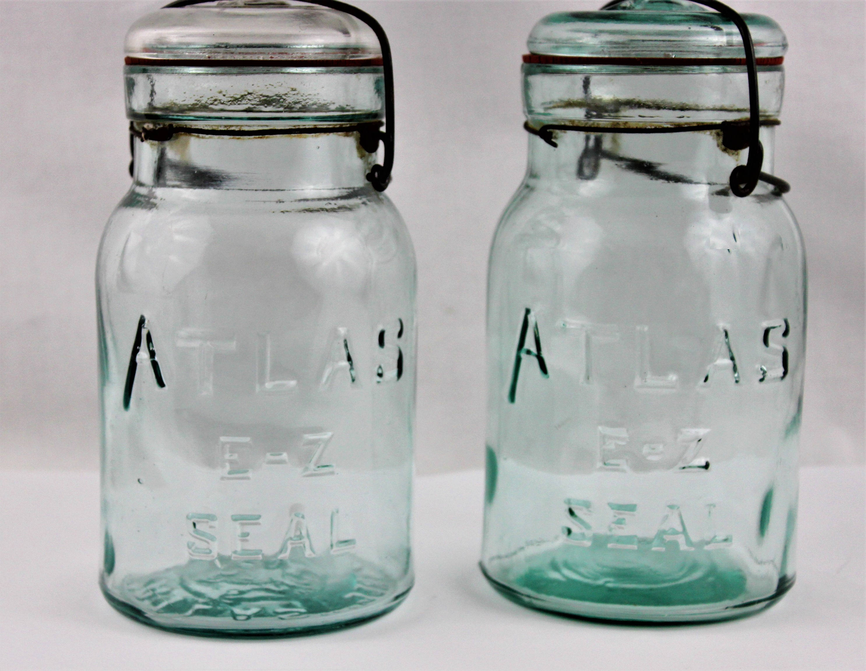 We have for sale an Antique Pair of Blue Atlas E-Z Seal Mason Jars with Glass Lids and wire Bails.