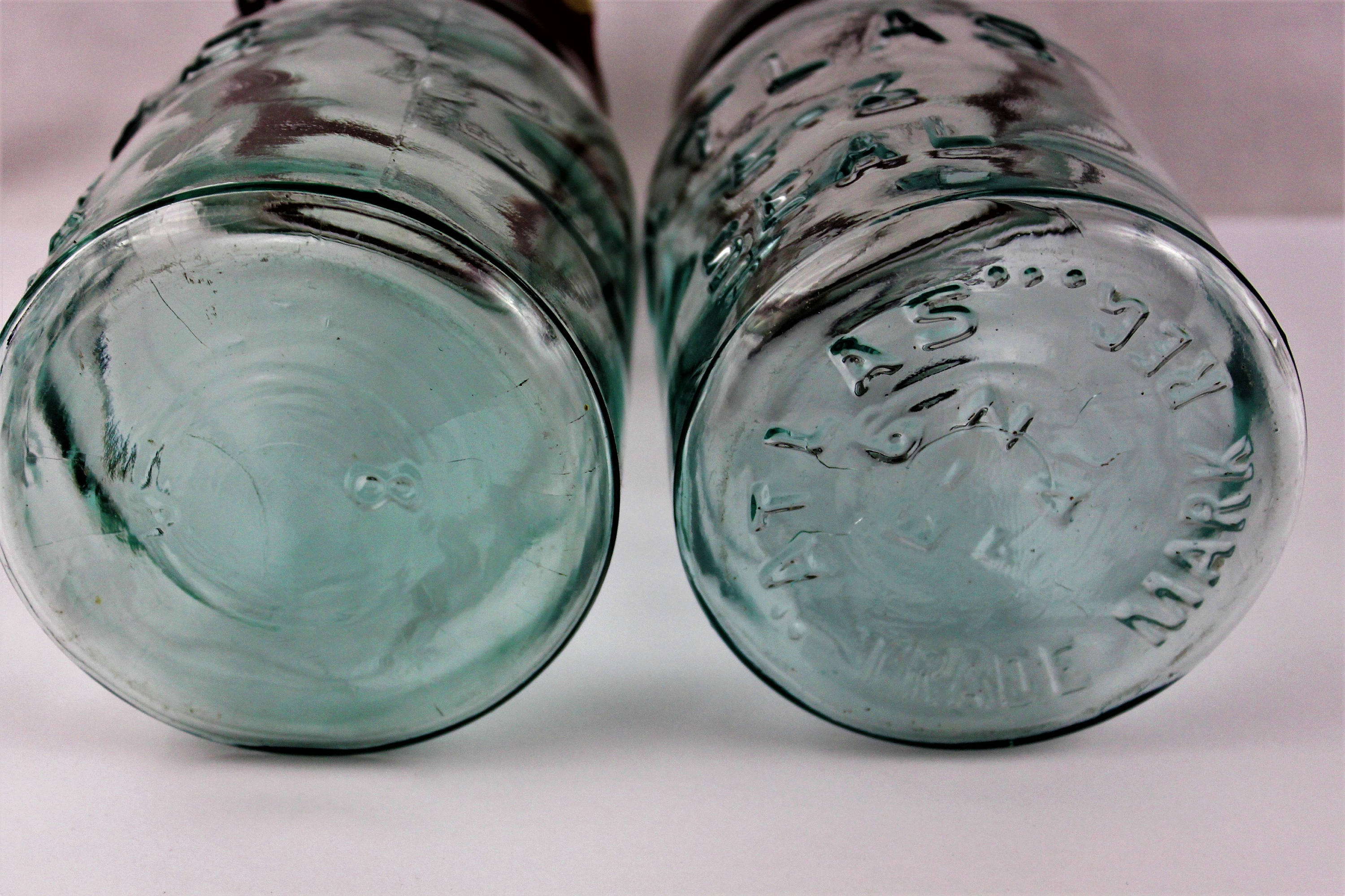 These are wonderful mason jars and will look great in your kitchen these are quart sized jars 7 ½” tall have raised letter print that reads; Atlas E-Z Seal