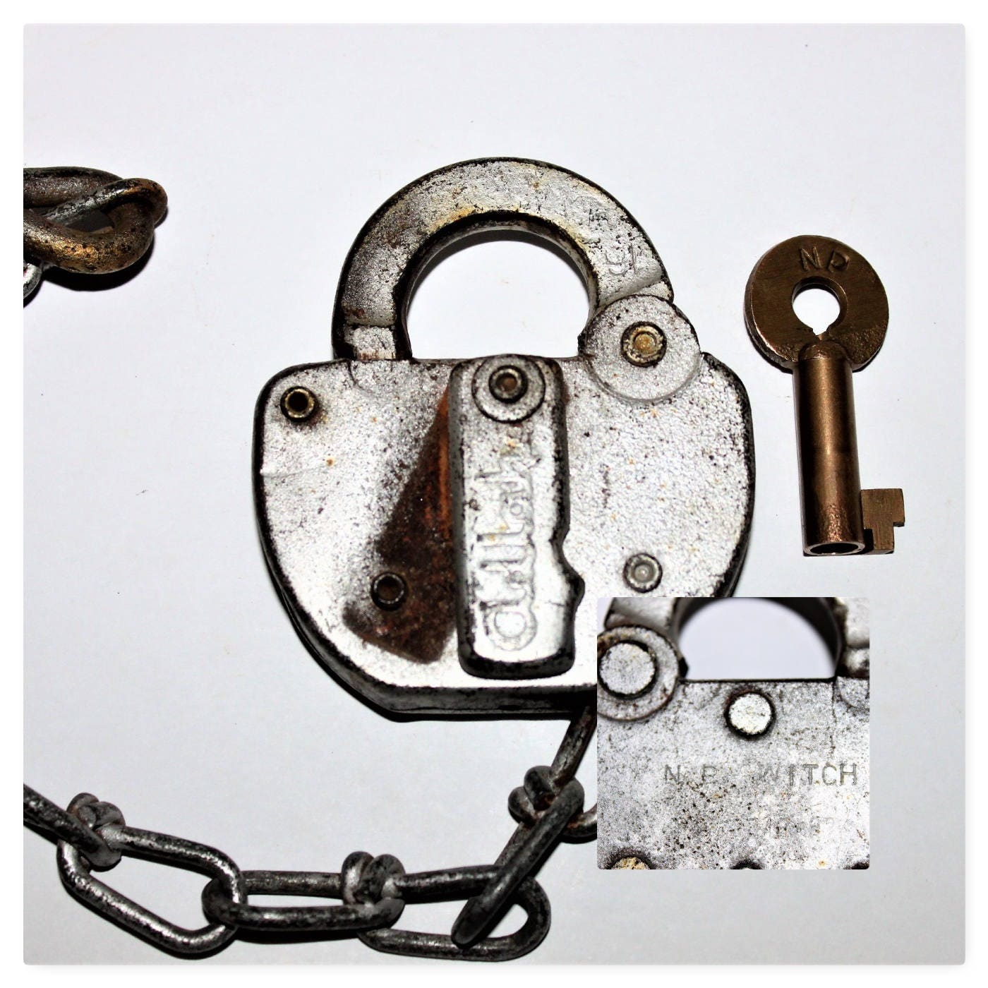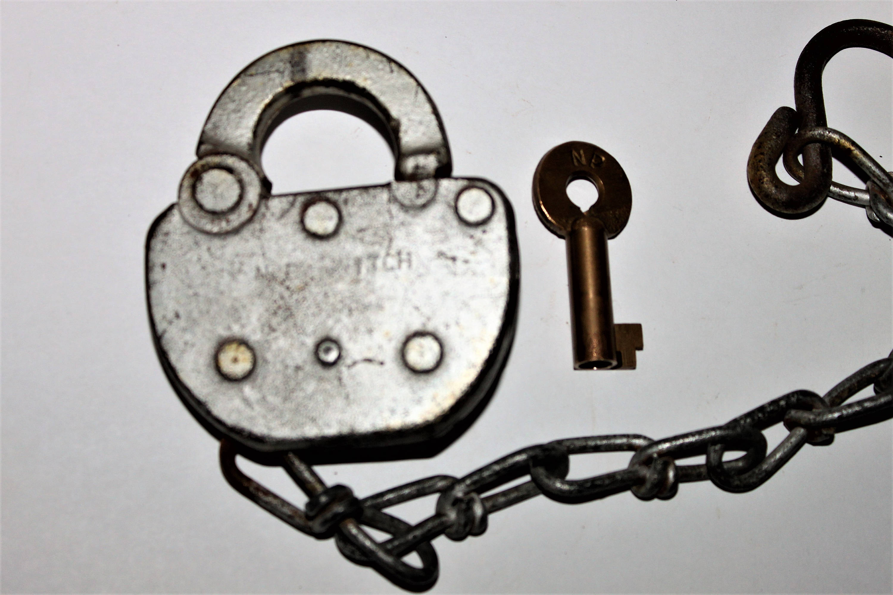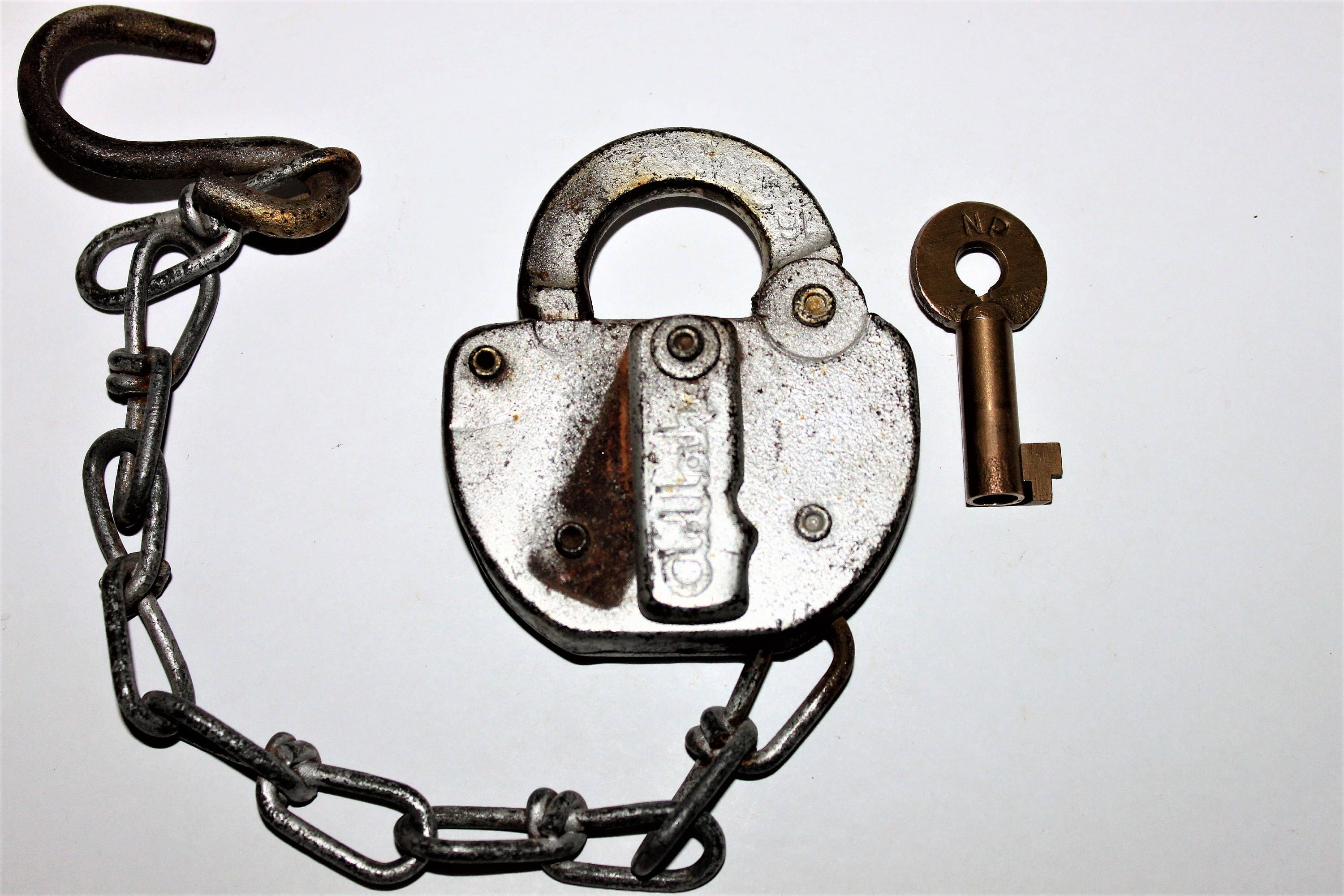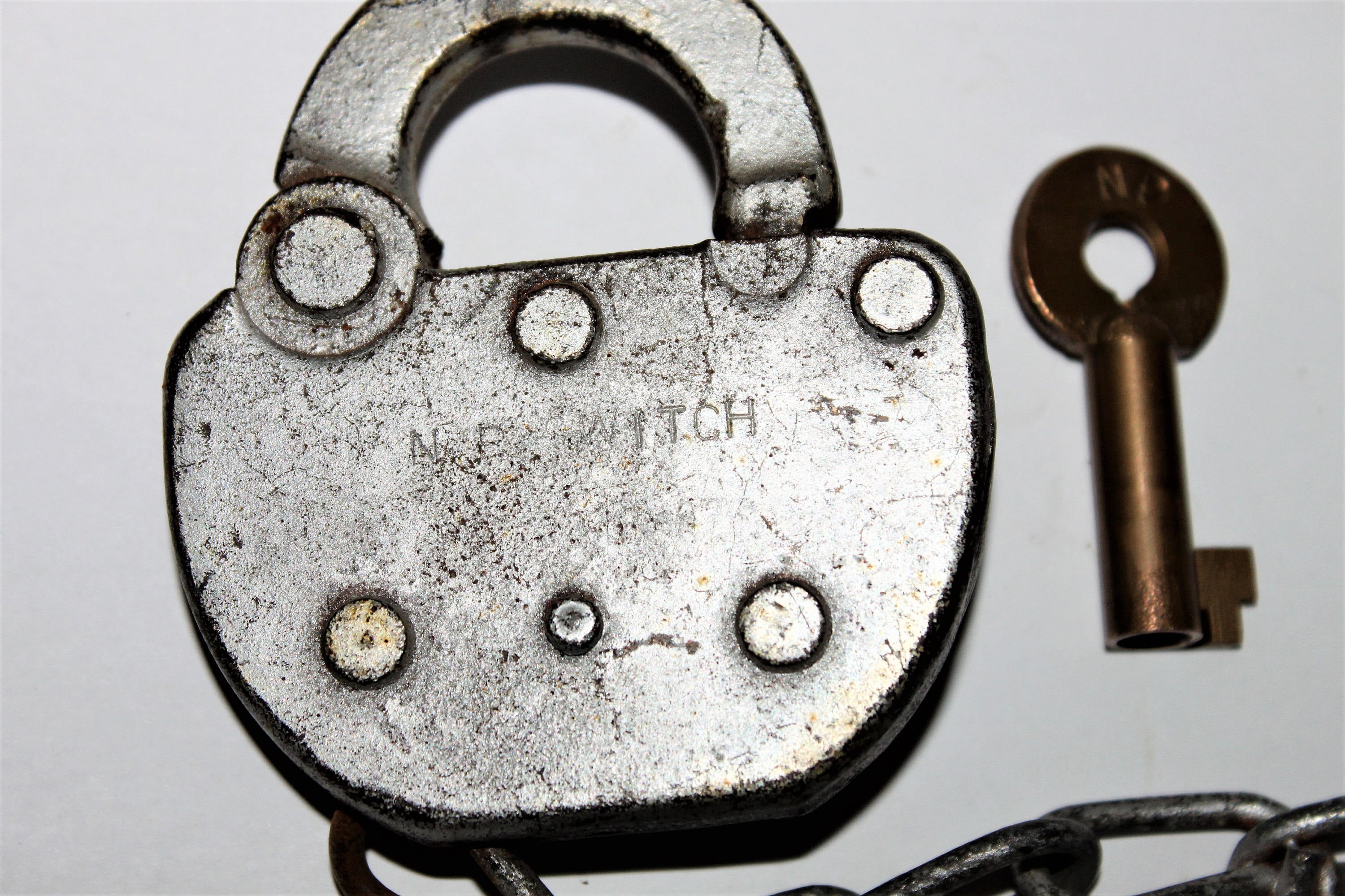 Condition; key-Very Good, lock-surface rust, painted silver.