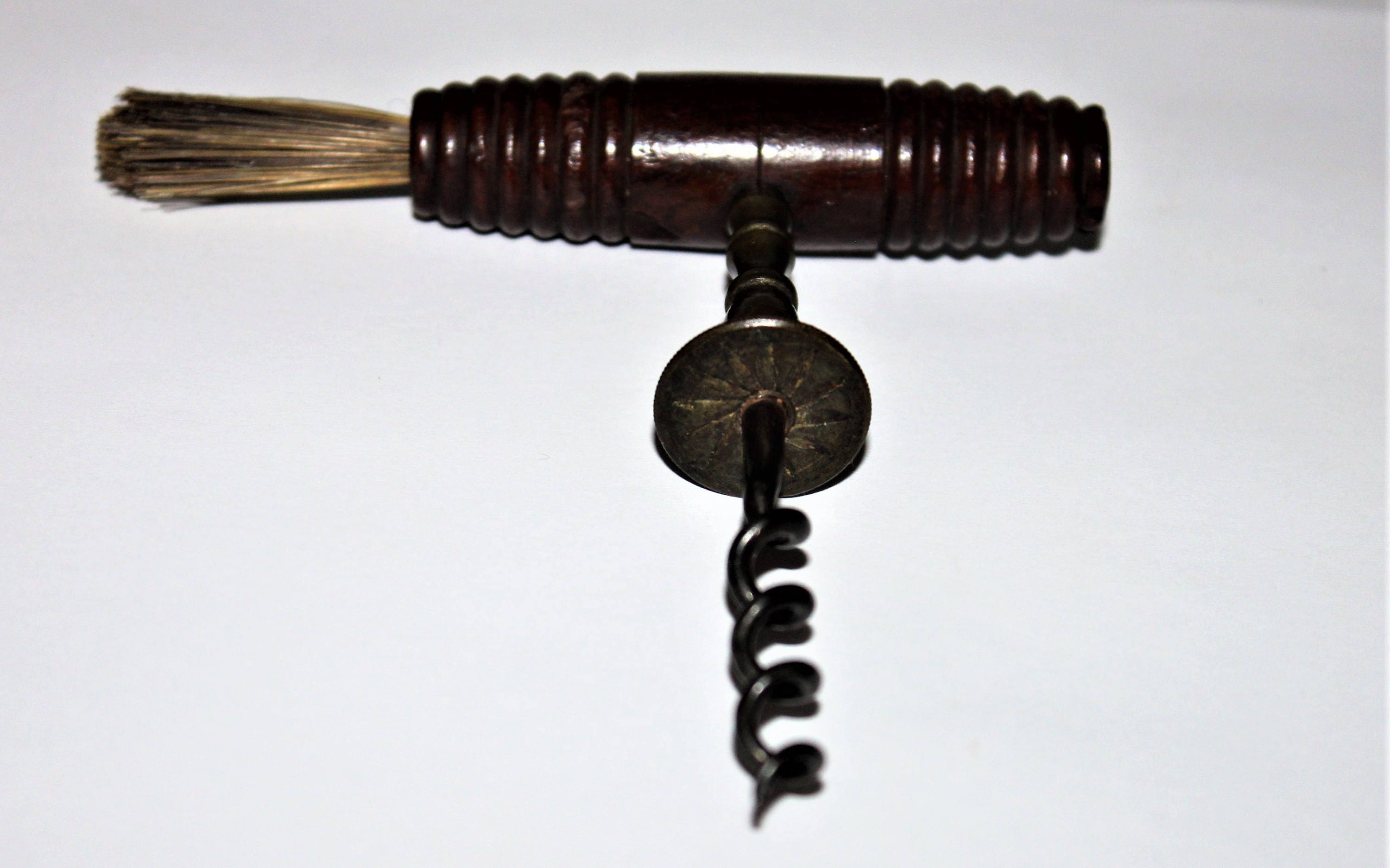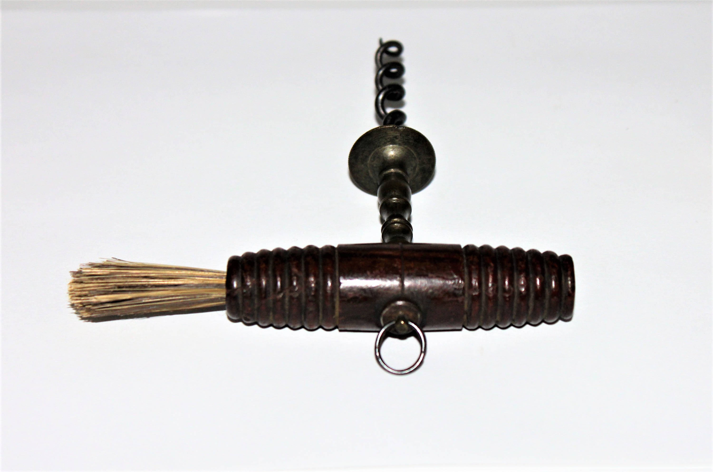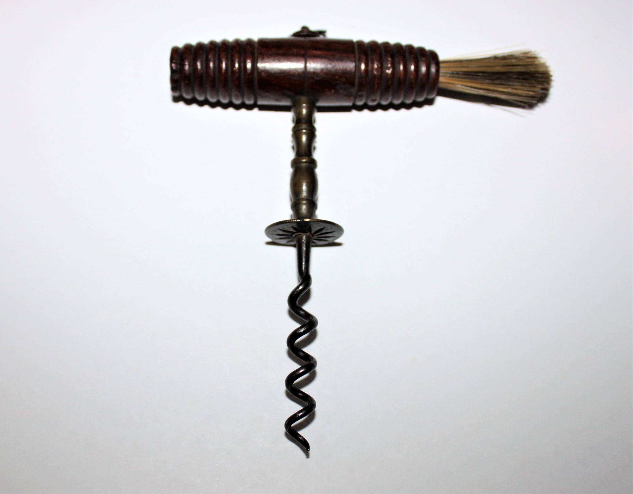 We have for sale an Antique English Brass Corkscrew with Button & Dusting Brush