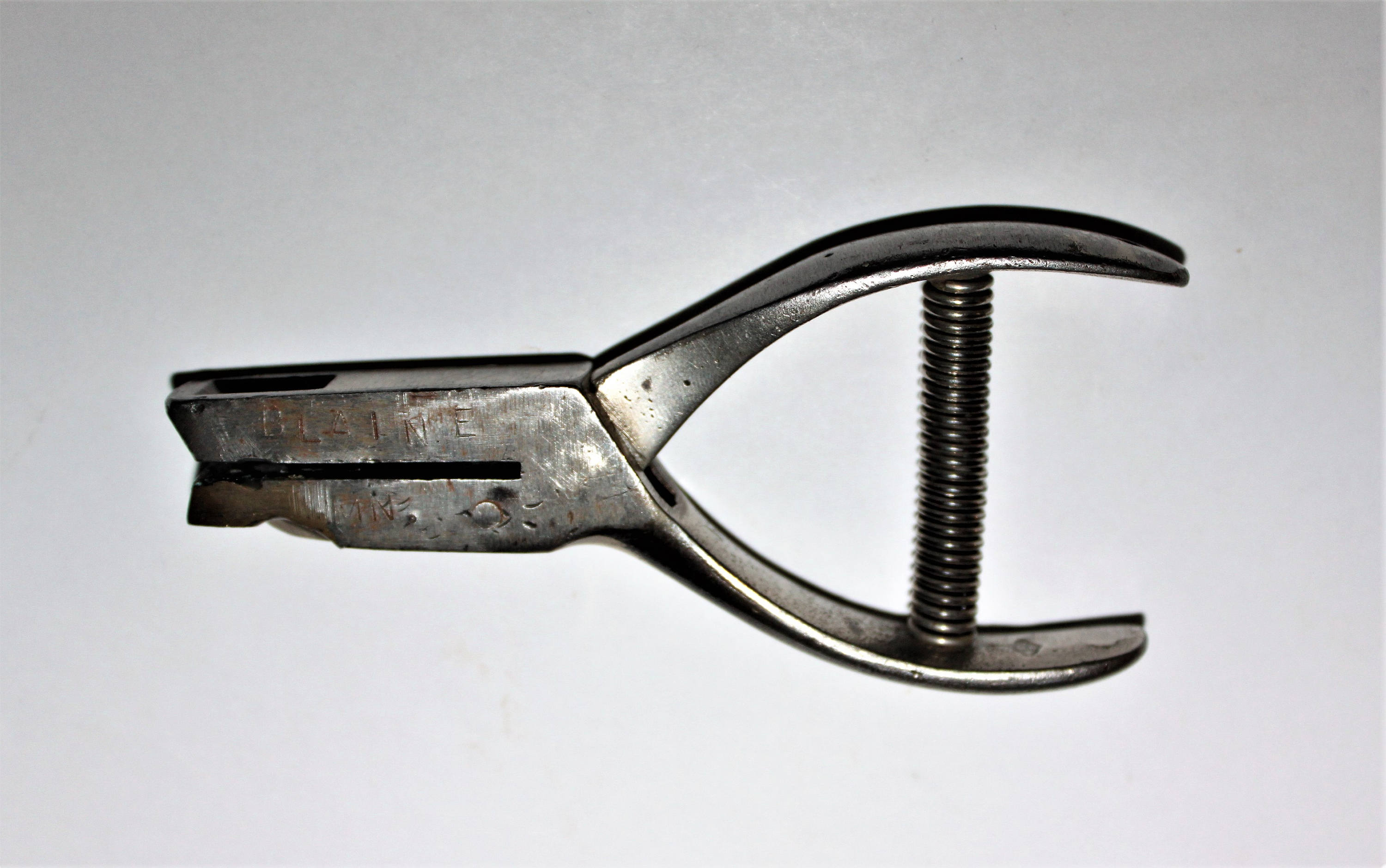 This is an old conductors ticket punch it is stamped with the name Blaine MN and the initials G.P.W. the punch has a 1 ¼” reach and punches a puzzle shaped hole. There is a maker’s mark which is a diamond shape.