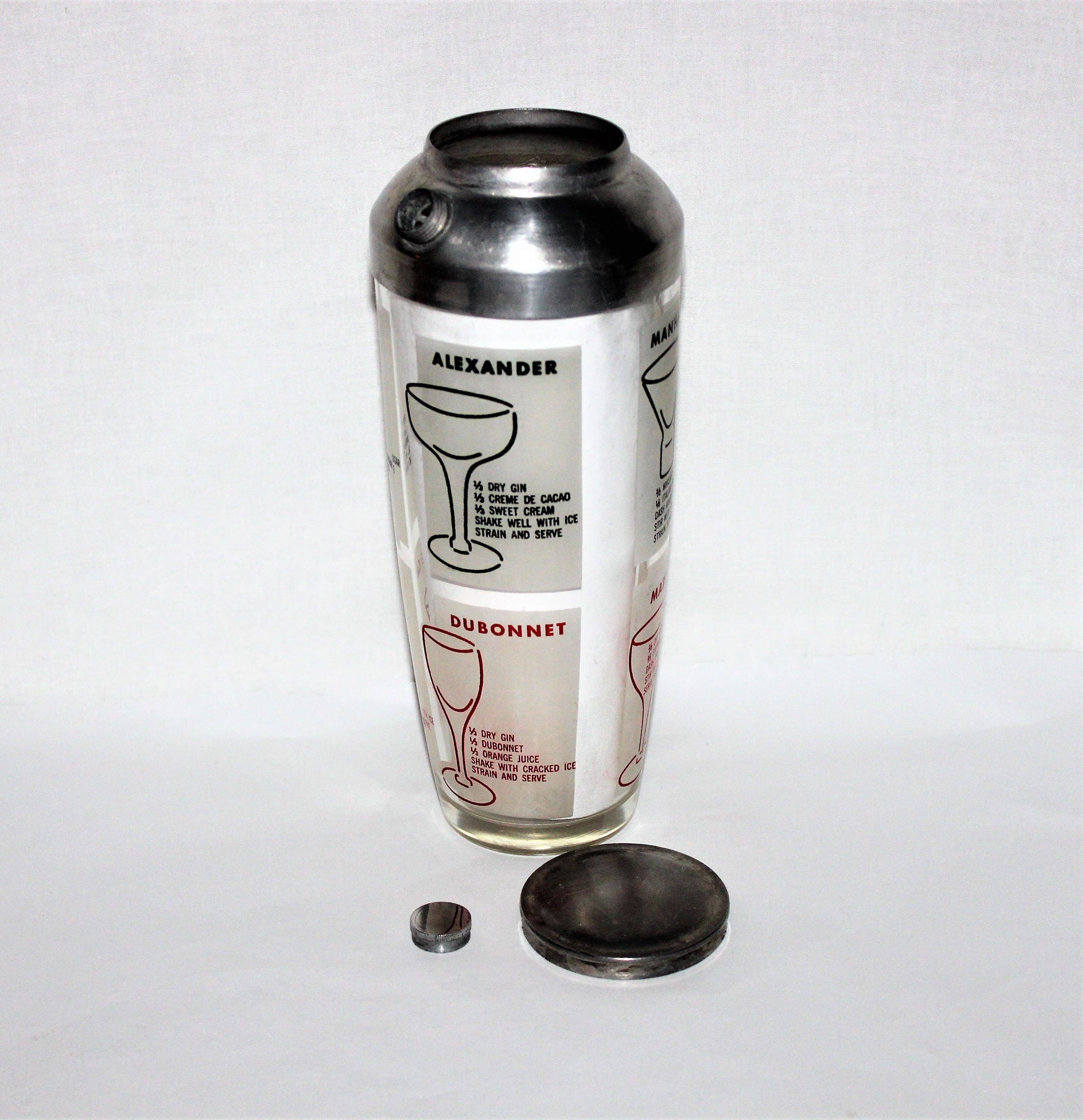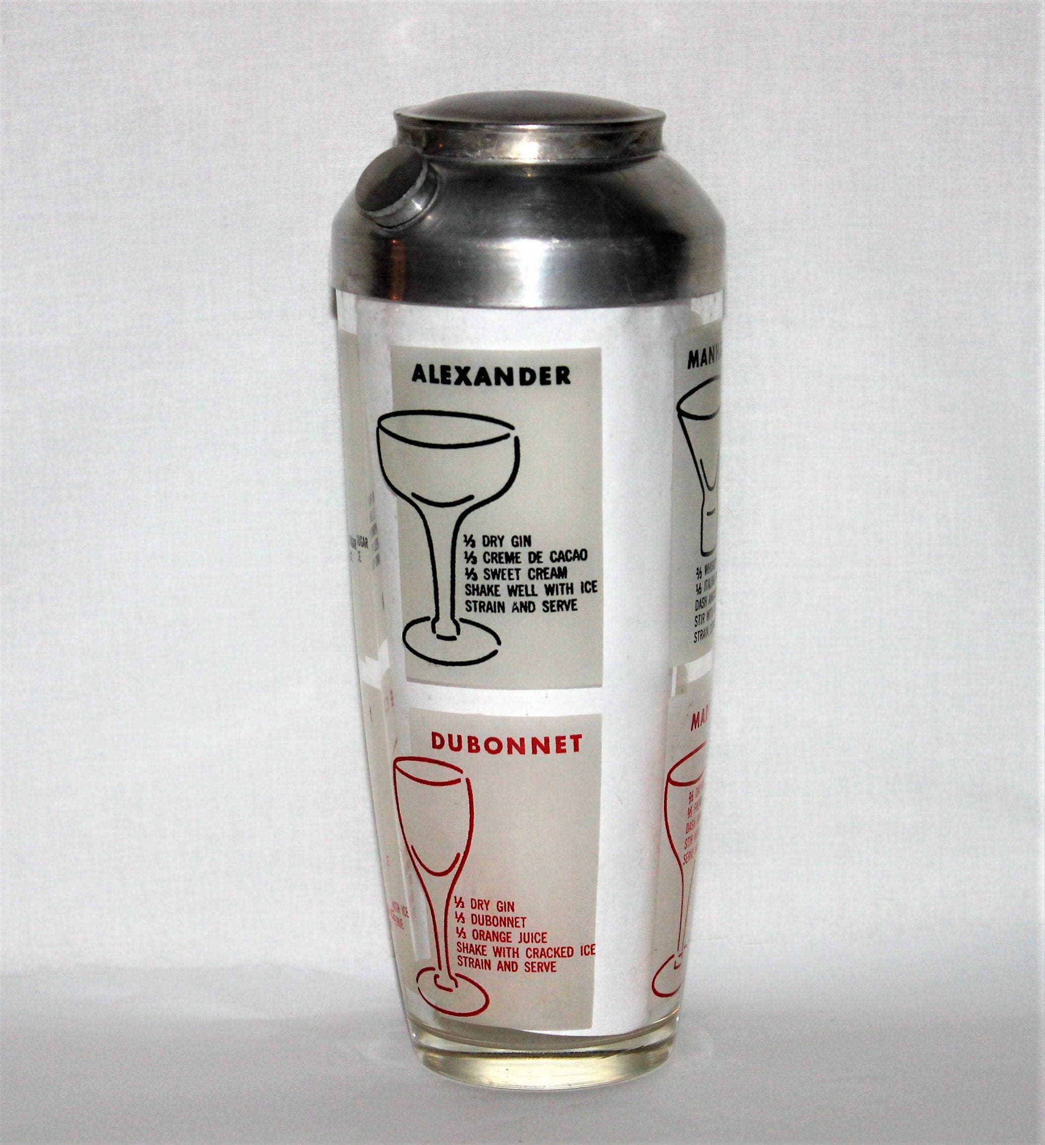 Wonderful Mid-Century Glass Cocktail Shaker with all the hot drink recipes from the 50s printed on the glass. Shaker is glass lid is aluminum