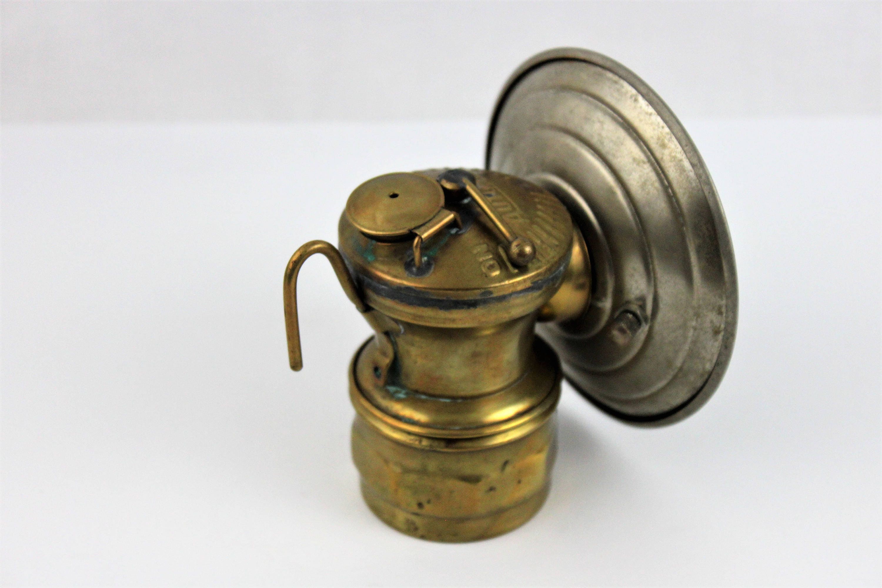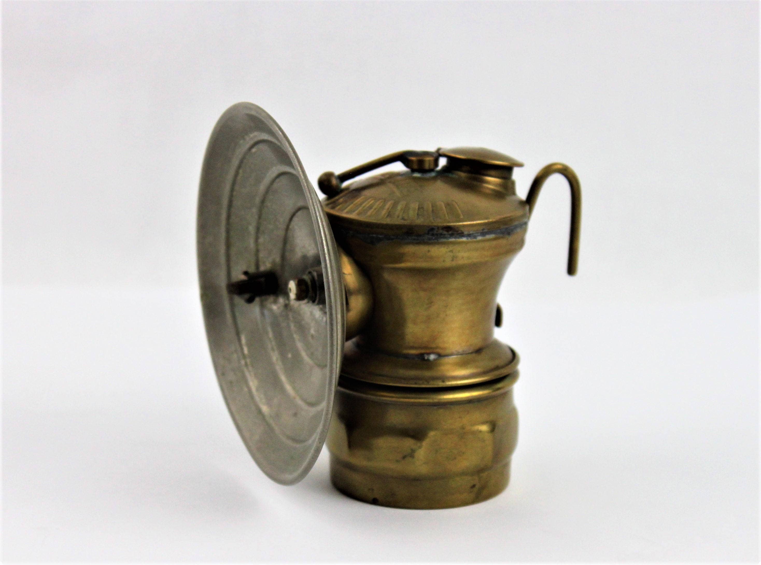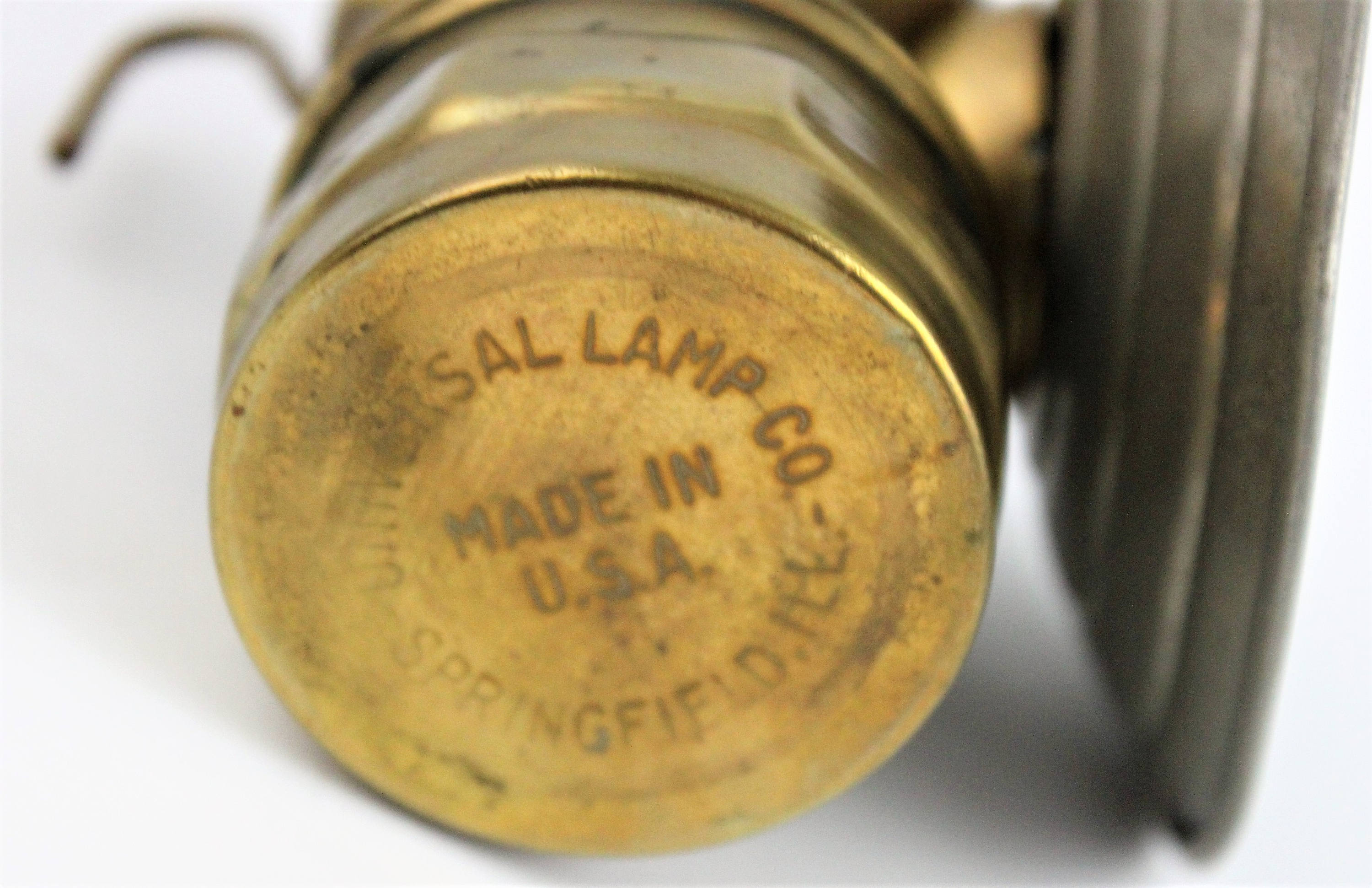 Heyday of this type of light was from the turn of the century to the 1920’s. These were used in the coal mines for years, they are designed to hang on the front of a miner’s hat. Marked on bottom Made in the USA Universal Lamp Company, Springfield ILL.