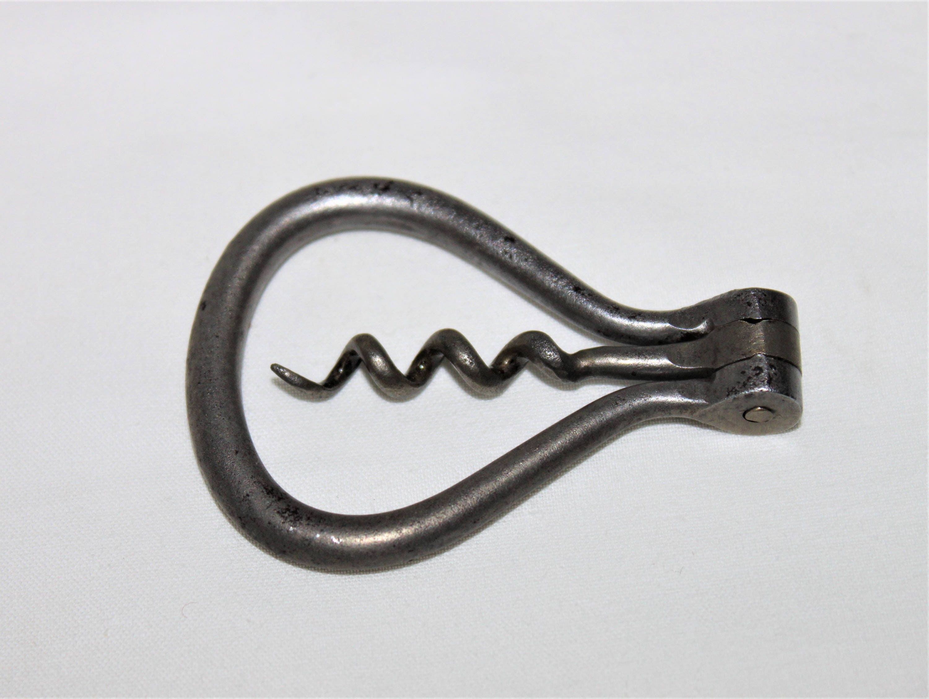 This is a wonderful mid-sized folding corkscrew known as a Bow Corkscrew the perfect size to carry in your pocket or purse the fold out wire worm (screw) is a very sharp and a true helix design. The bow handle is designed from hardened steel the bend in the steel acts as a tension spring holding the worn in place as you pivot the worm the tension locks it in place holding it firmly for storage or use.
