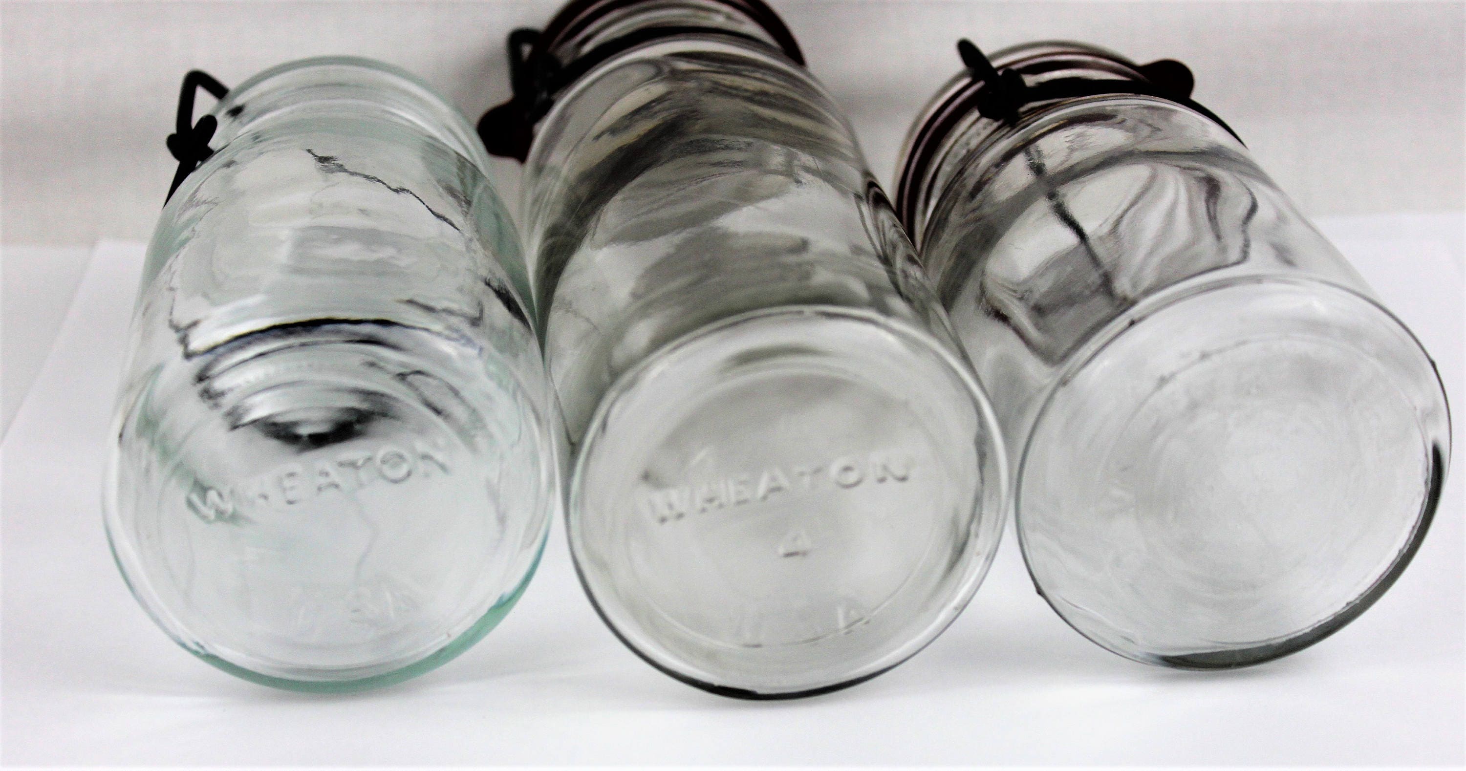 These are industrial laboratory storage jars with glass lids and wire bails we have two Wheaton Jars 1-7 1/5” tall, 1-5 ½” tall & one Kimble jar 5 ½” tall