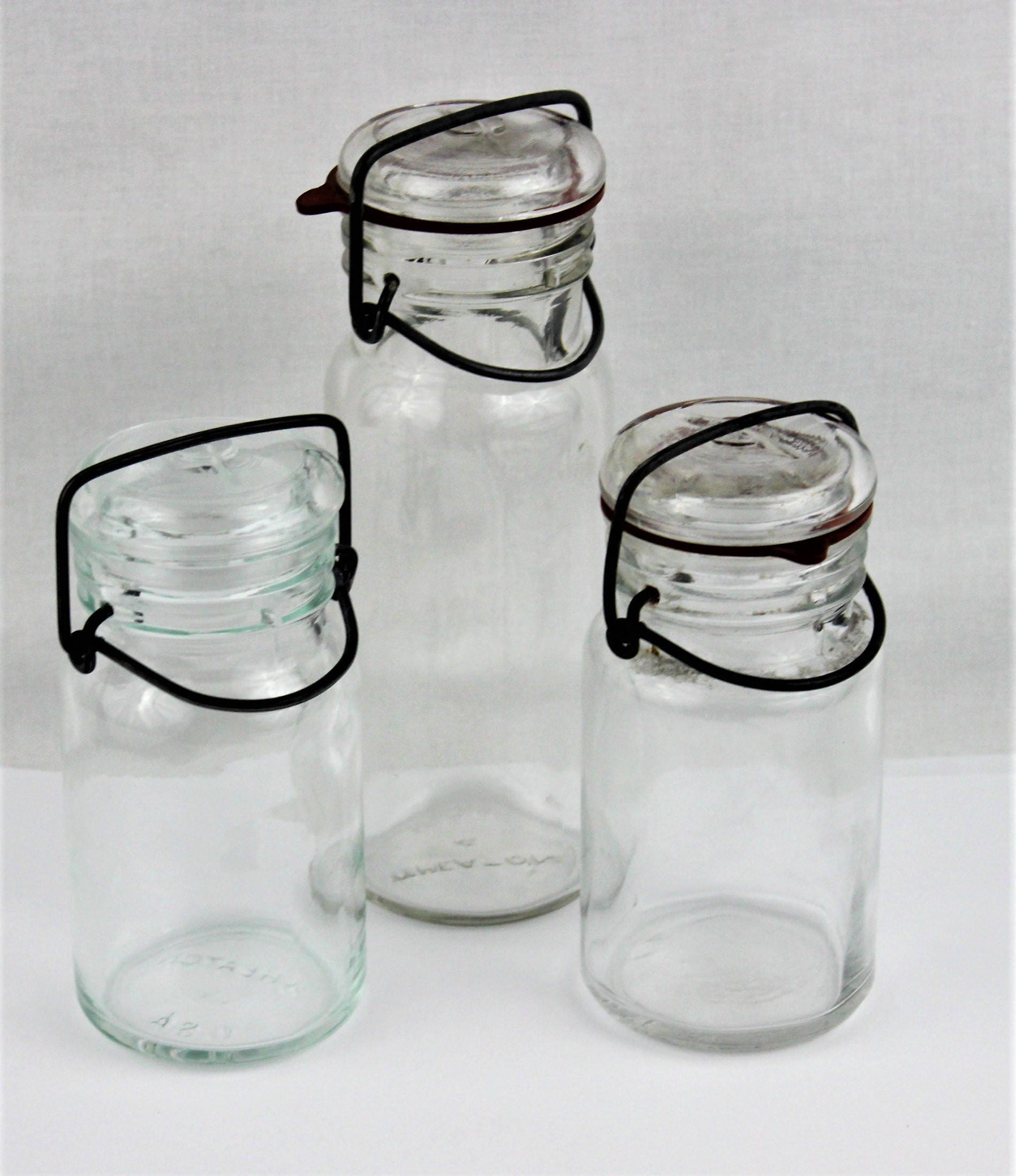 We have for sale Three Vintage Clear Glass Storage Bottle with Glass Lids and Wire Bails Wheaton & Kimble