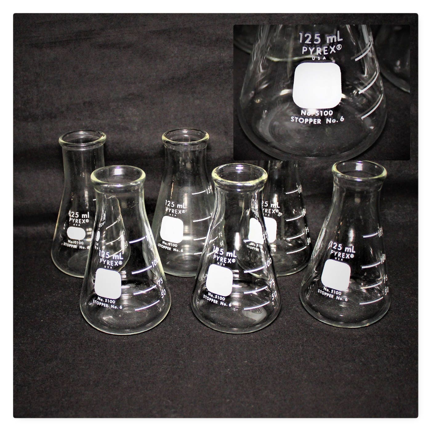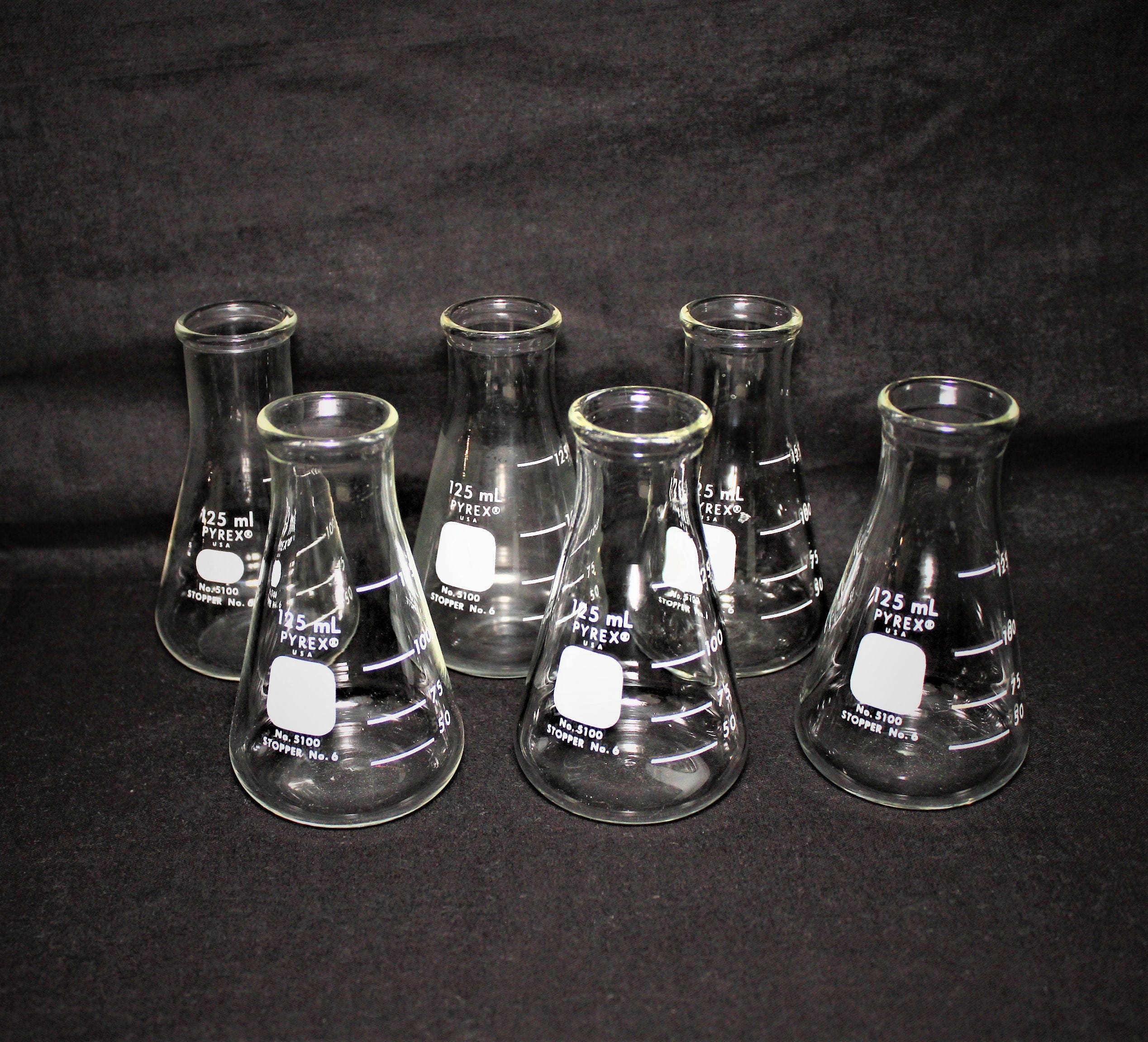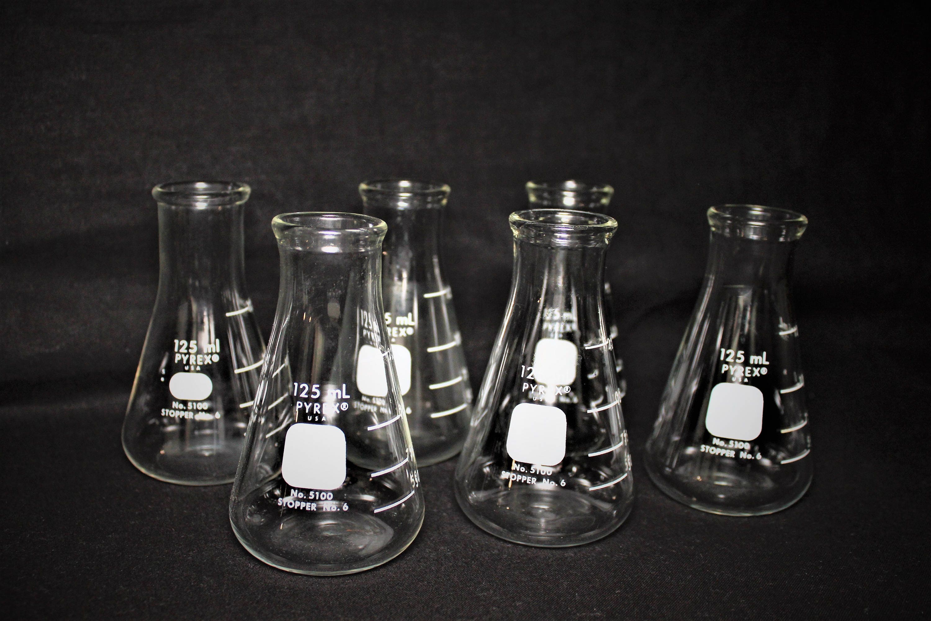 We have for sale a lot of Six #5100 125ml Pyrex Erlenmeyer Flasks