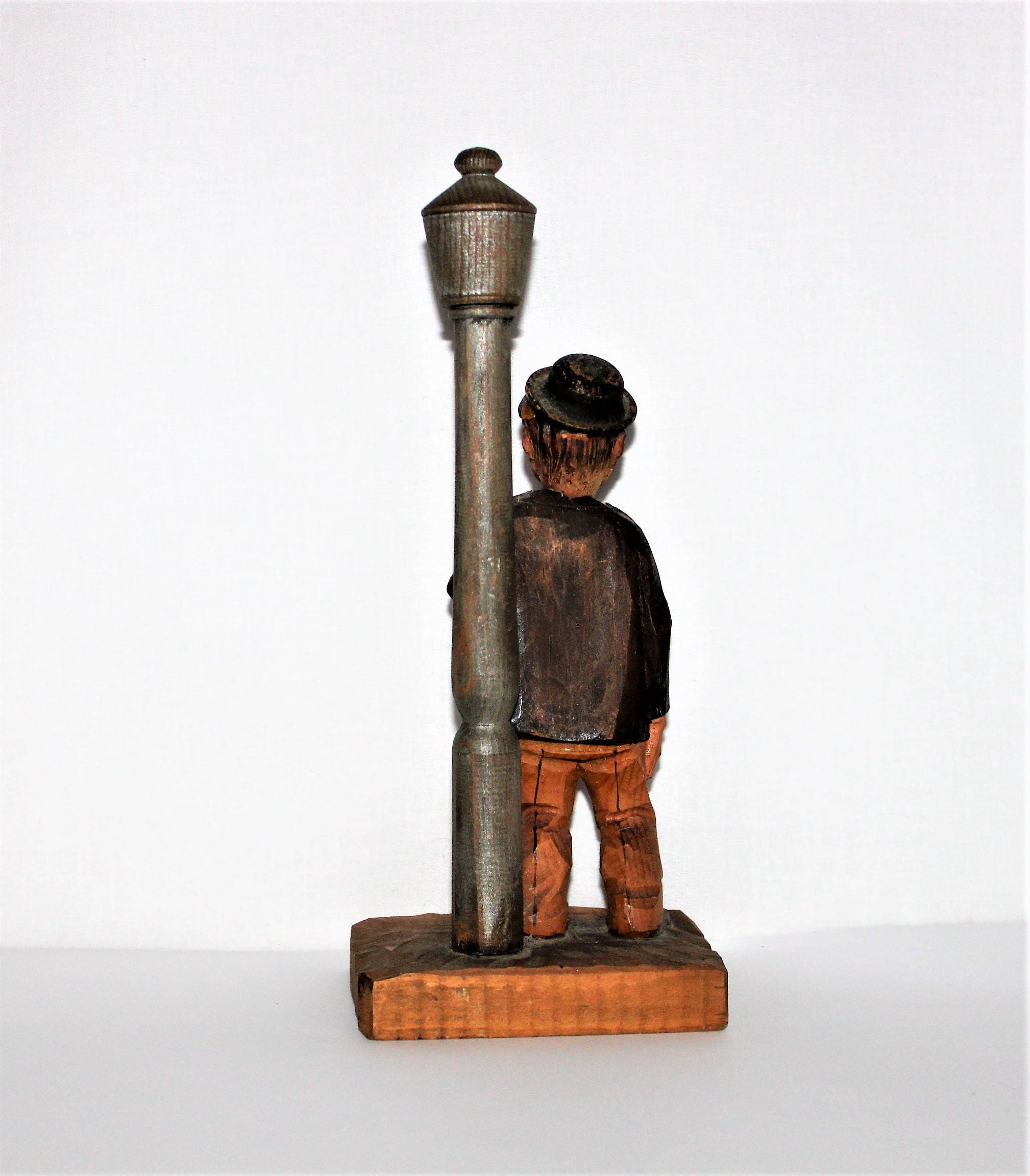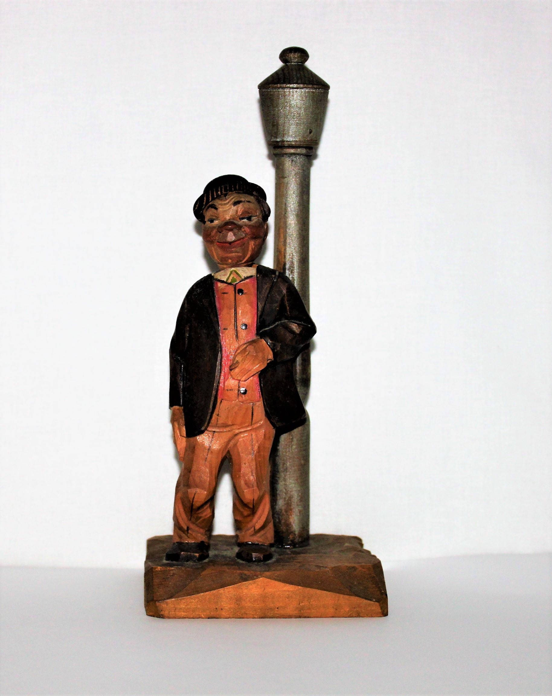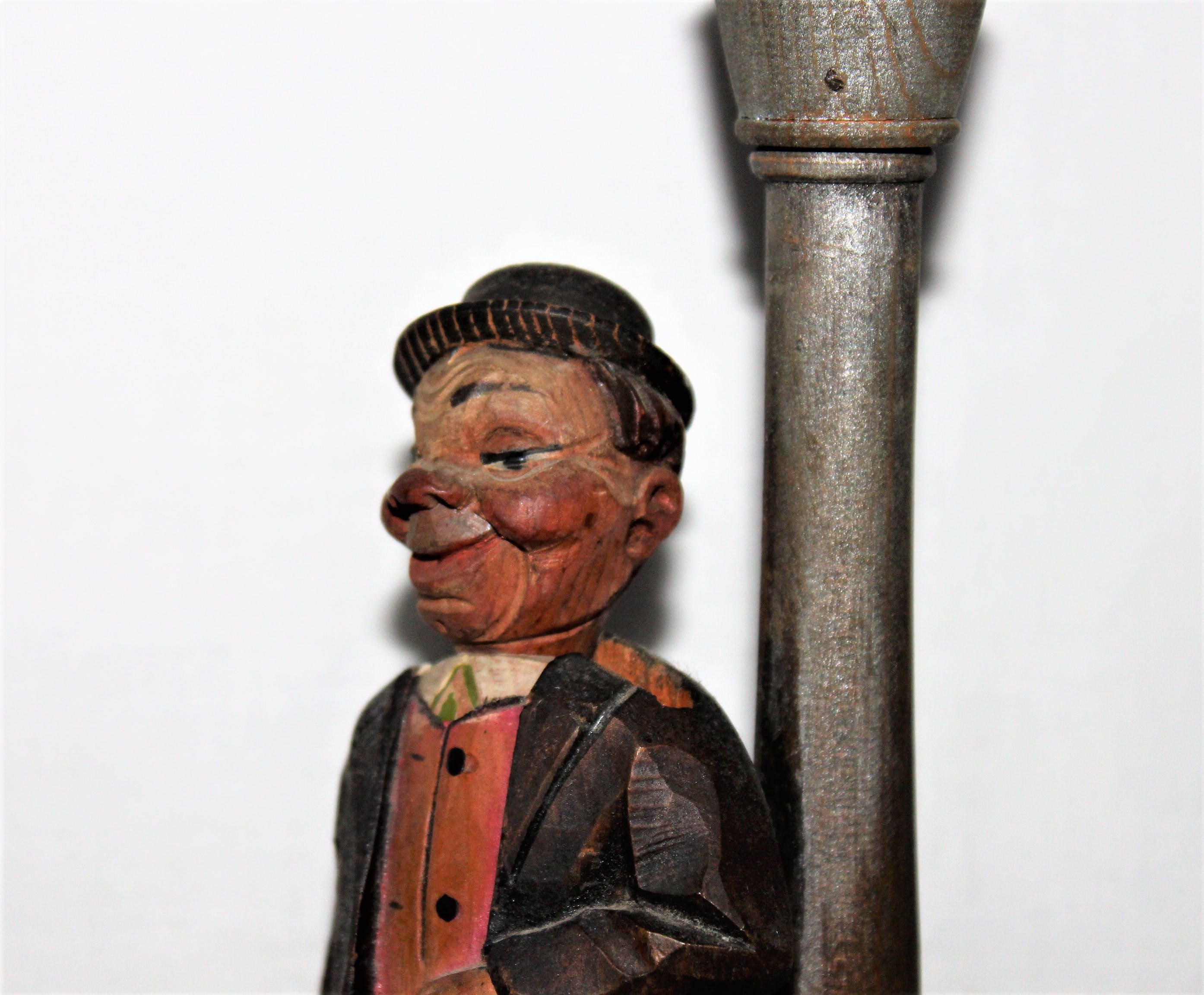Beautiful and highly collectible Anri wood carvings have been around for over 110 years hand carved and painted. This set is of a chipper fellow who may have had a few to many, the detail of the carving is wonderful with his facial features right down to the cigarette in his hand the lamp post has a hidden corkscrew and lift the mans head to reveal a bottle opener.
