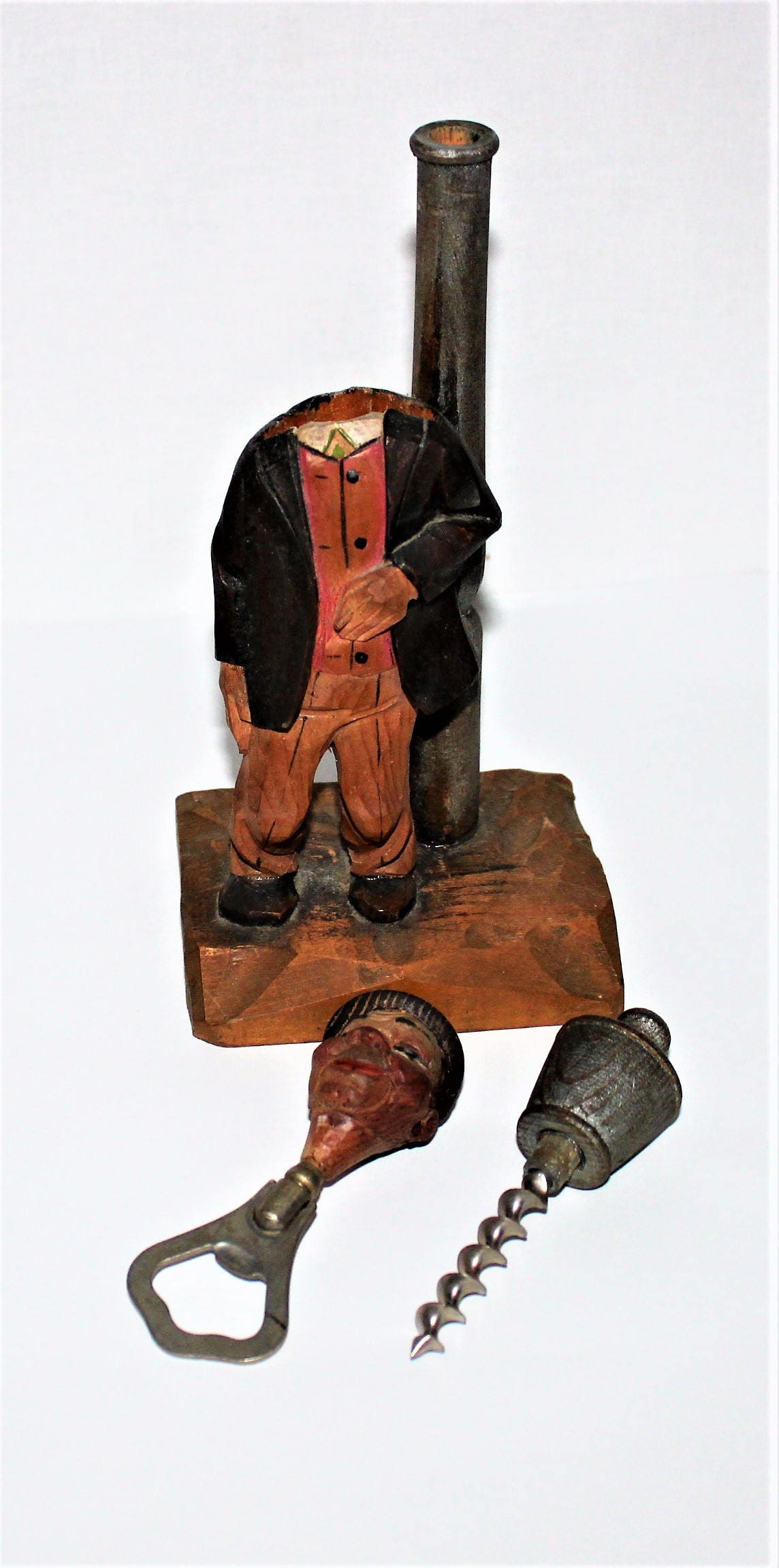 We have for sale a Vintage 1930s Hand Carved & Hand Painted Anri Wood Figural Barware Set, Corkscrew & Bottle Opener