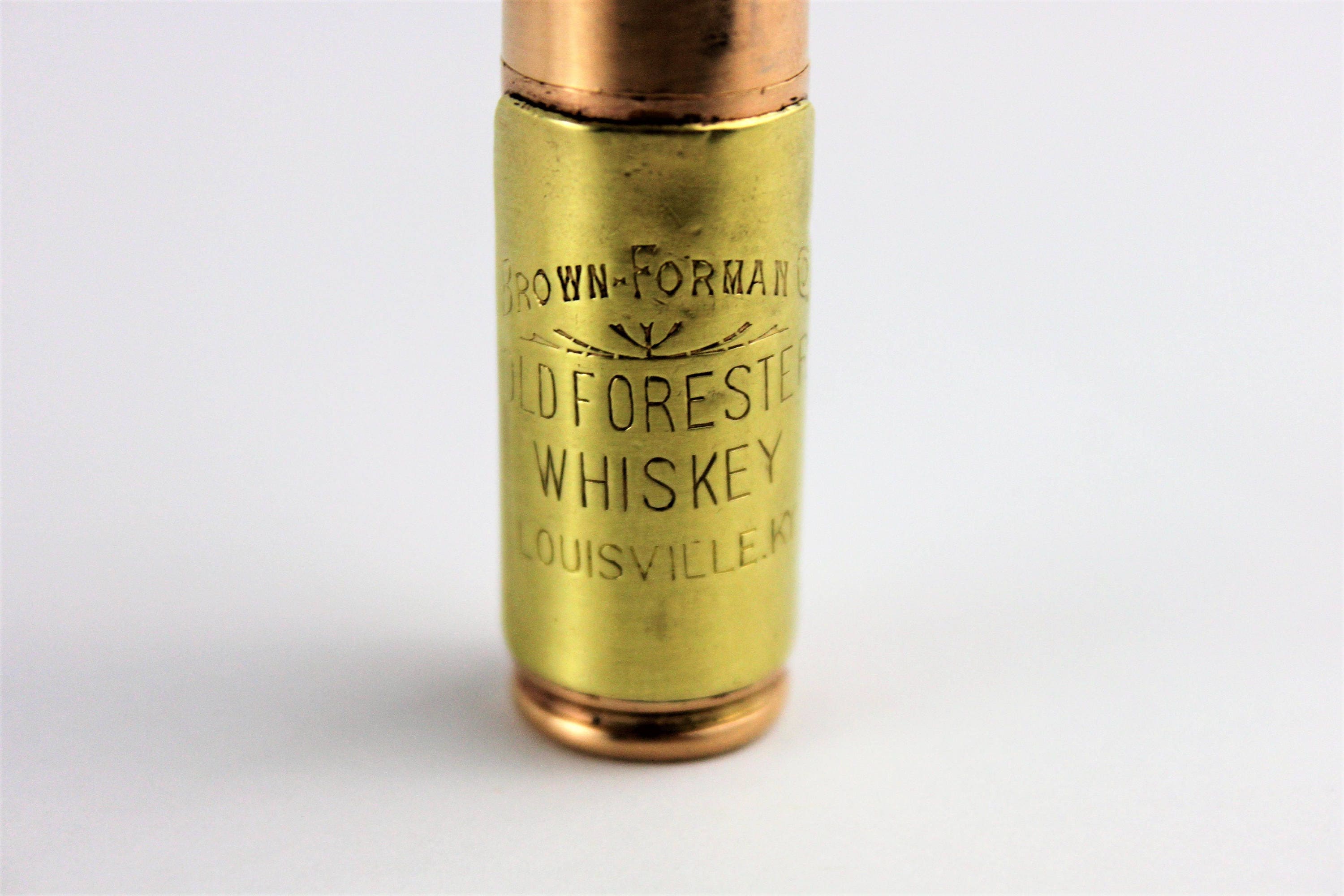 We have for sale an Antique Brass Bullet with Hidden Corkscrew Advertising Brown-Forman Old Forester Whiskey of Louisville, KY.