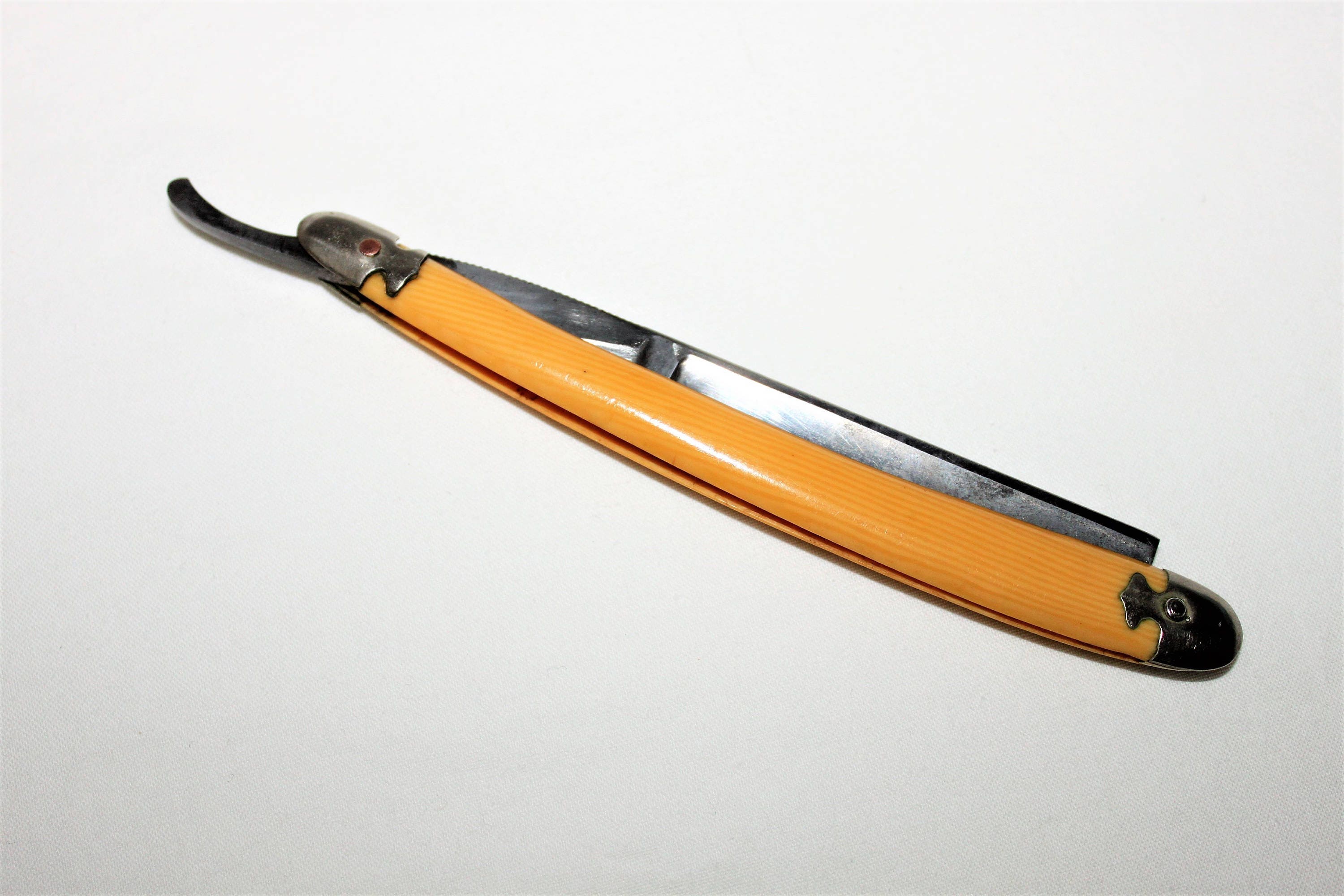 Wonderful George Wostenholm & Son Straight Razor having a square point, 5/8 Full Hollow blade with upper & lower Jimps on the shank (grooves to help grasp the razor while shaving) with original capped Celluloid Scales.