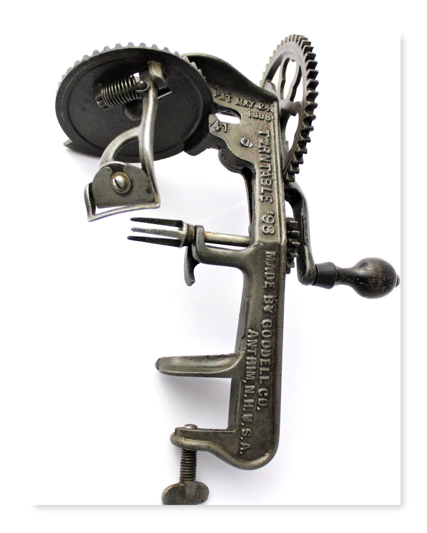 Wonderful piece of Americana History this cast-iron Goodell Company apple peeler is designed to clamp onto your countertop or table. Fully automatic peeler you insert your apple onto the holder crank the handle and as the apple turns it is peeled then the blade raises, and the apple is automatically pushed off the holder. Tested and is fully functional, cutting blade needs sharpening. Clamp opening capacity is 1.125”