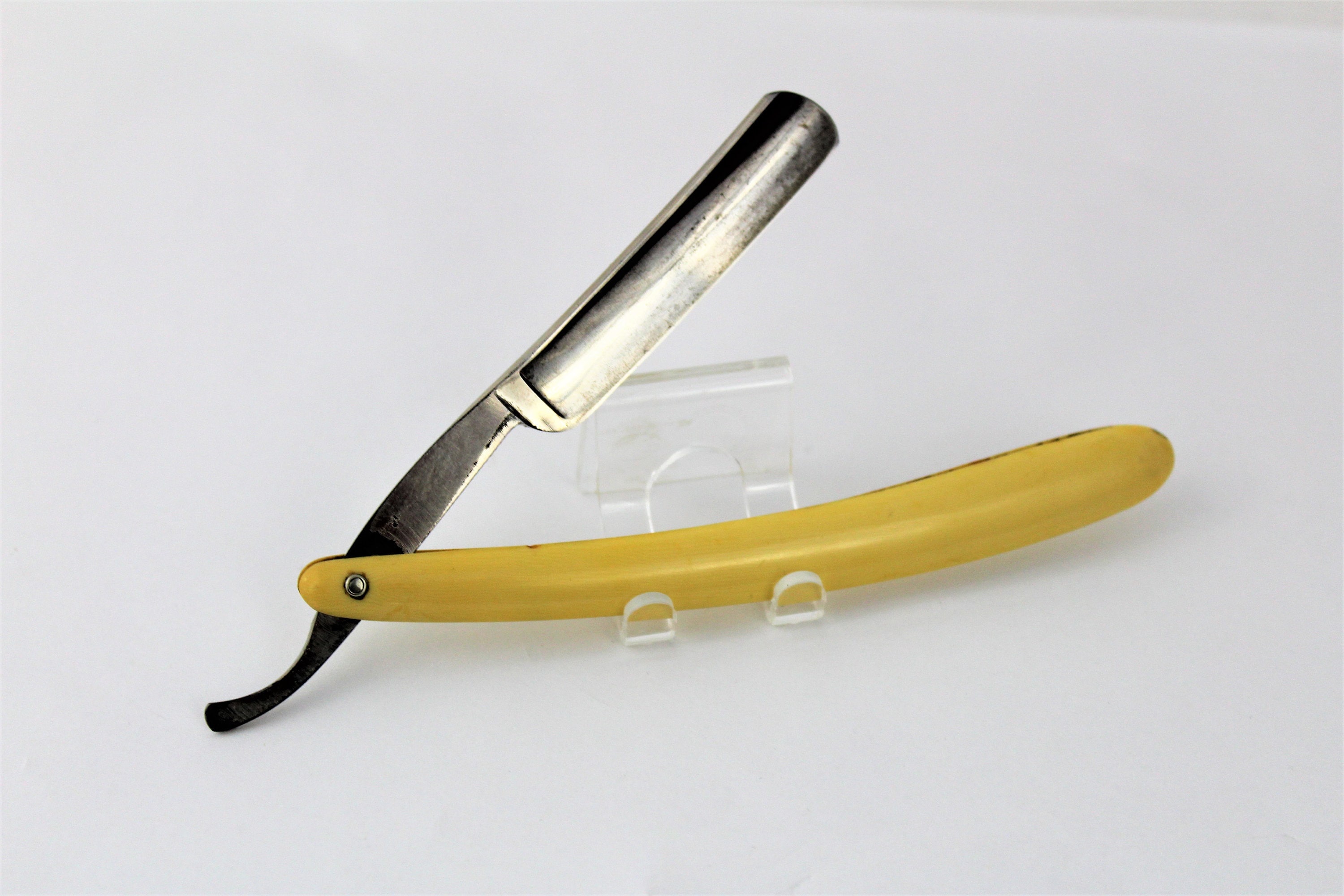 Wonderful 1900s Clauss Straight Razor, 9/16 Full Hollow blade with original Celluloid Scales. Comes with a partial box.