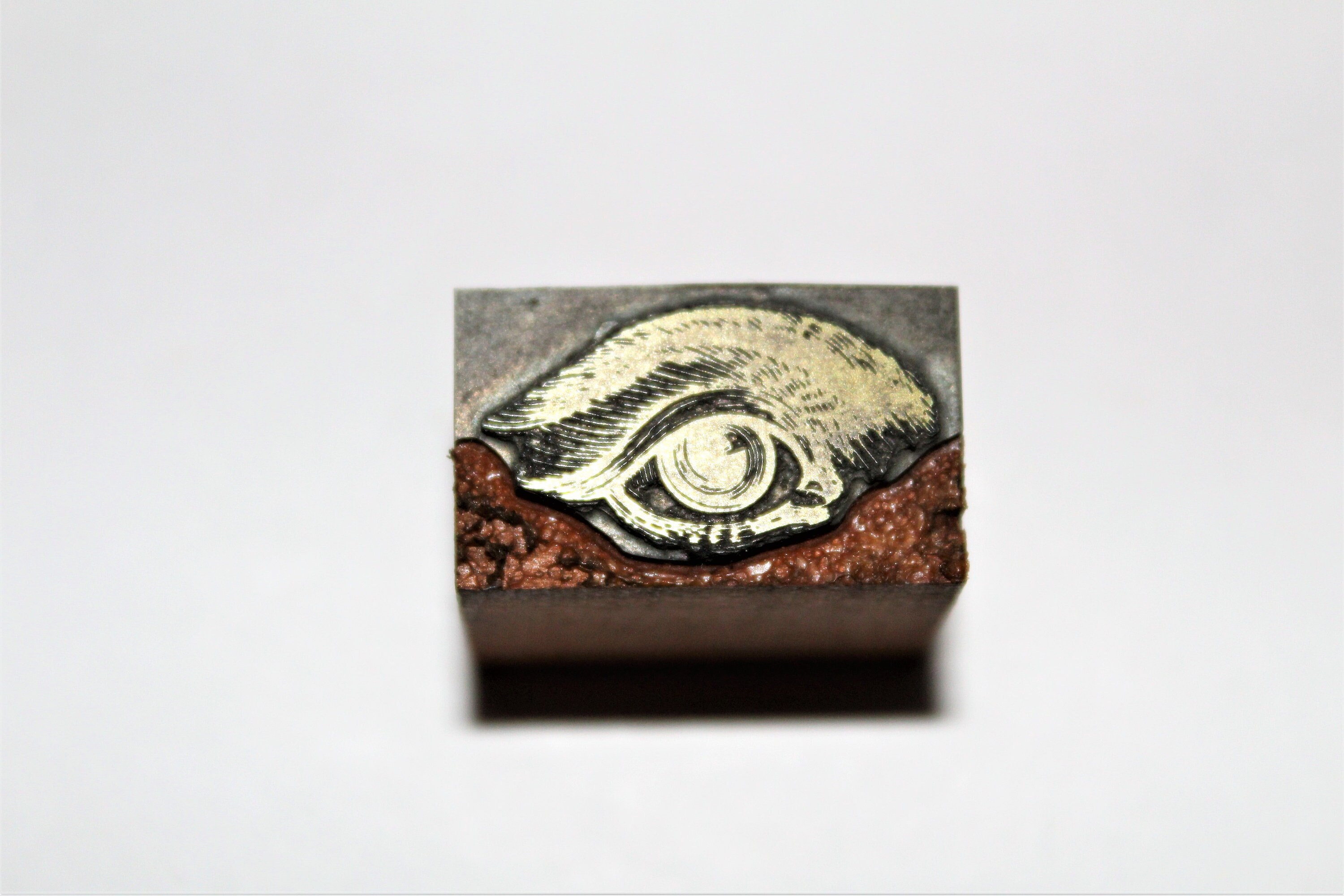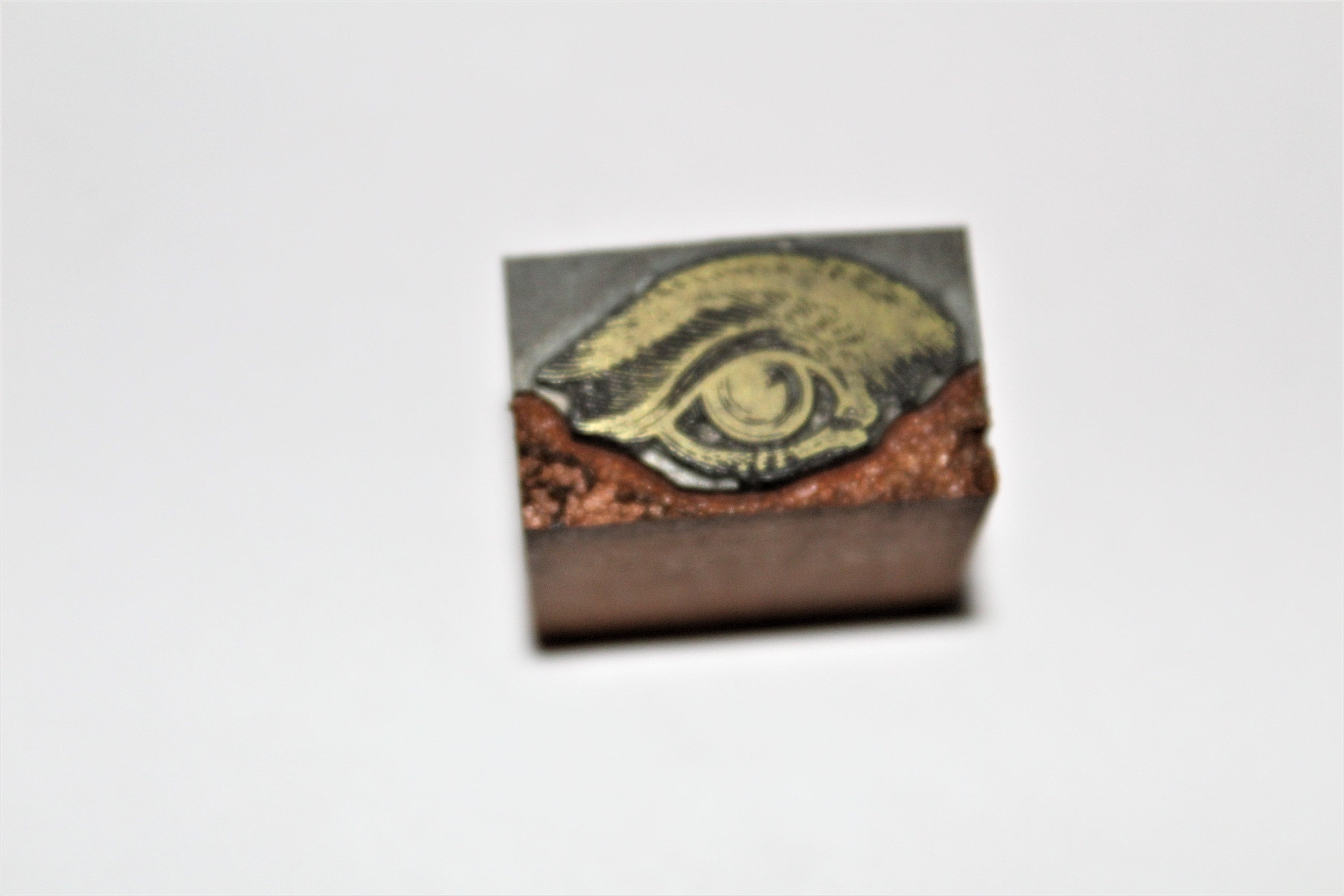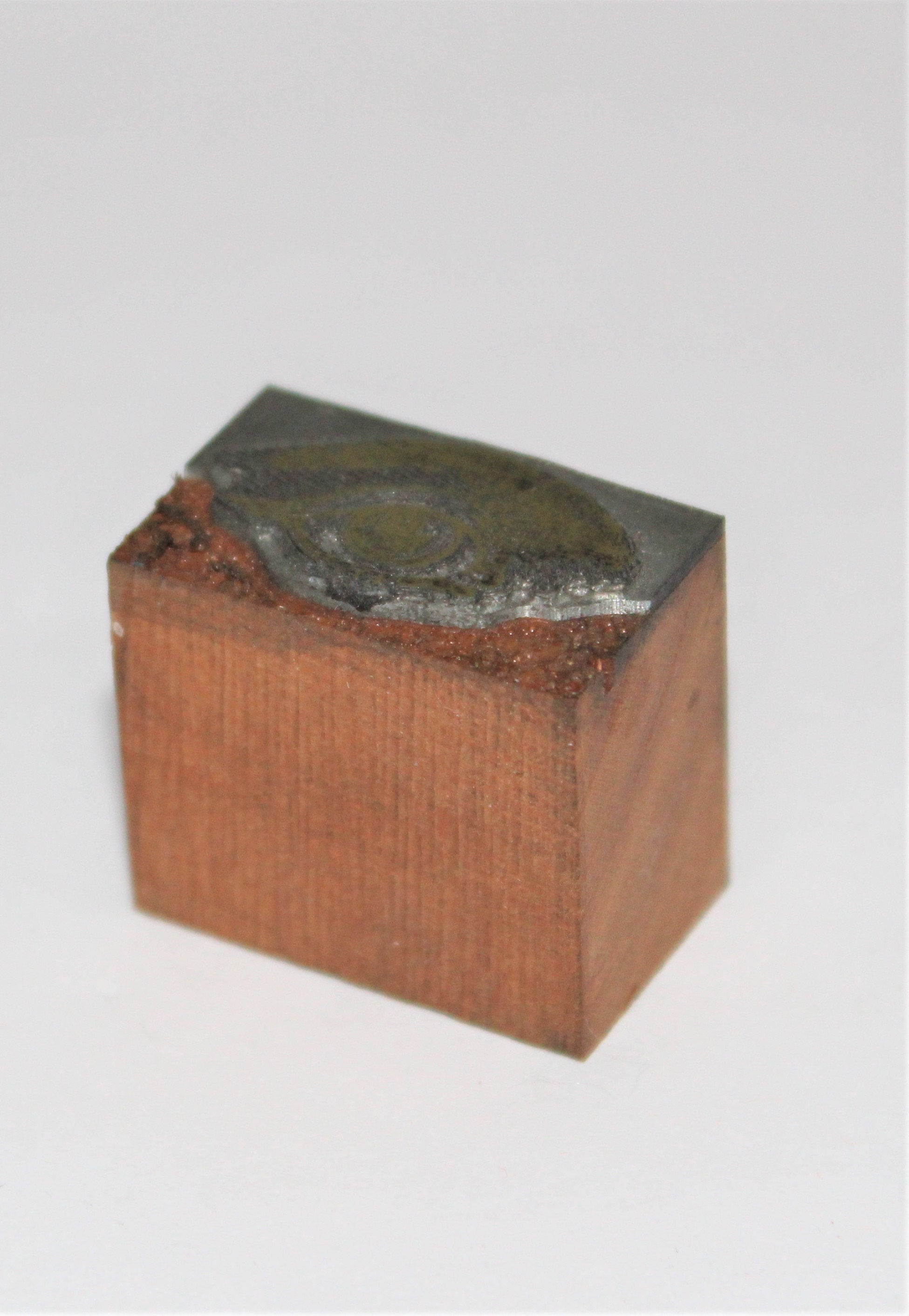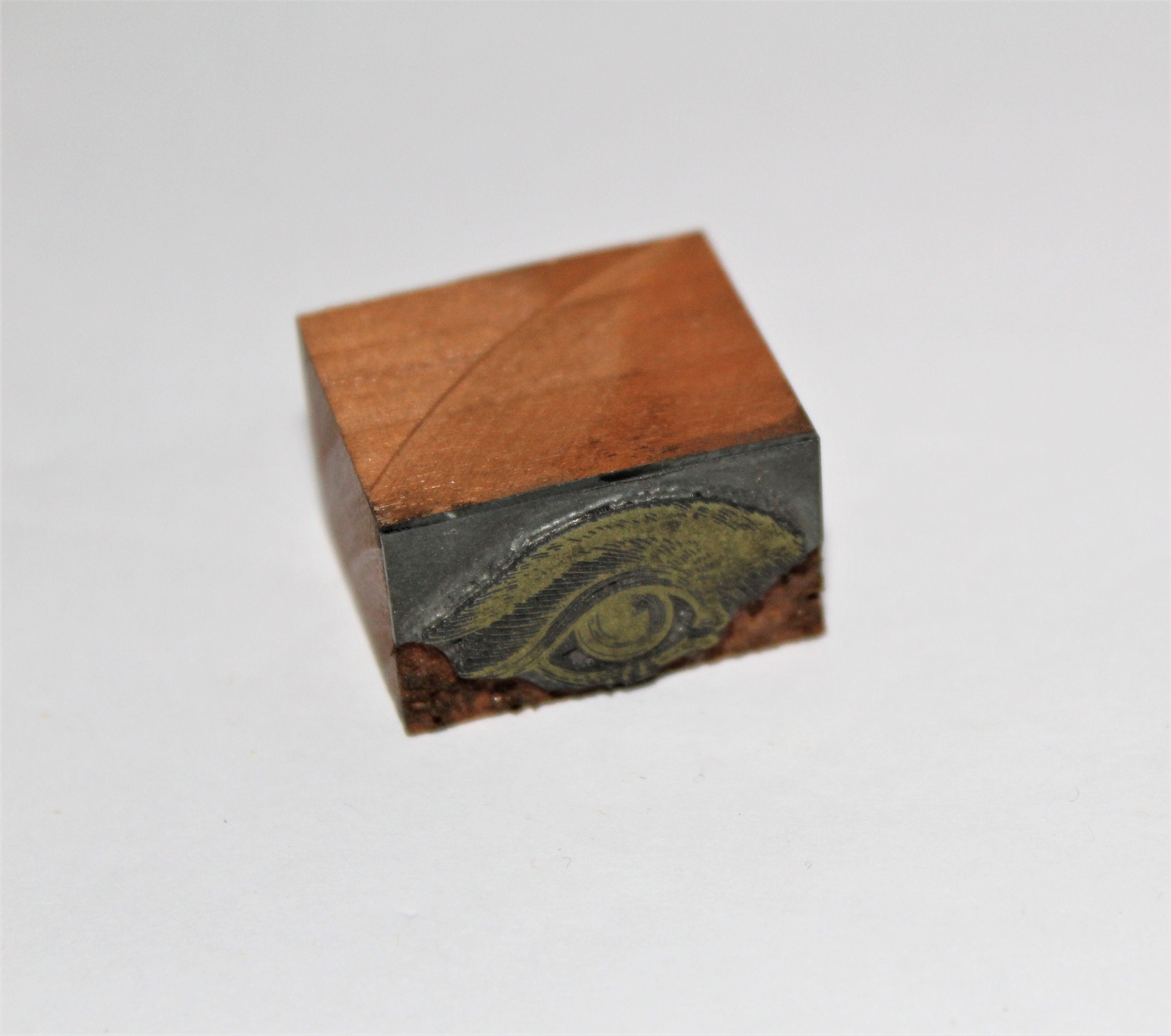 Interesting little brass printer’s block it appears to be the Eye of Rah or just a regular eye. It is a wooden bock with brass print head. I have had this for a few years it was in an 1886 printer’s cabinet