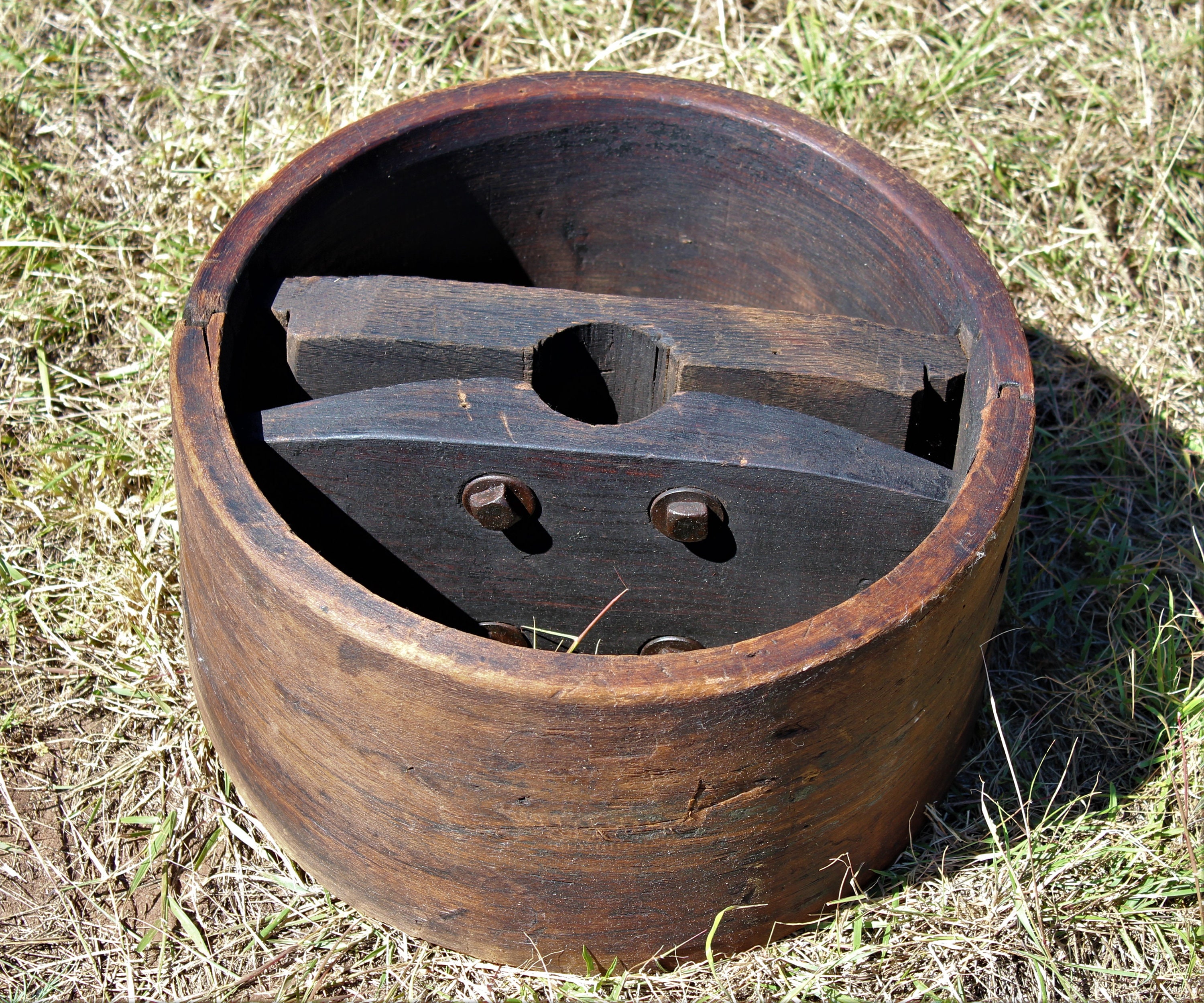 Wonderful Industrial Décor piece. An antique Split Pulley Wheel it measures 17” diameter and 8 ¼” wide with a 2 ¾” center bore. The pulley is made up of two curved pieces of hardwood and center wood clamp with steel bolts to clamp the wheel to the motor that ran it.