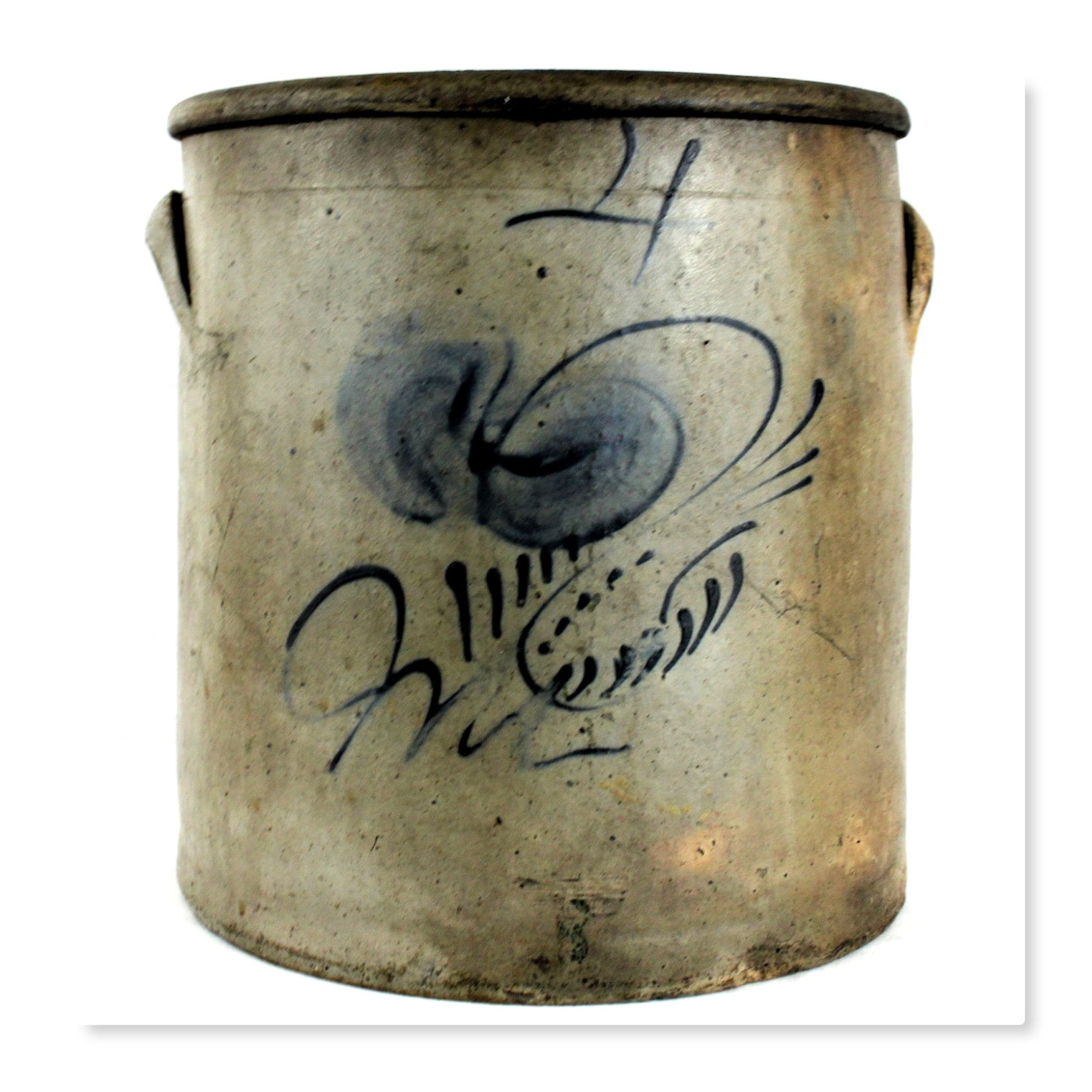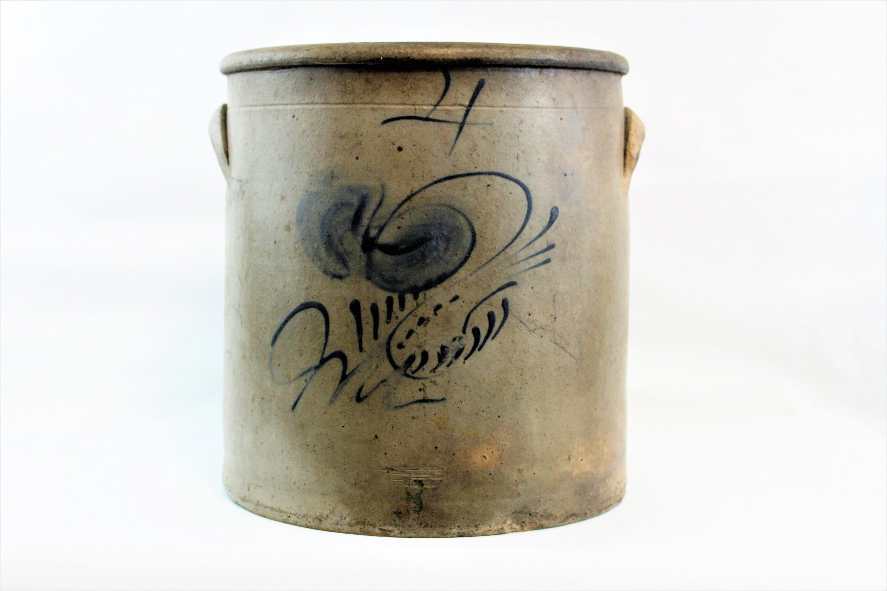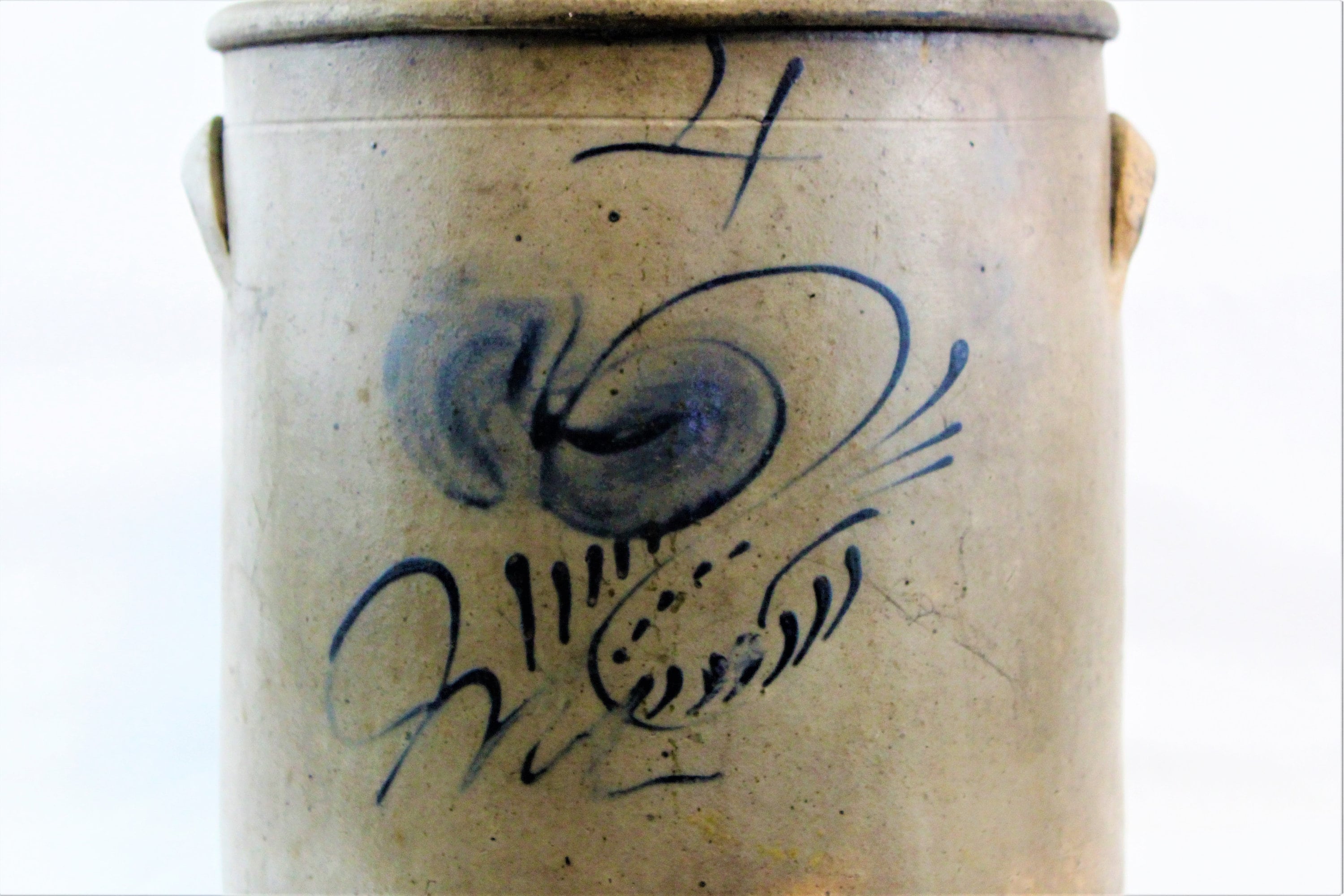 Beautiful Circa 1800-1850s Four Gallon Crock. Untouched for over 160 years. We have contacted the Crock Guru’s on this one and all conclude it is a early 1800s to 1850s piece. Union Pottery /Red Wing was ruled out, Appleton / Eastern Wisconsin is a maybe, Eastern Ohio / Illinois is a possible, but we believe it is more an Eastern / Pennsylvania piece. The cobalt blue is such a beautiful design we have spent weeks researching and looking over the internet for even a close example without a resolution. If you have seen one with a close design pattern please contact us, thank you.