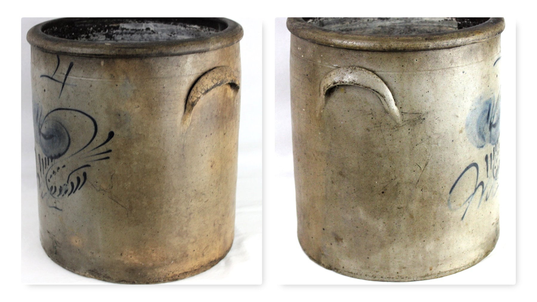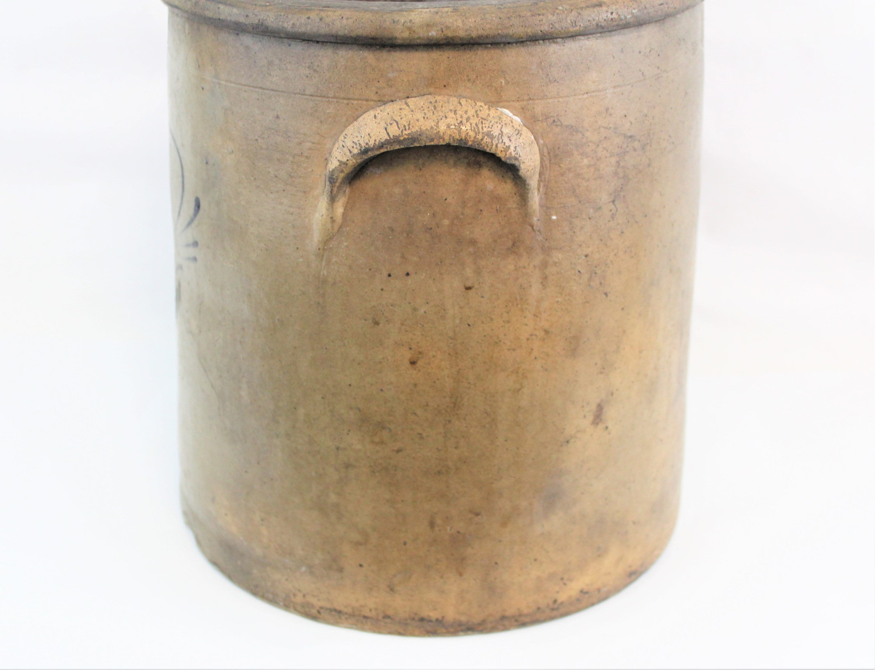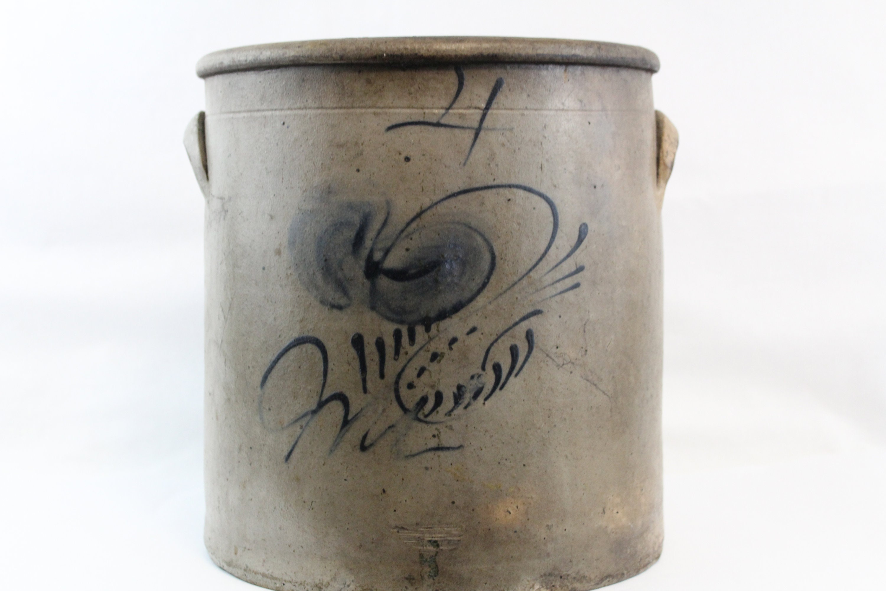 Beautiful Circa 1800-1850s Four Gallon Crock. Untouched for over 160 years. We have contacted the Crock Guru’s on this one and all conclude it is a early 1800s to 1850s piece. Union Pottery /Red Wing was ruled out, Appleton / Eastern Wisconsin is a maybe, Eastern Ohio / Illinois is a possible, but we believe it is more an Eastern / Pennsylvania piece. The cobalt blue is such a beautiful design we have spent weeks researching and looking over the internet for even a close example without a resolution. If you have seen one with a close design pattern please contact us, thank you.